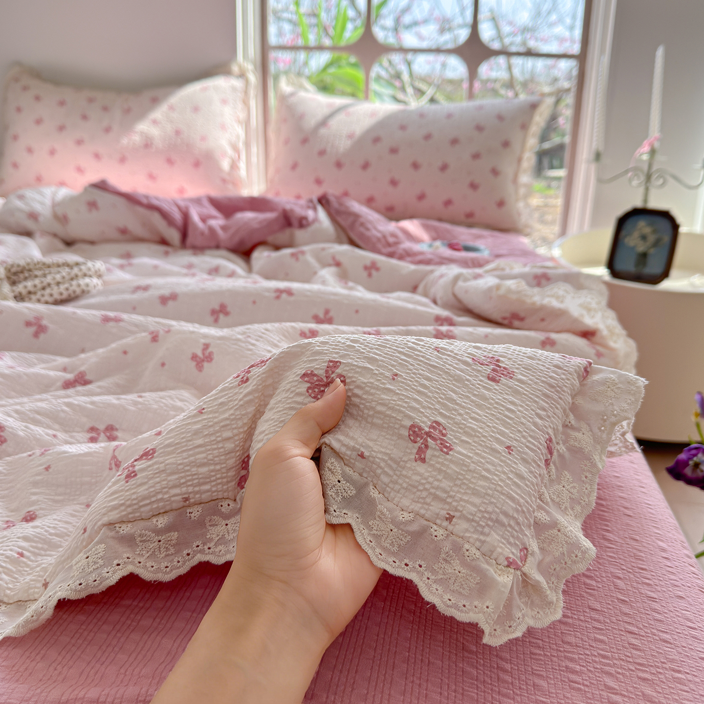 竹合家纺 2026新品泡芙纱夏被四件套全棉镂空花边泡泡皱皱纱夏凉被 海棠未眠