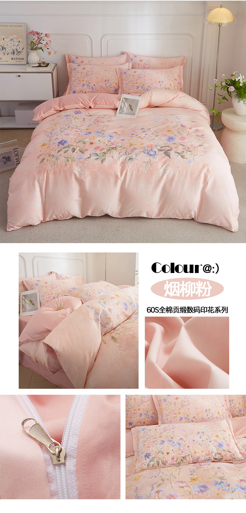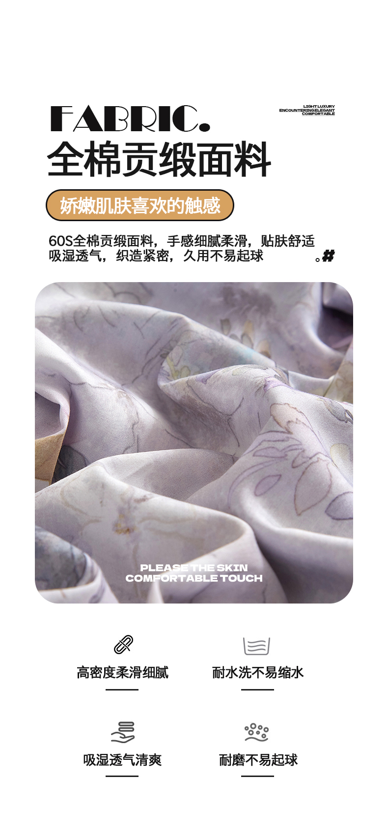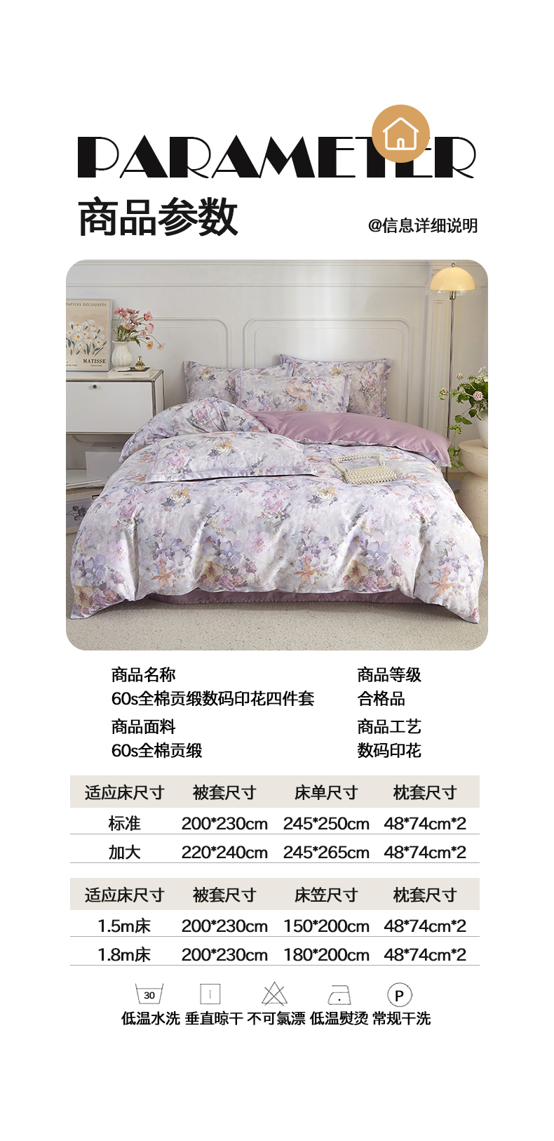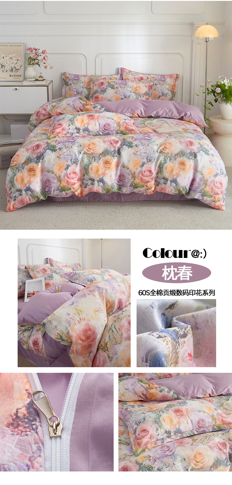 当前位置: 91家纺网 > 商品网购 > 床品套件 > 四件套 > 全棉普通四件套 > 锦彩家居 2026新款全棉纯棉印花60支贡缎新疆长绒棉四件套-山月记系列 紫芙