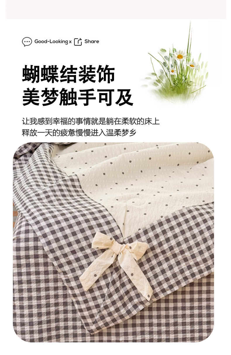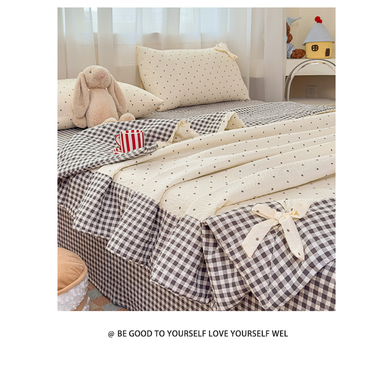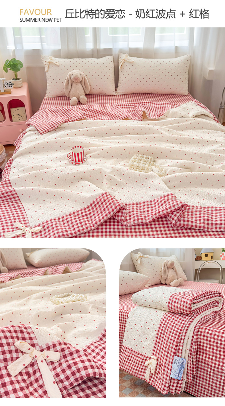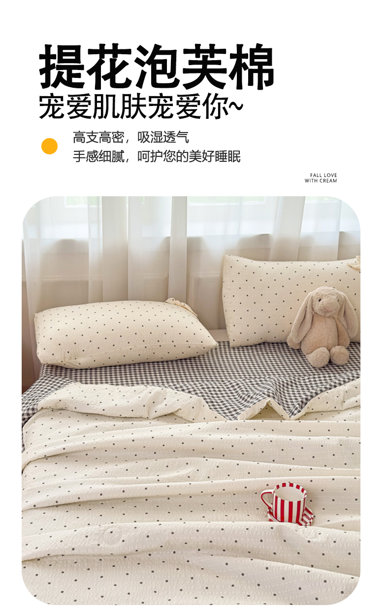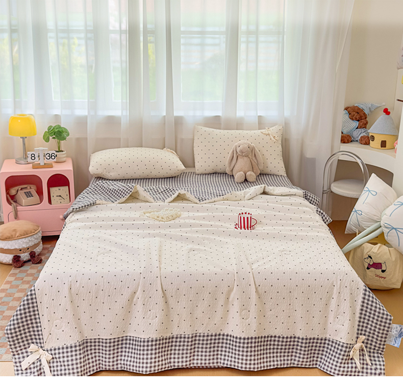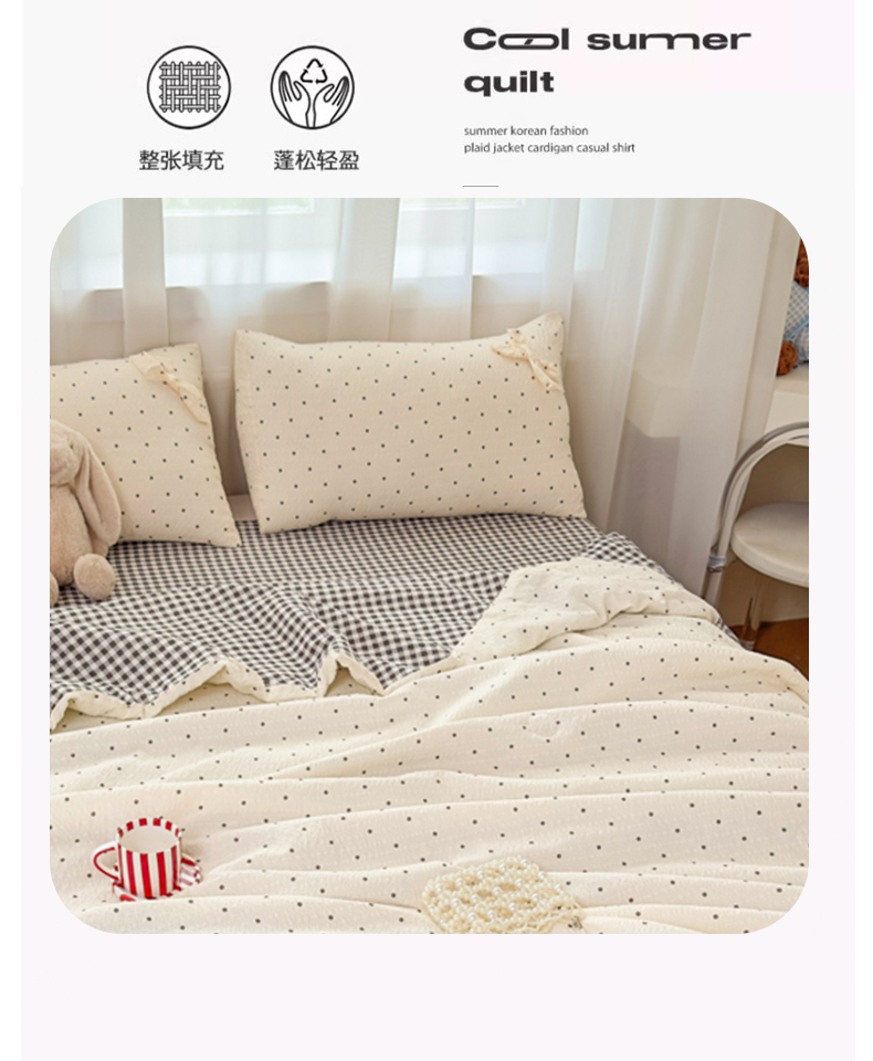 • 91家纺网 家纺一手货源 找家纺 爱彼家纺 2026春夏新款韩式花边泡芙棉床单款夏被夏凉被空调被四件套 奶灰波点