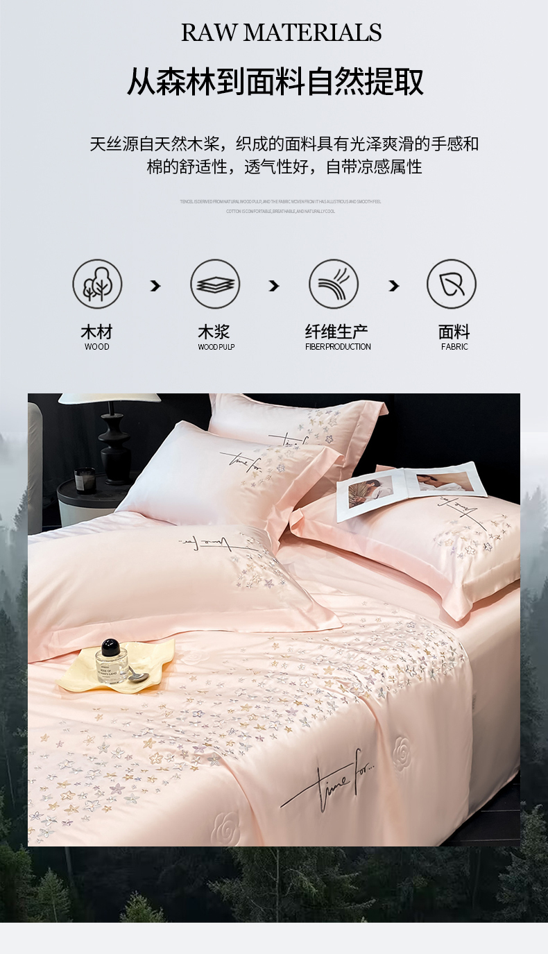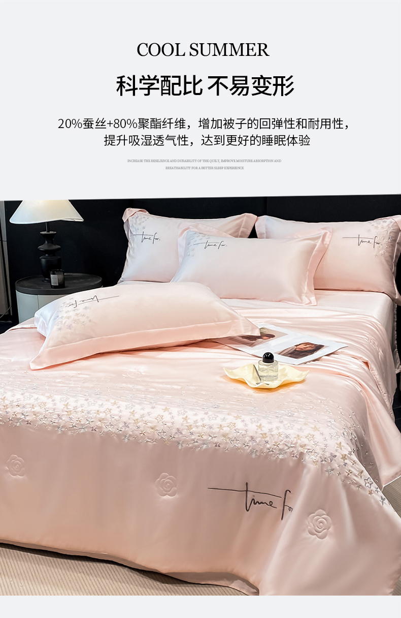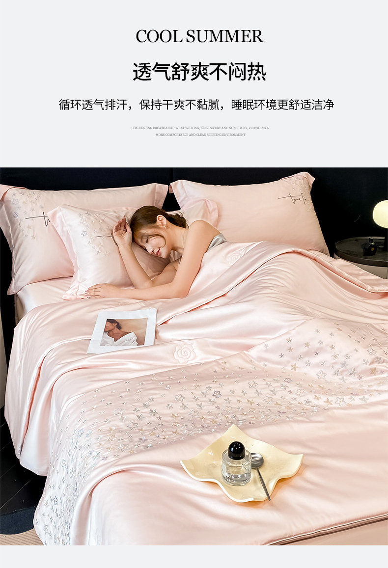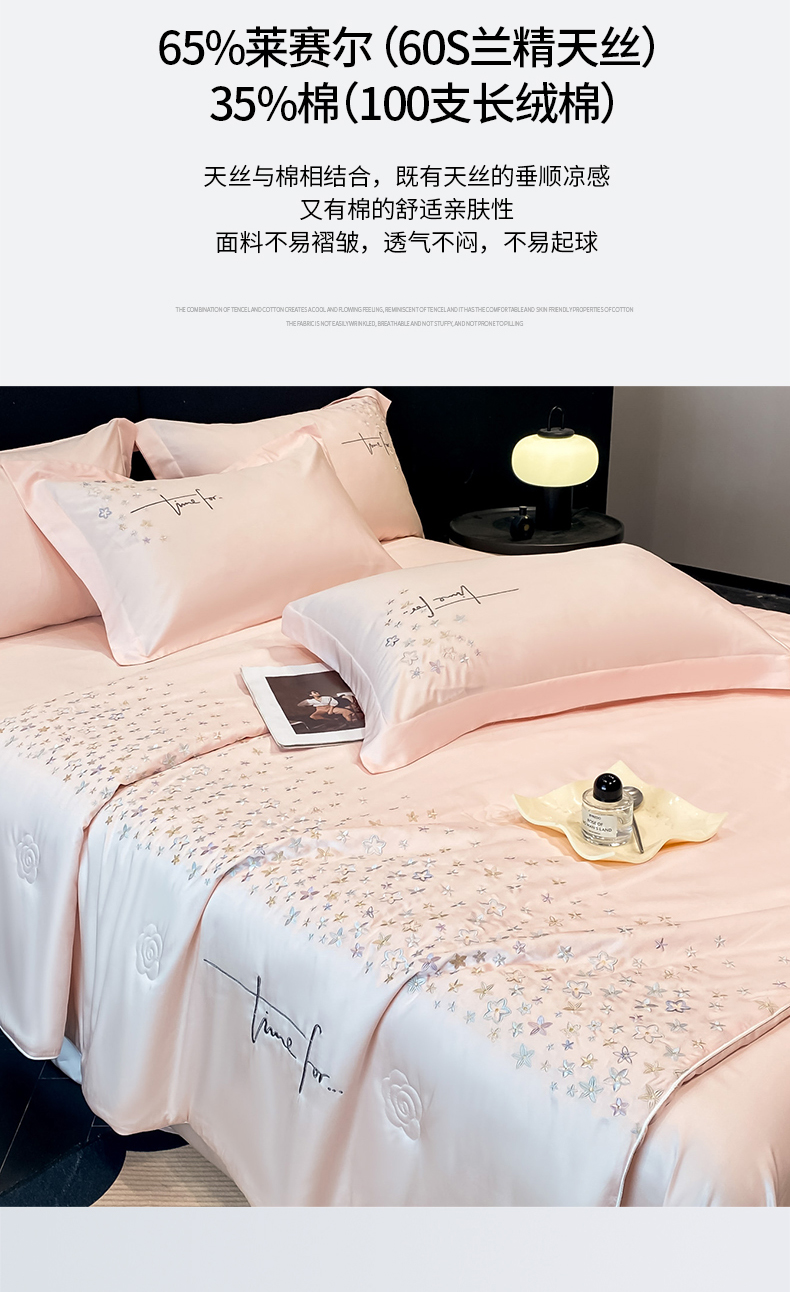 当前位置: 91家纺网 > 商品网购 > 床品套件 > 四件套 > 夏被四件套 > (总)新方向 2026刺绣A类20%蚕丝天丝棉夏被四件套 65%60s兰精天丝 35%100支长绒棉-星耀