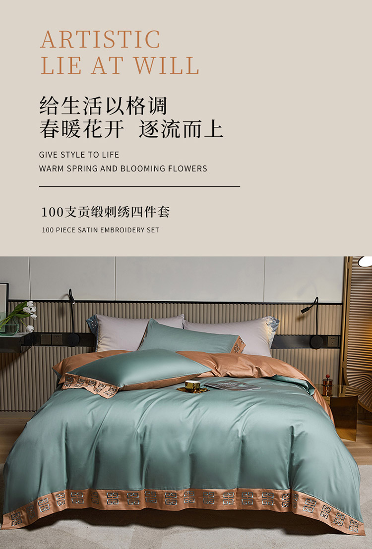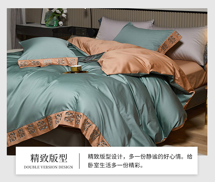 爱缦2021宫系列100S长绒棉澳棉刺绣四件套青瓷绿-杏仁色