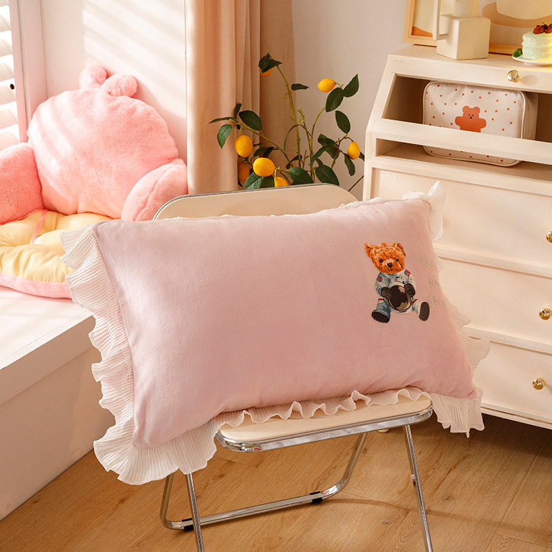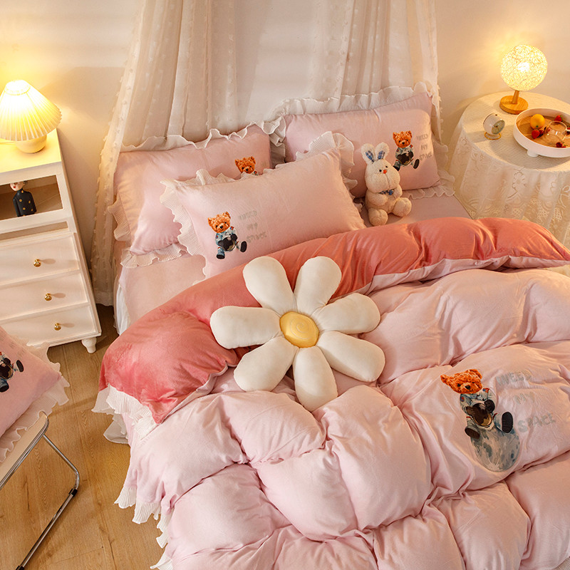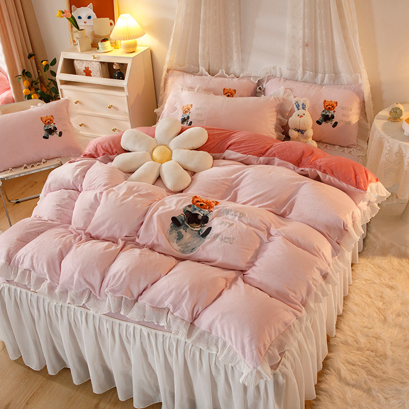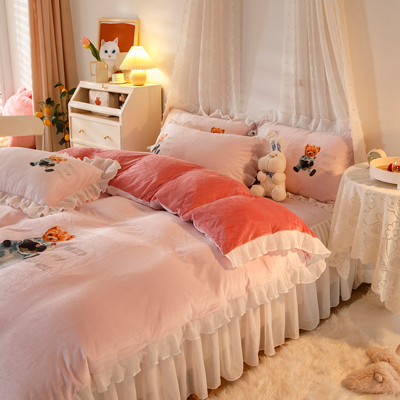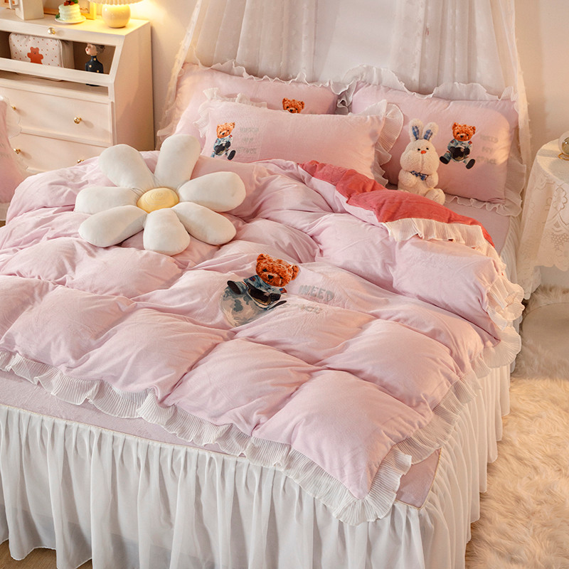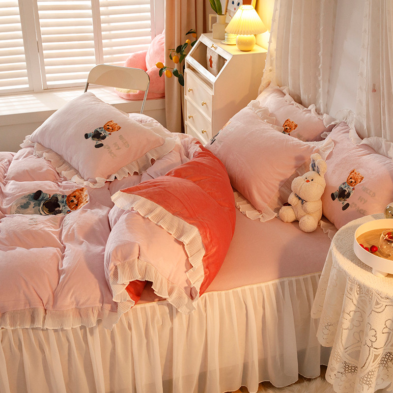 纽缦 2021新款韩版水晶绒床裙四件套 萌熊 -粉豆沙