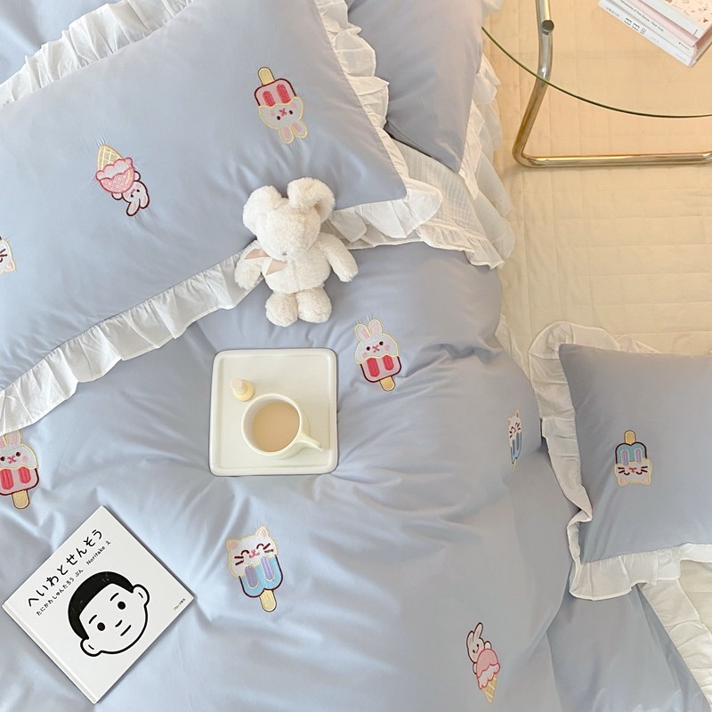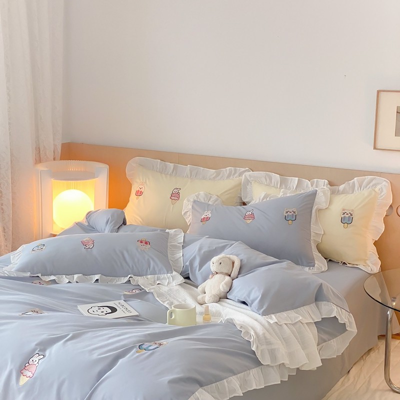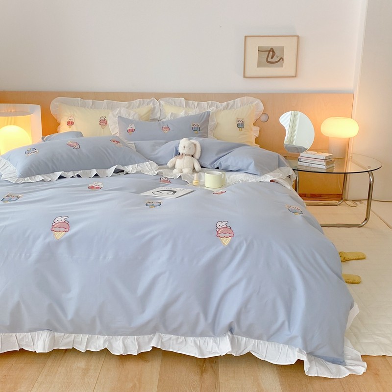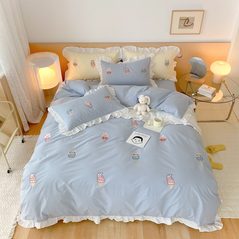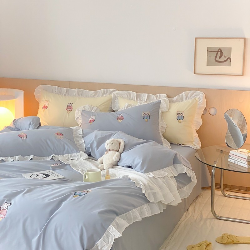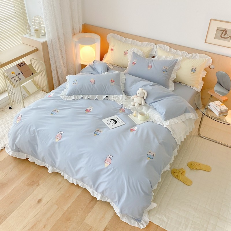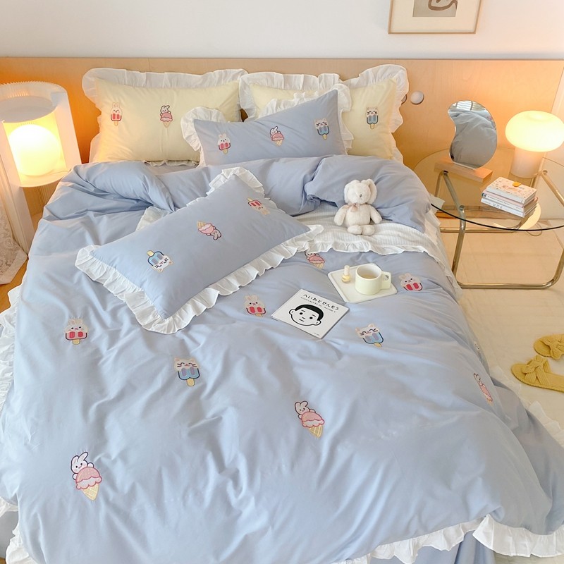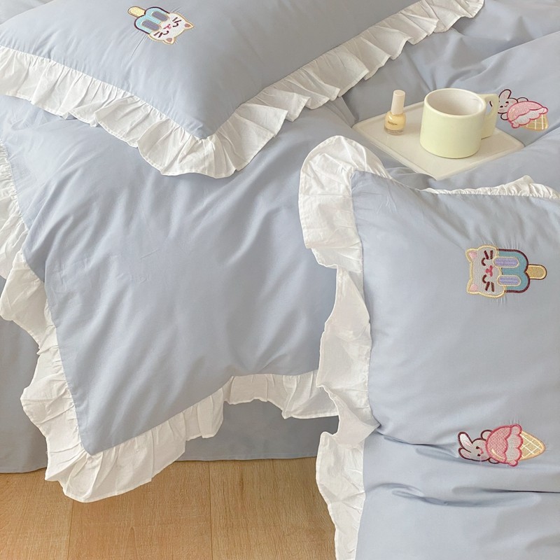 本希新款40全棉水洗棉荷叶边刺绣小清新四件套奶油冰激凌雾霾蓝