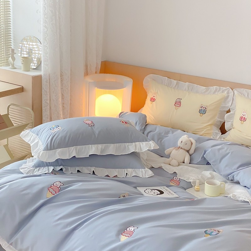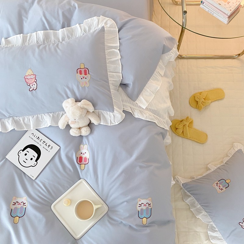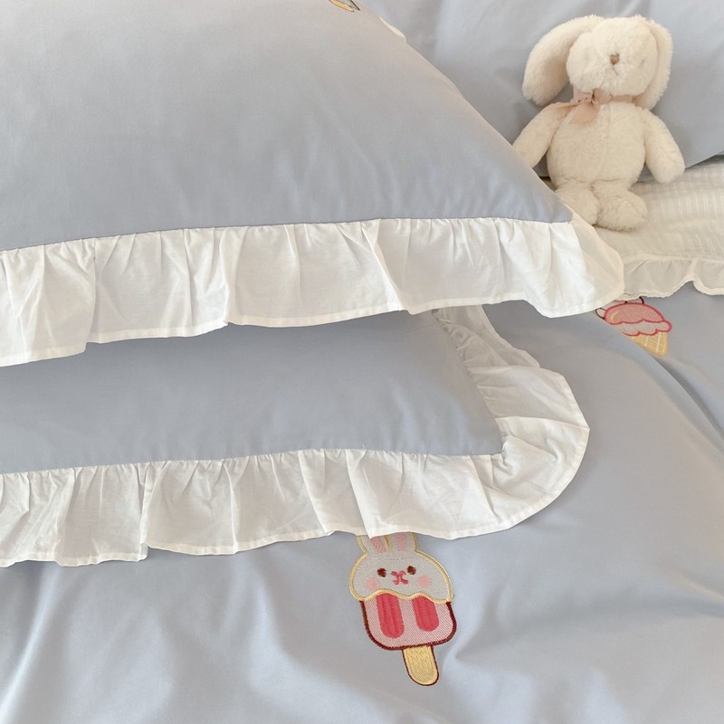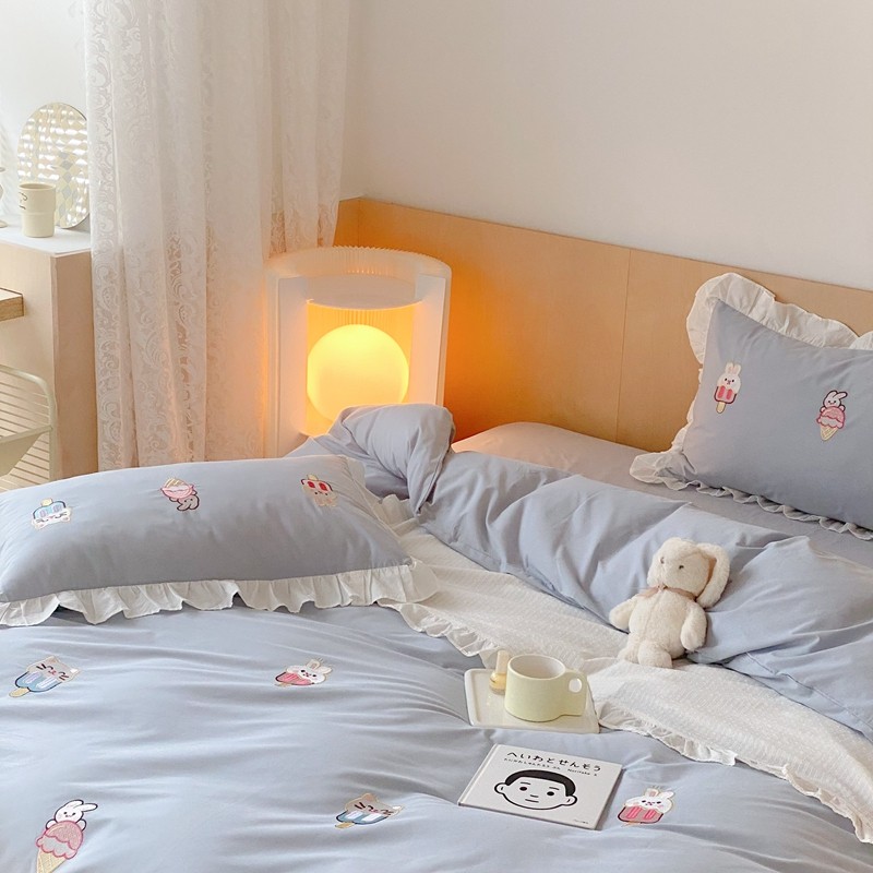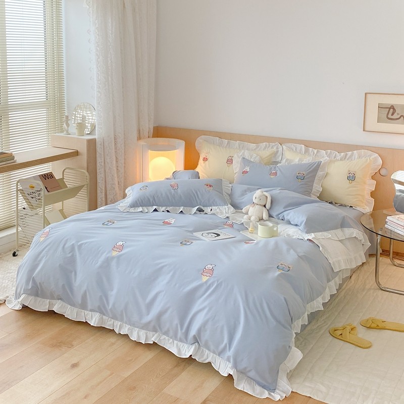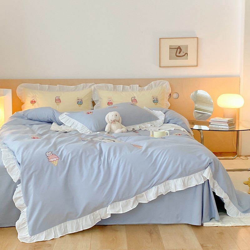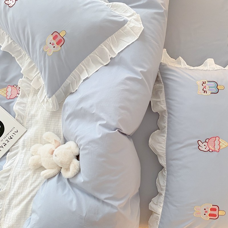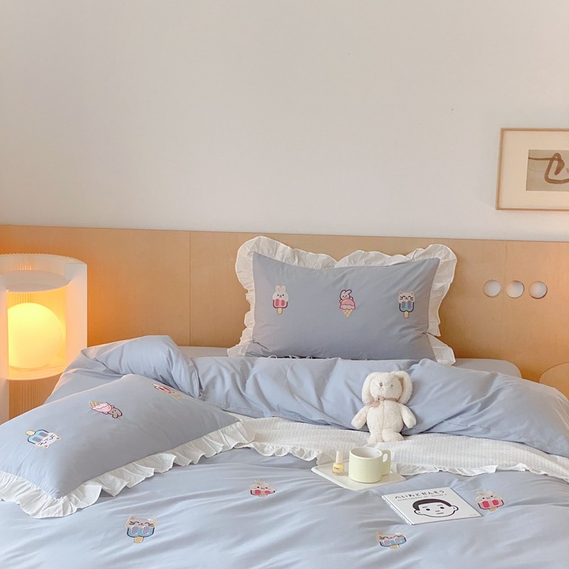 本希新款40全棉水洗棉荷叶边刺绣小清新四件套奶油冰激凌雾霾蓝