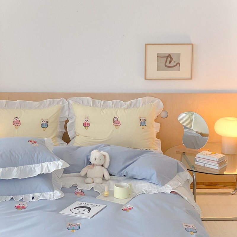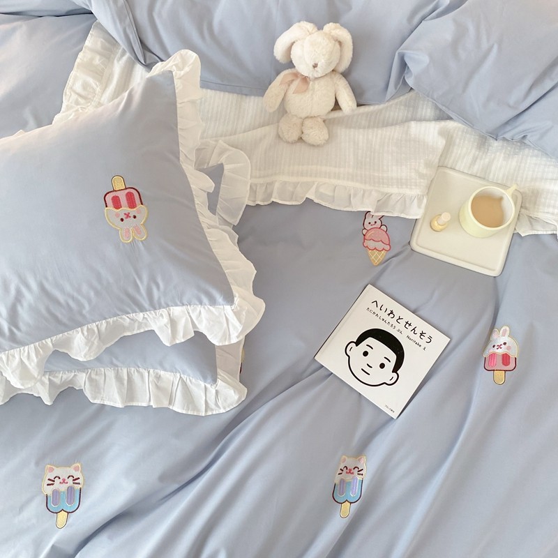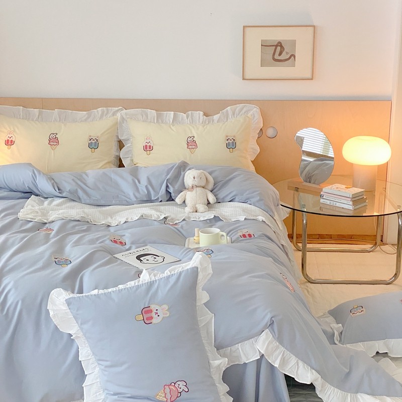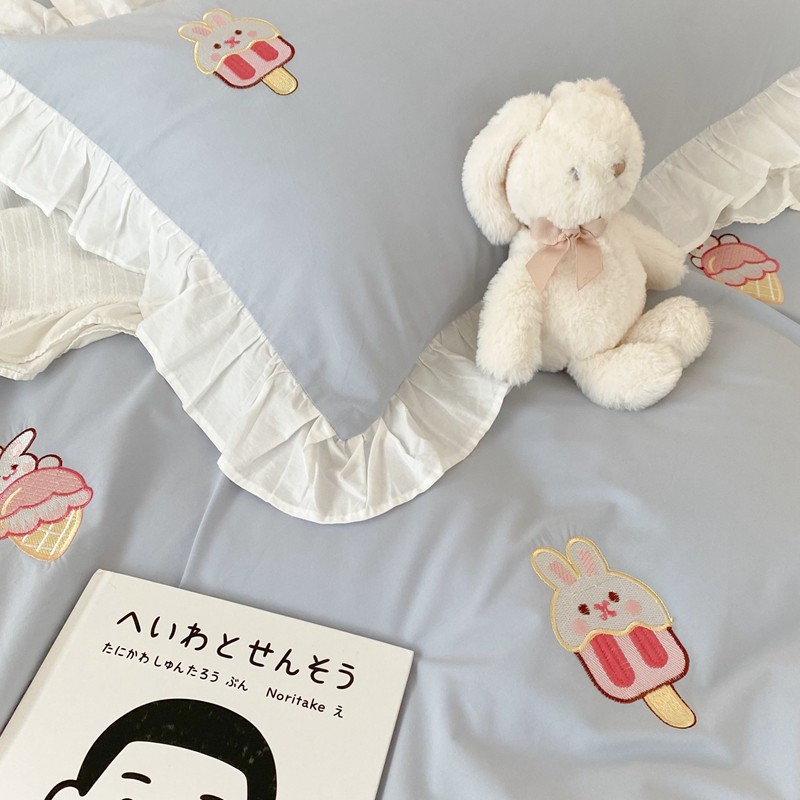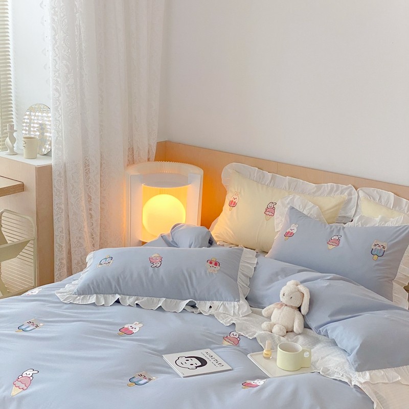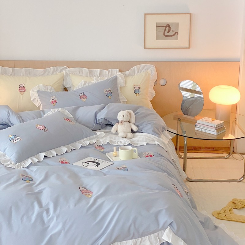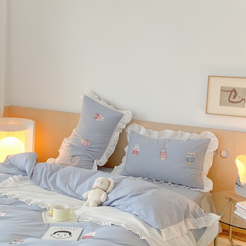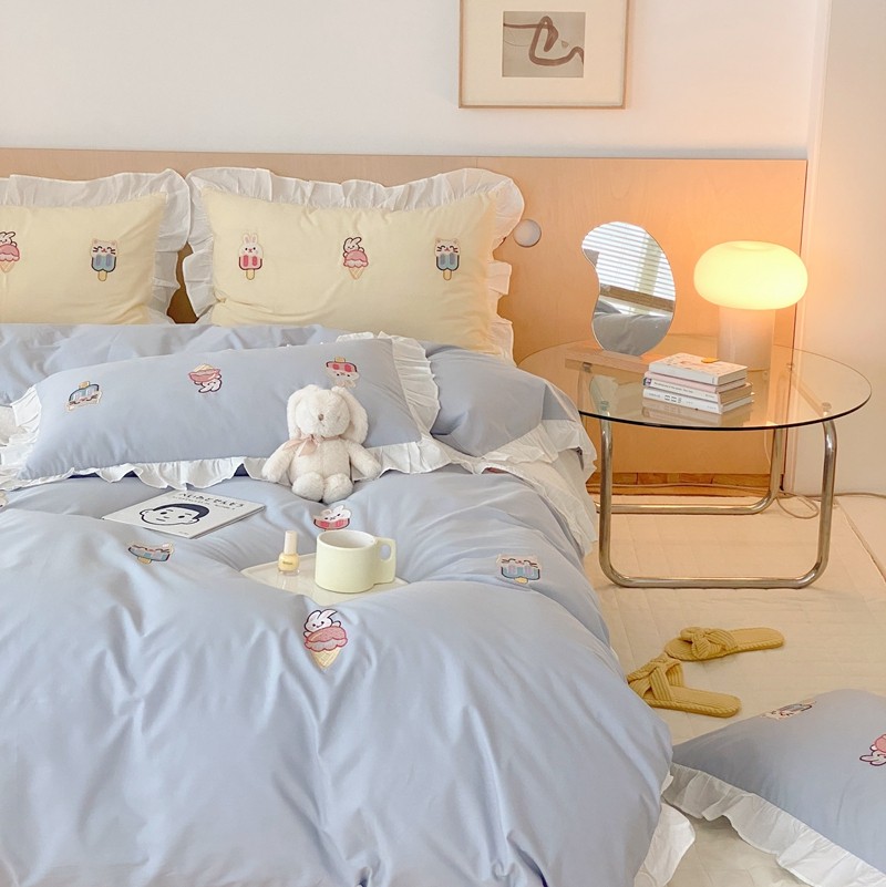 本希新款40全棉水洗棉荷叶边刺绣小清新四件套奶油冰激凌雾霾蓝