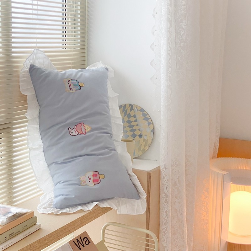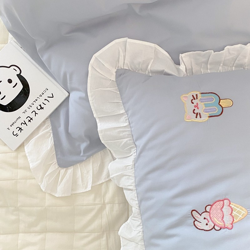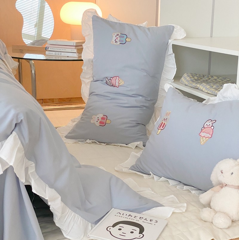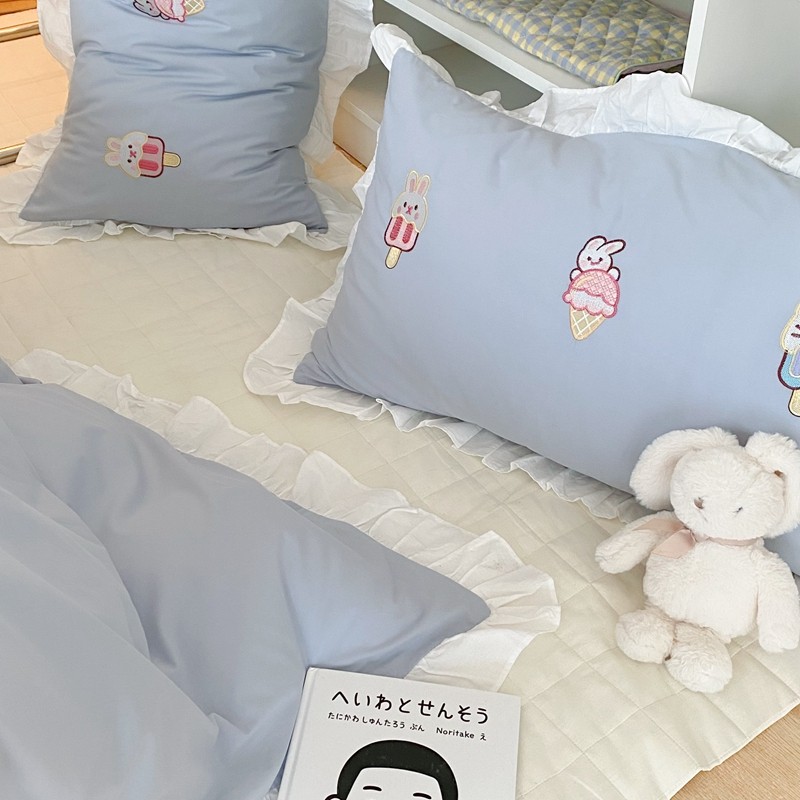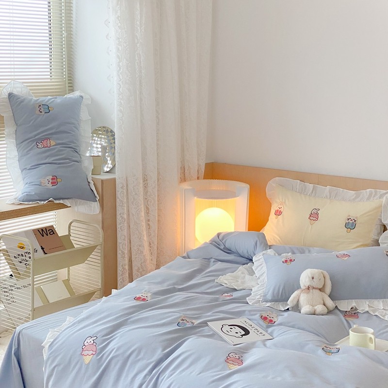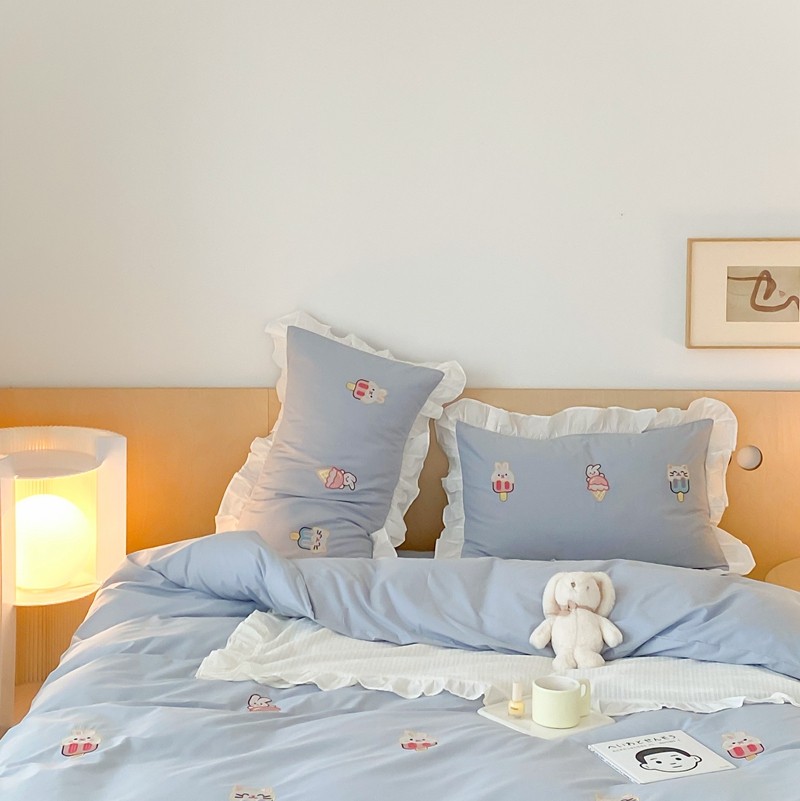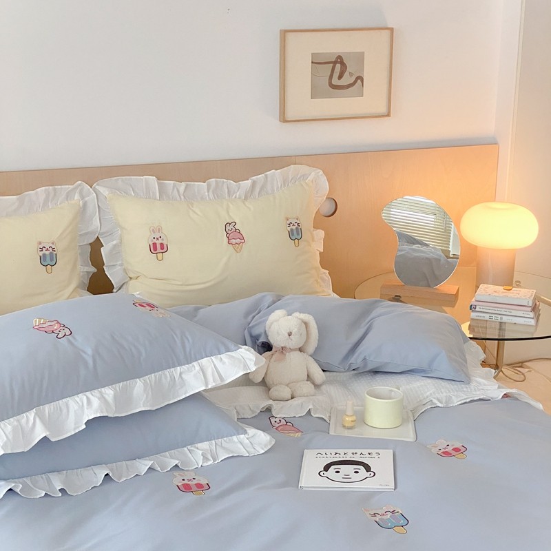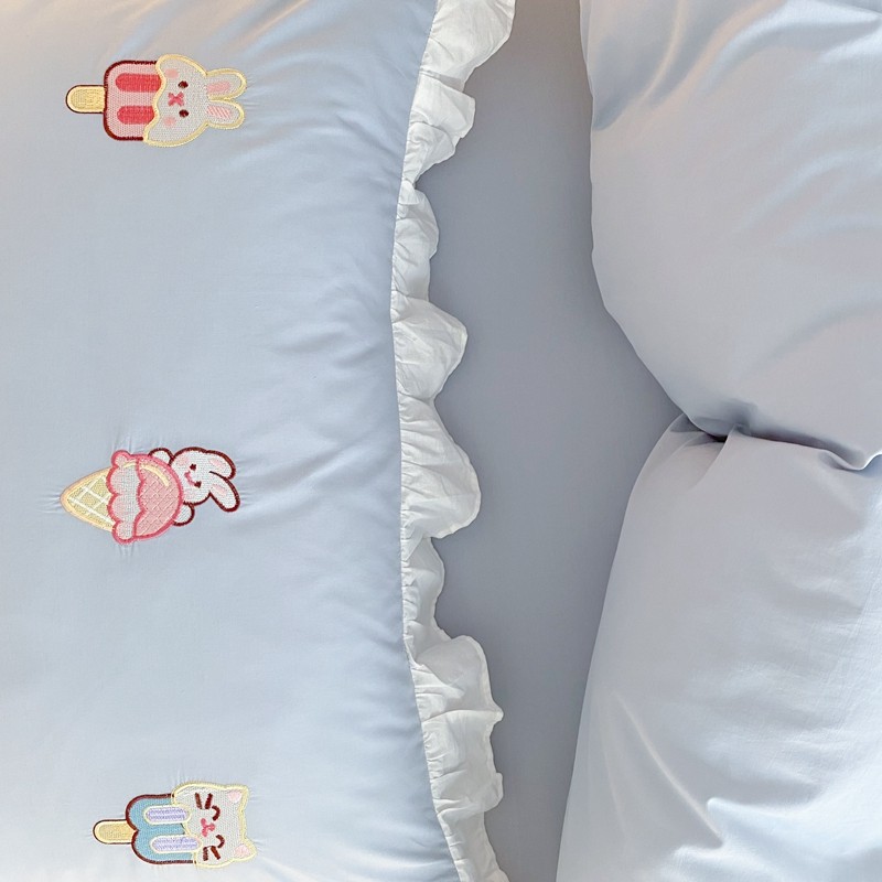 本希新款40全棉水洗棉荷叶边刺绣小清新四件套奶油冰激凌雾霾蓝