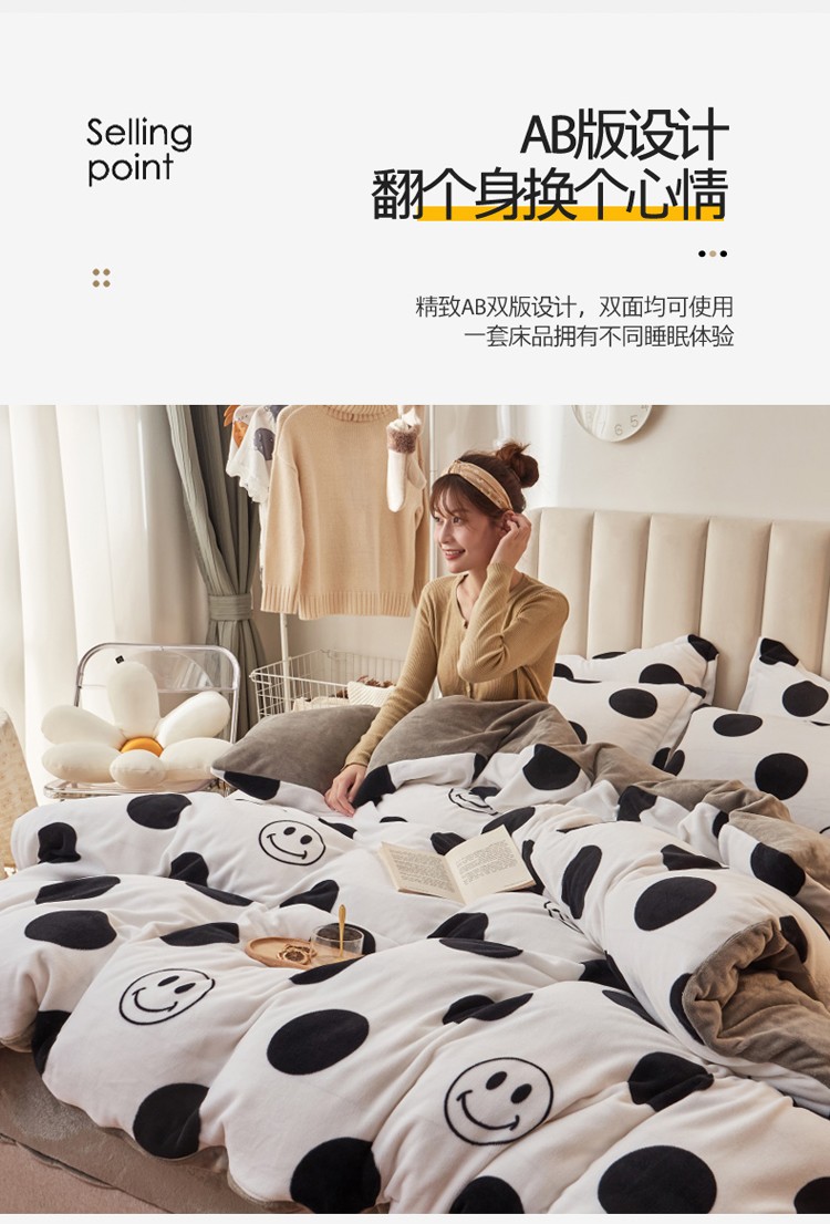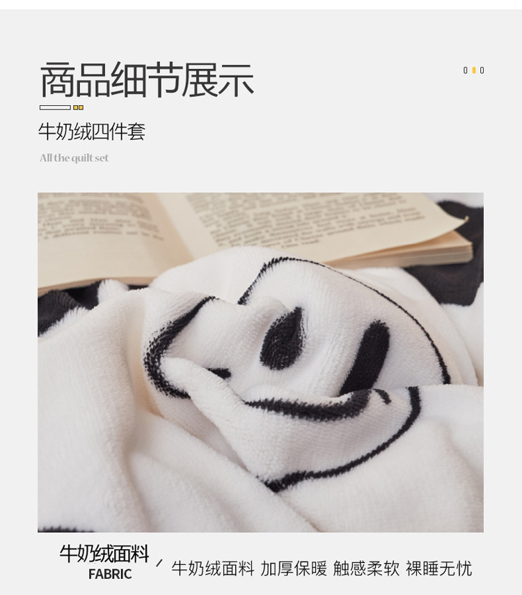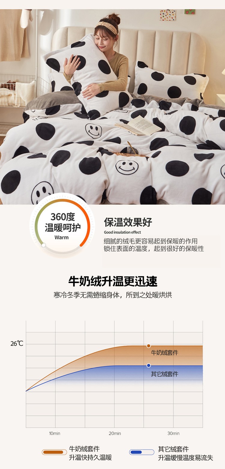 当前位置: 91家纺网 > 商品网购 > 床品套件 > 四件套 > 牛奶绒四件套 > 寐居家纺 2021新款印花牛奶绒四件套深色调 波点笑脸