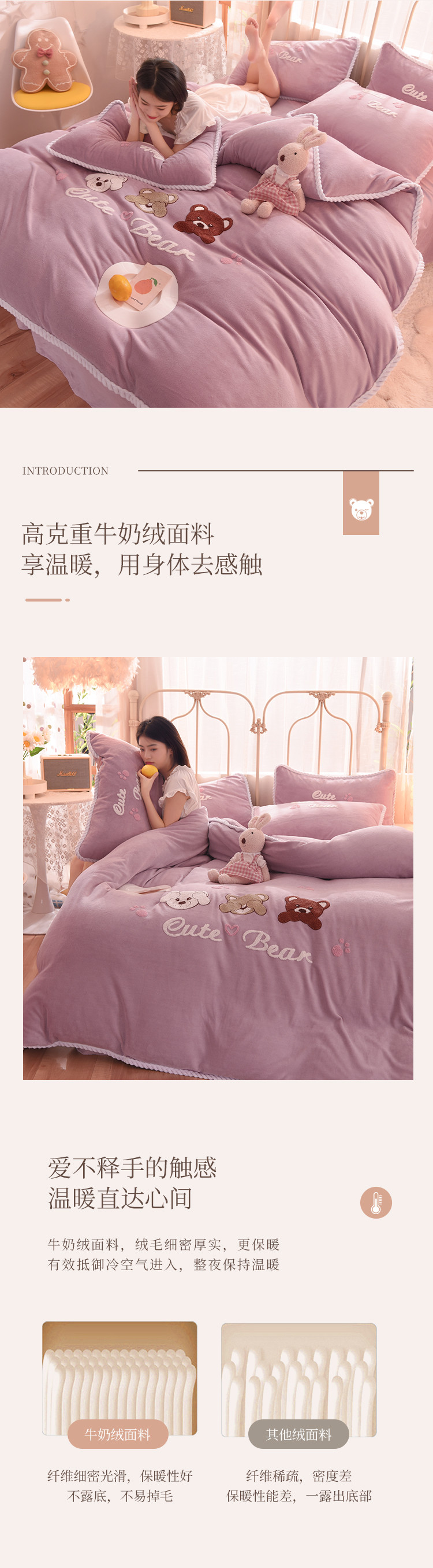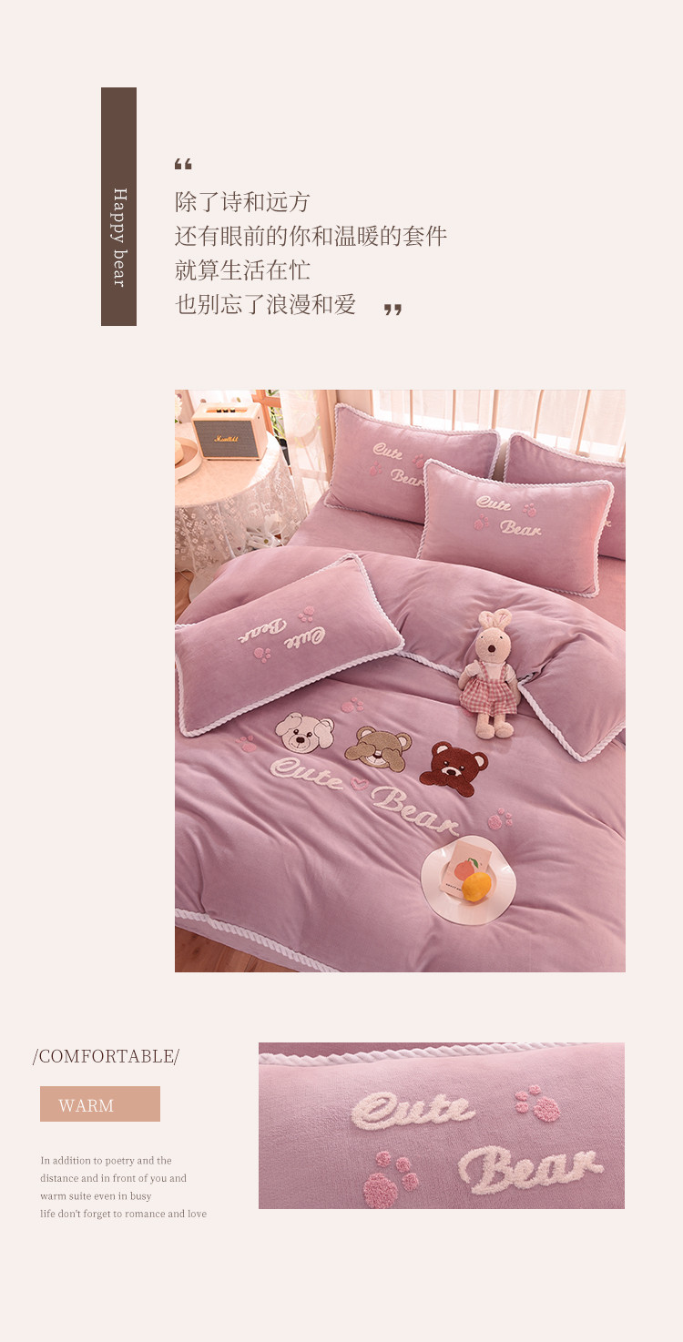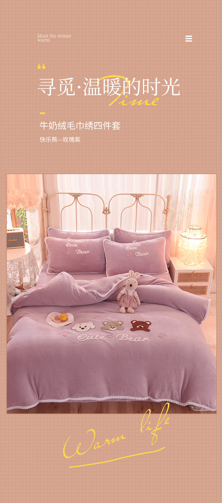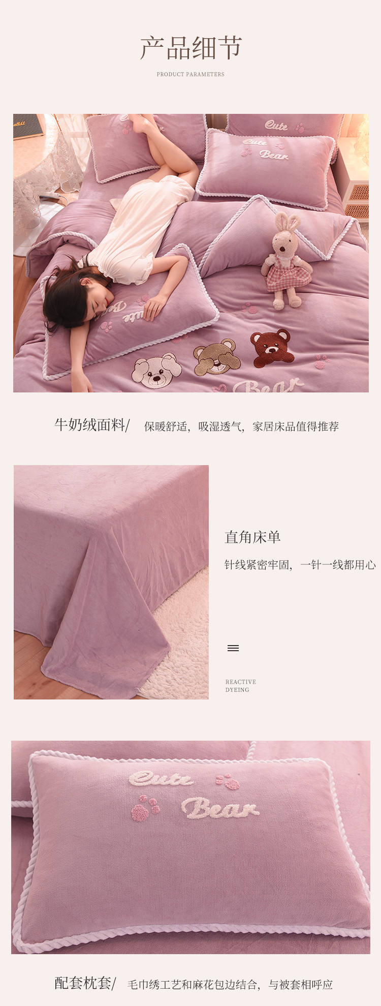 商品名称:菲儿 2021新款牛奶绒四件套法莱水晶绒 快乐熊-玫瑰紫