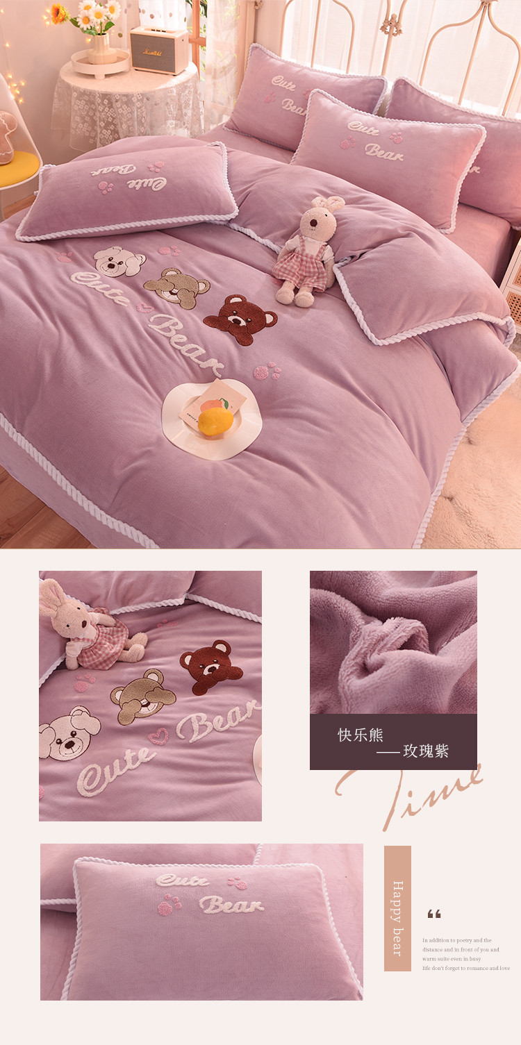 菲儿 2021新款牛奶绒四件套法莱水晶绒 快乐熊-玫瑰紫