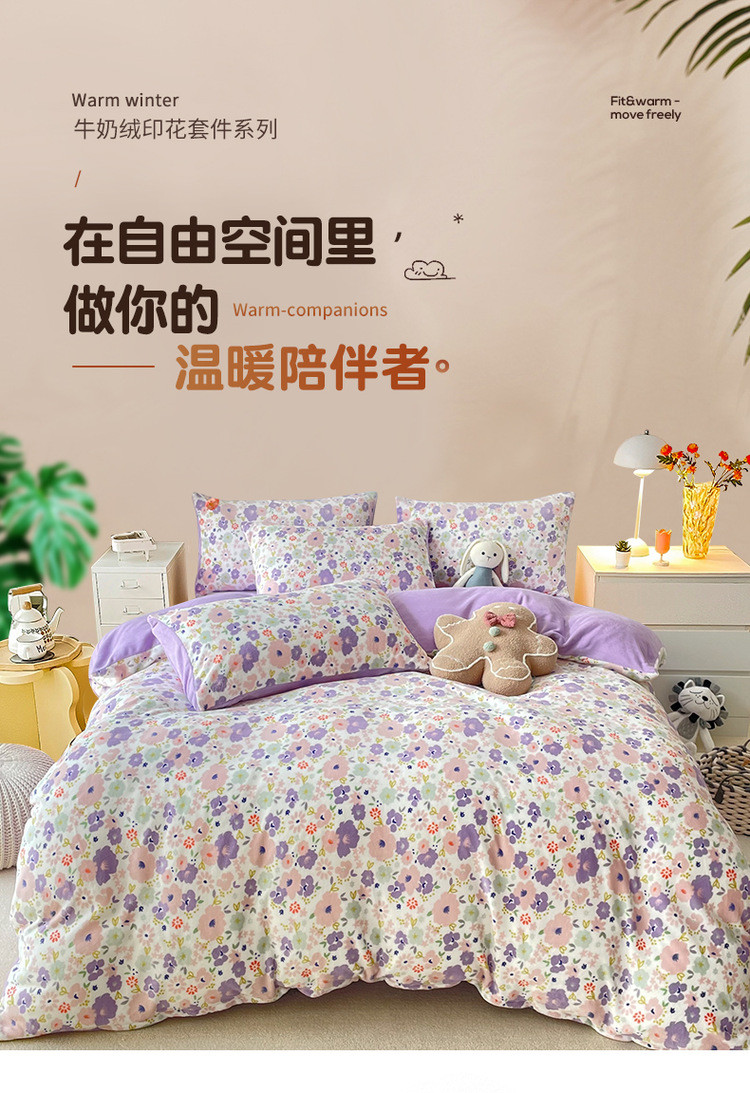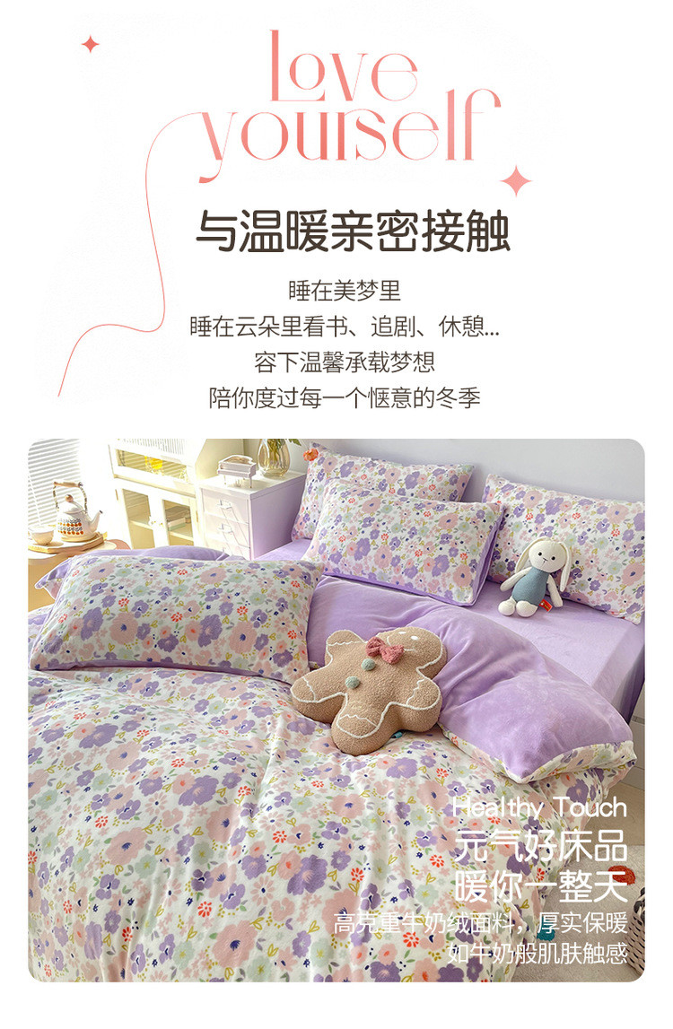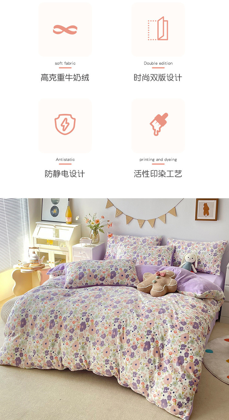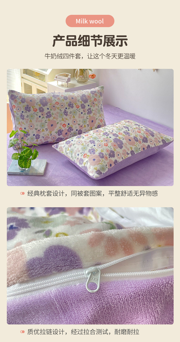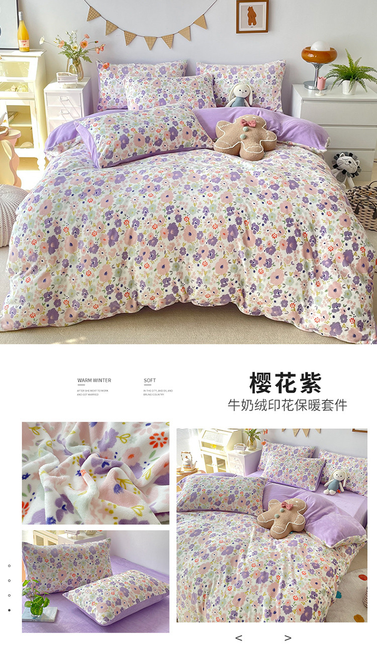 商品名称:优彩 2021新款200克高克重印花牛奶绒四件套 樱花紫