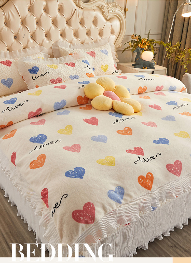 宜凡 2021新款牛奶绒小清新床盖四件套 爱心派对