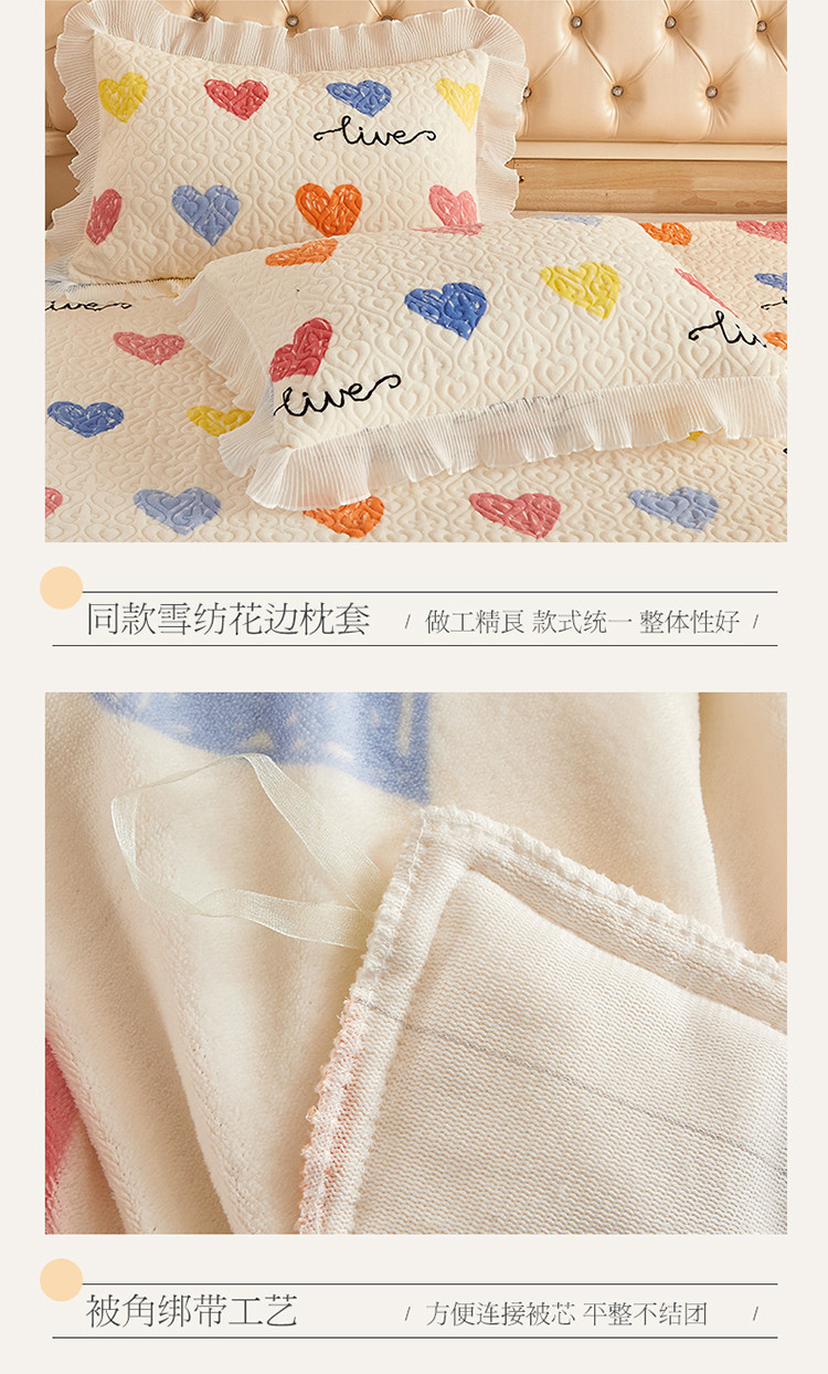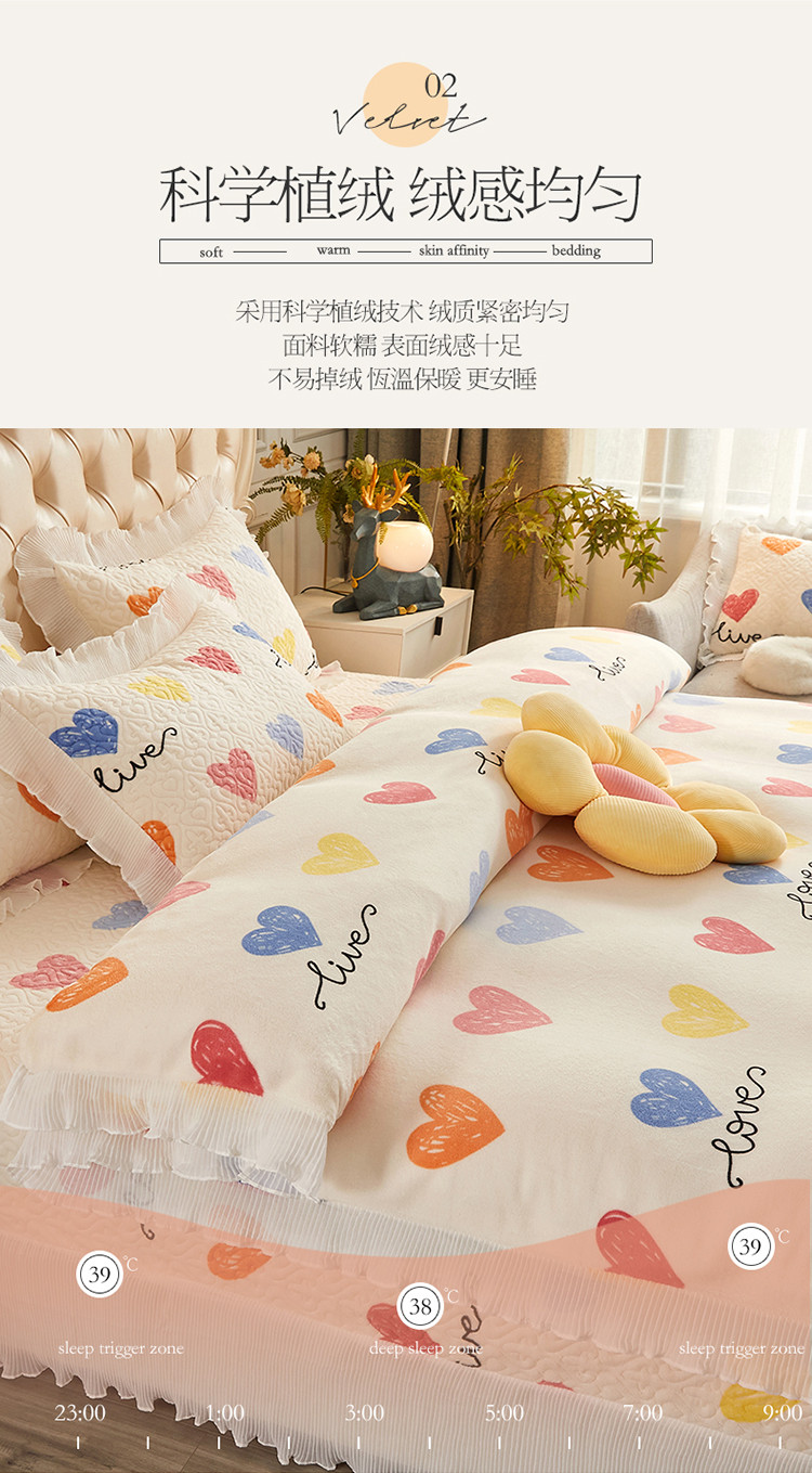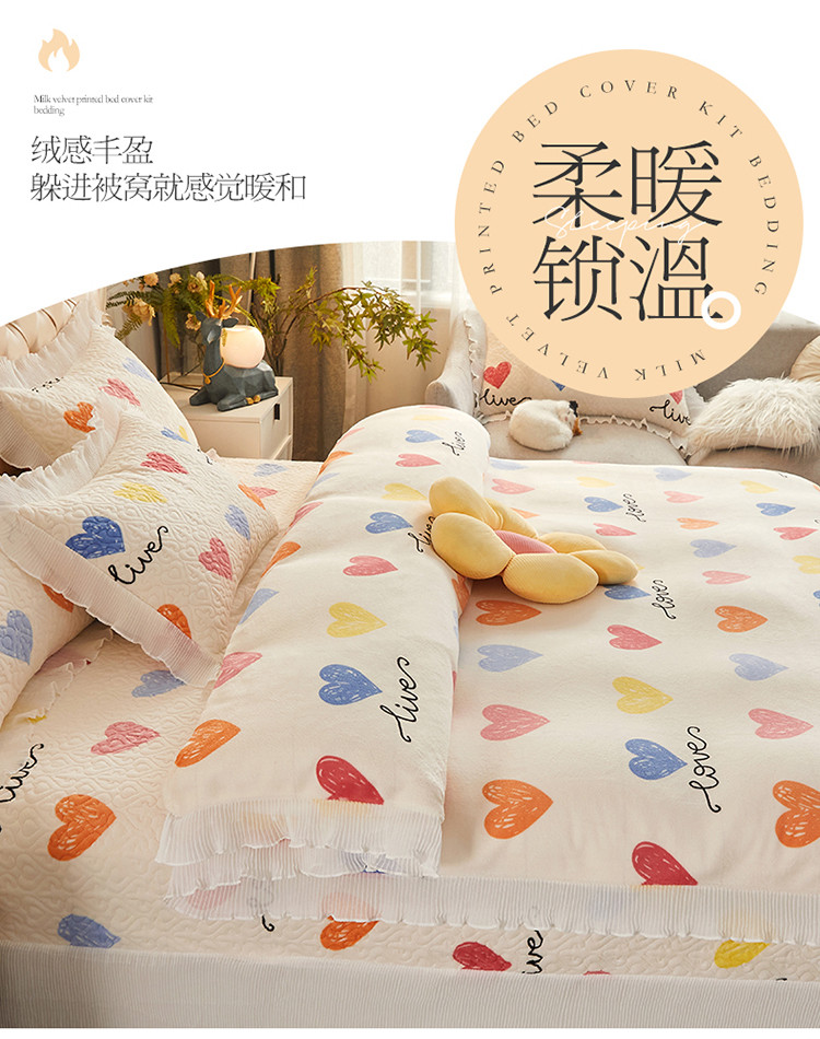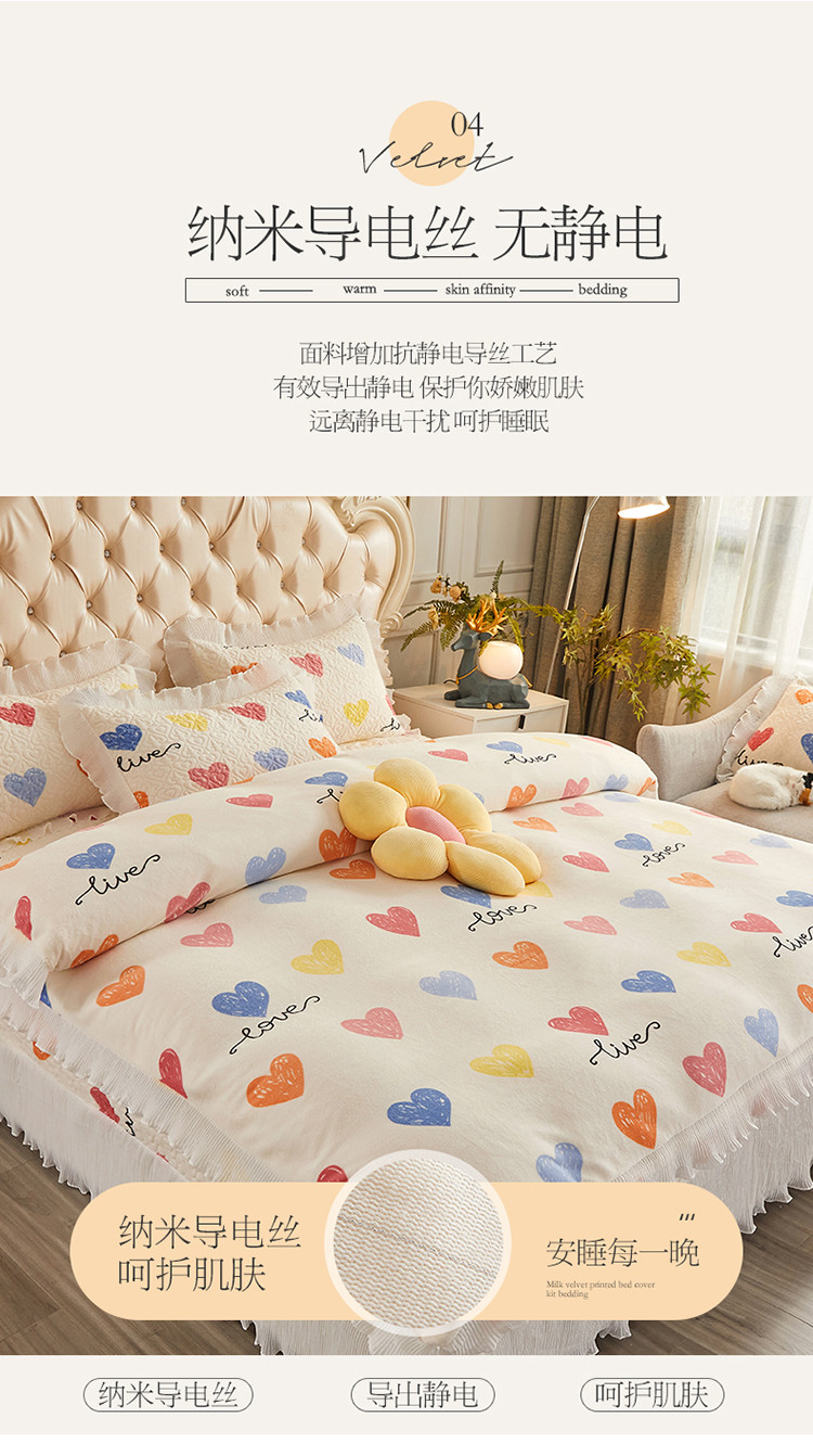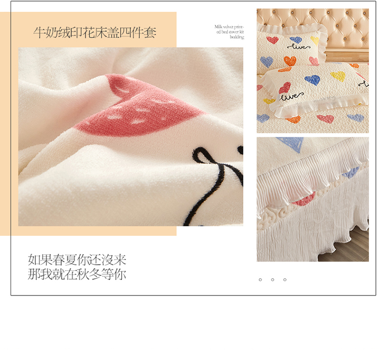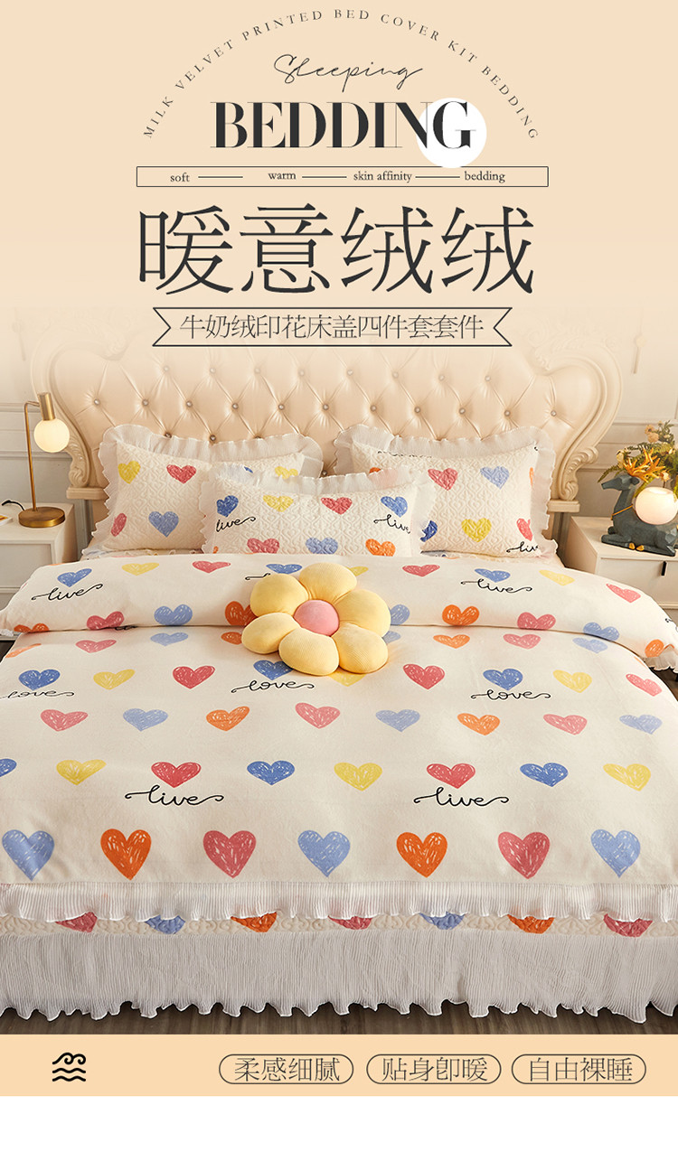 • 91家纺网 家纺一手货源 找家纺 宜凡 2021新款牛奶绒小清新床盖四件套 爱心派对
