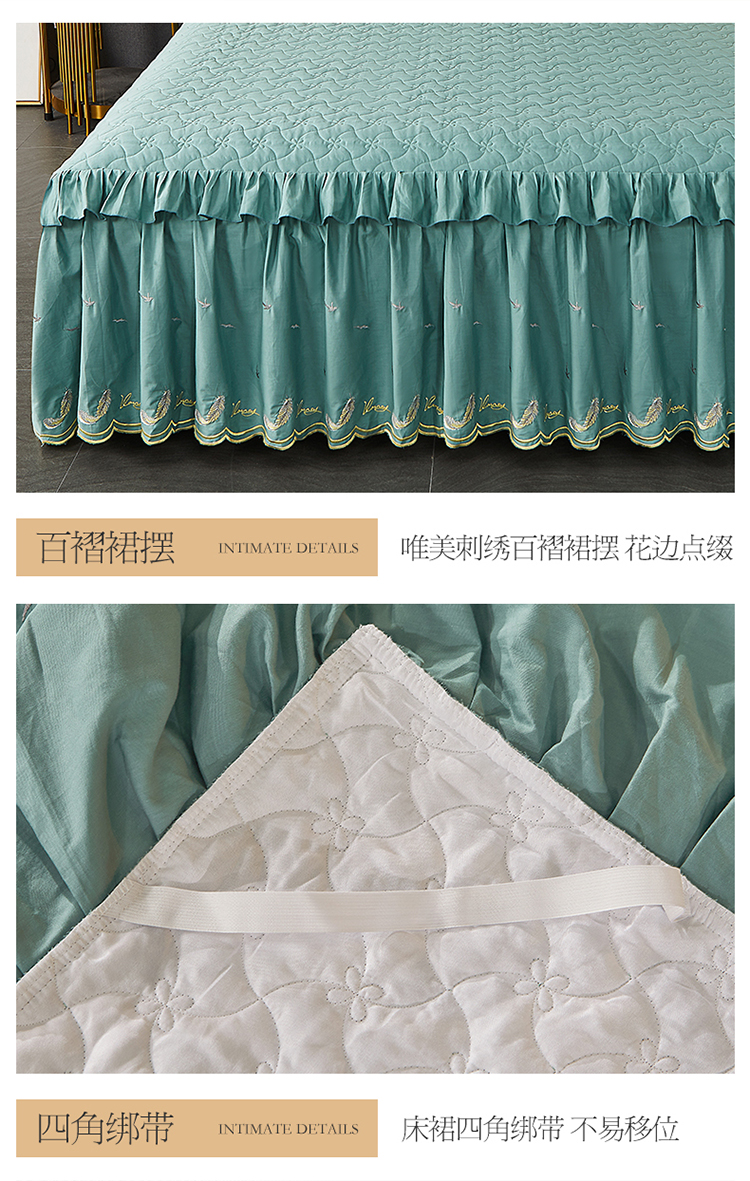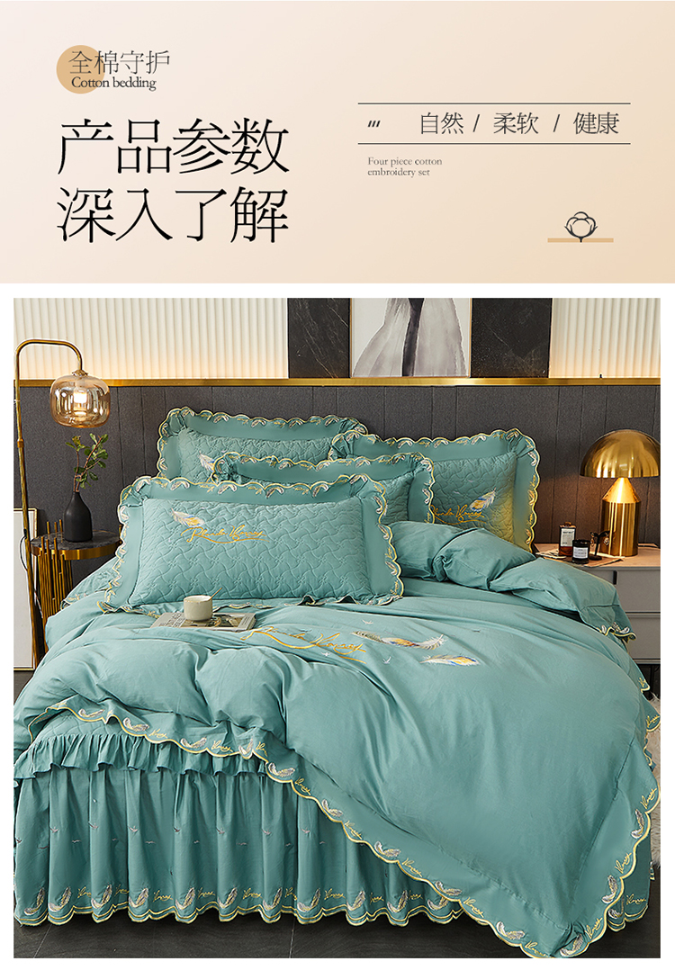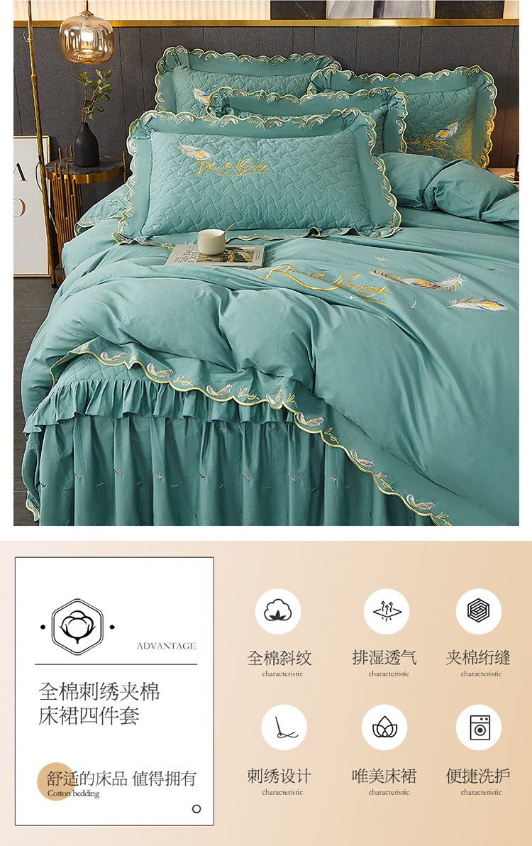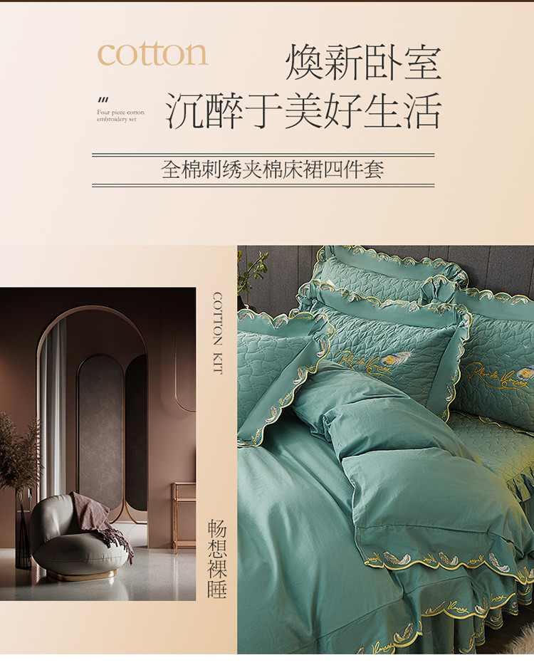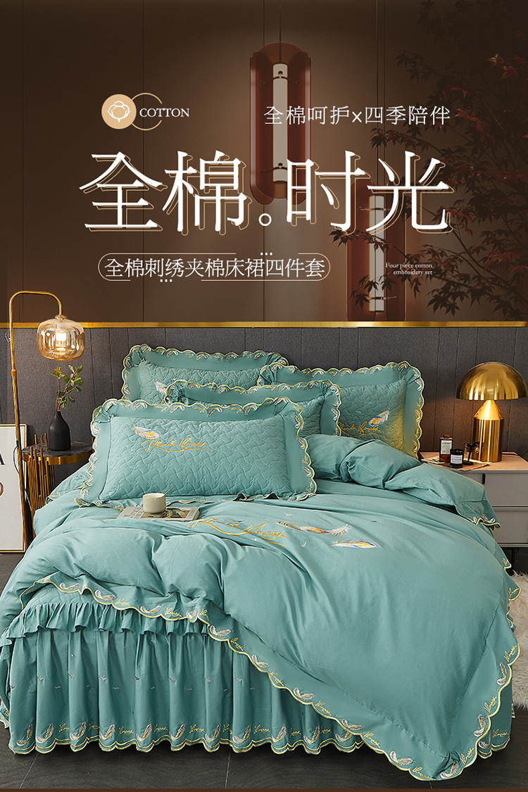当前位置: 91家纺网 > 商品网购 > 床品套件 > 四件套 > 全棉普通四件套 > 宜凡 2022新款全棉刺绣夹棉床裙款四件套-芳羽 芳羽豆绿