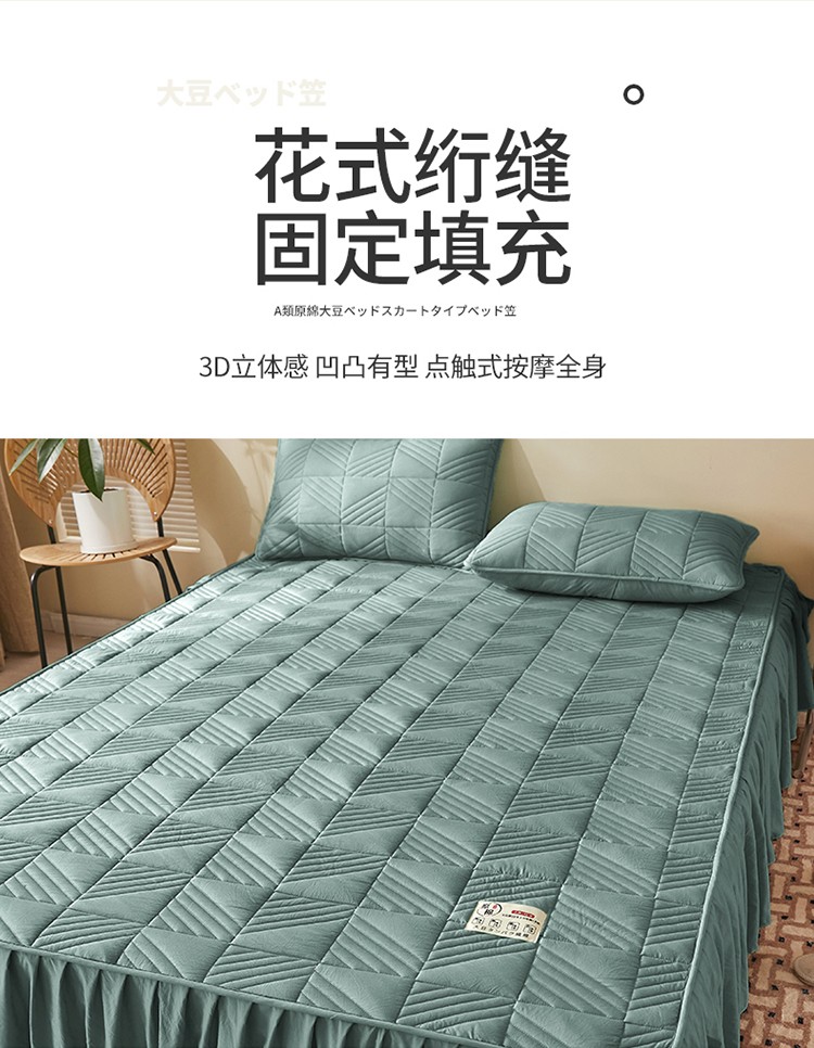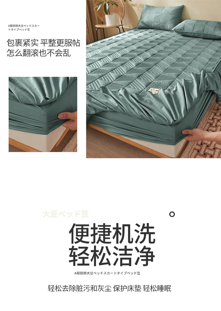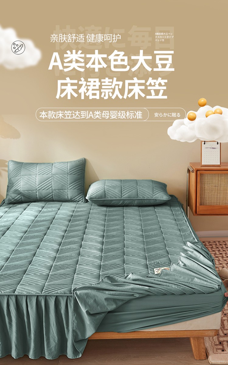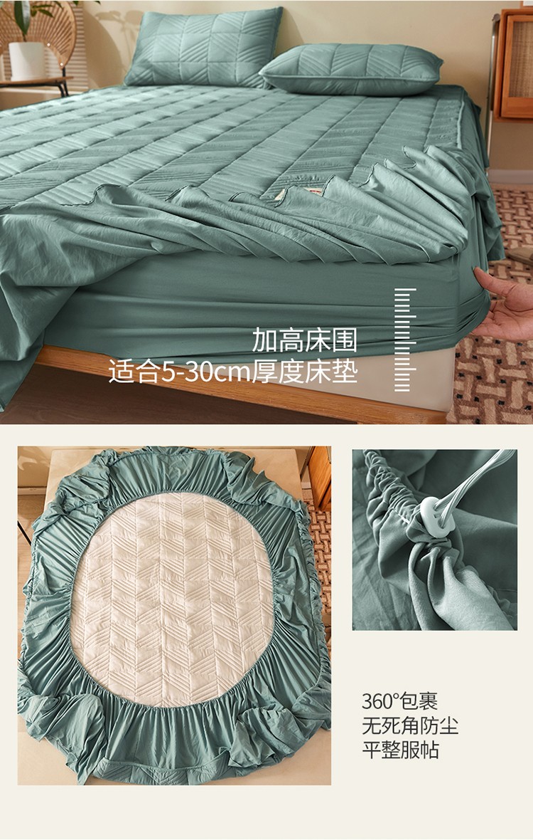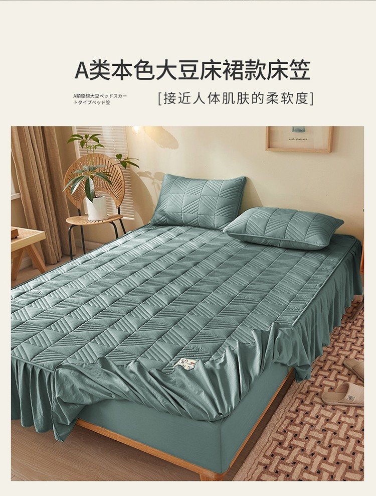 2022新款A类原棉大豆夹棉床裙款床笠本色大豆床笠错落格墨绿
