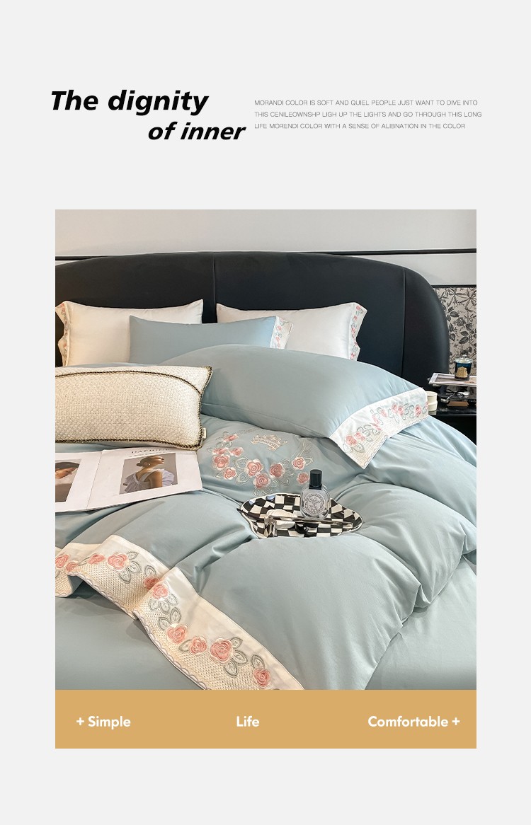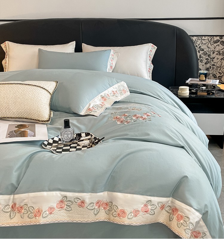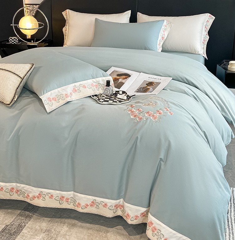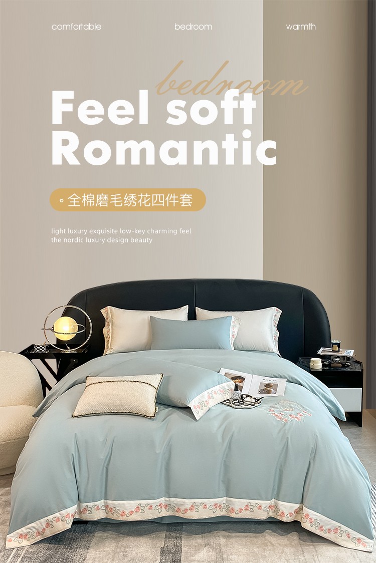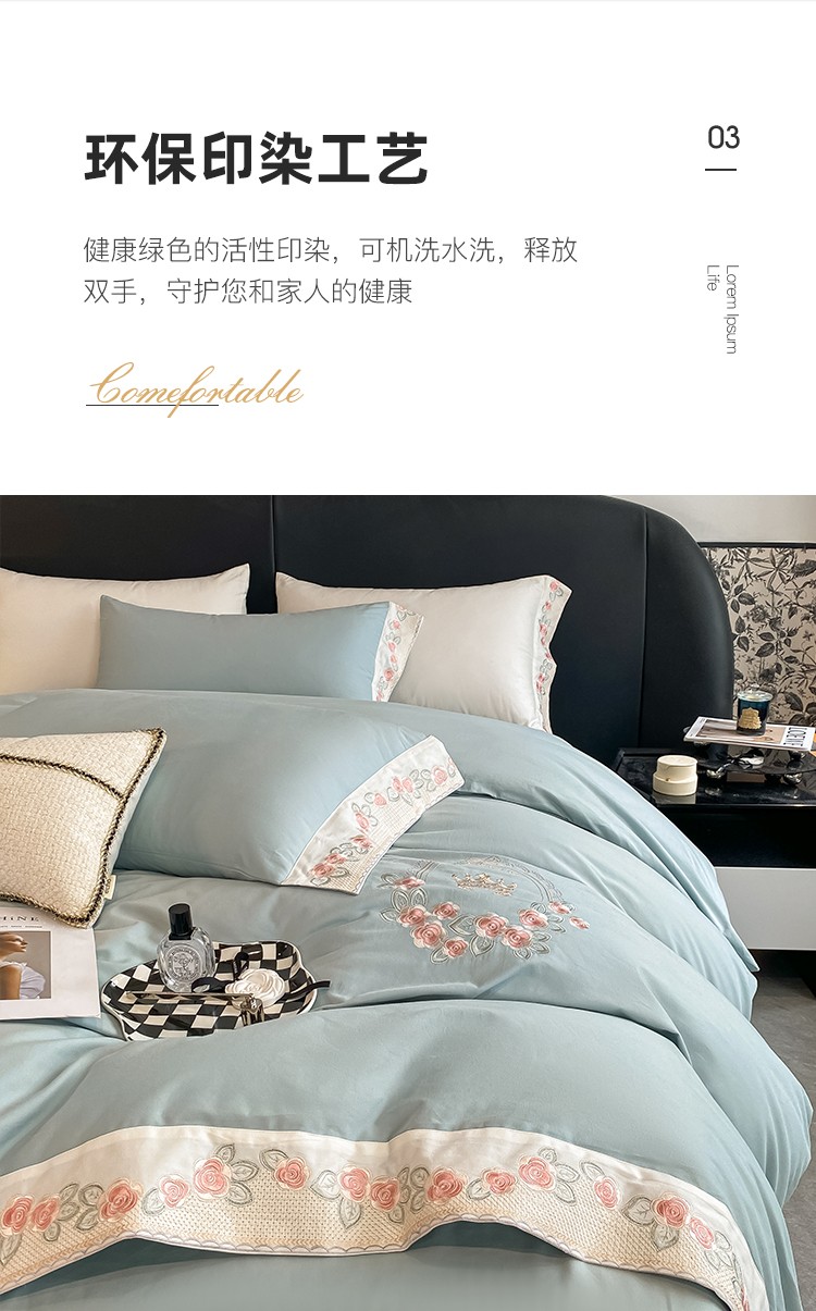 (总)理想家家纺 2025新款纯棉轻奢刺绣四件套--心愿系列场景二,心愿粉,心愿红,心愿黄,心愿蓝