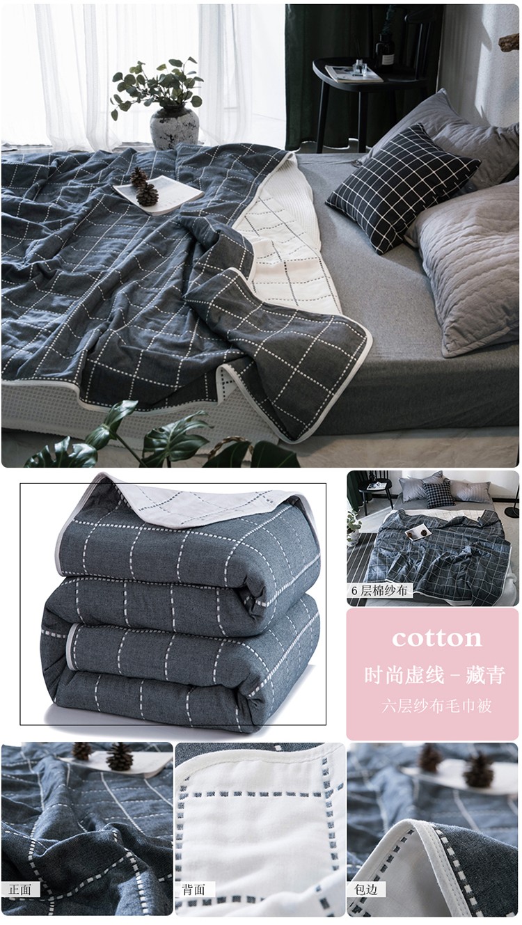 商品名称:朴尔 2023新款全尺寸经典六层纱布全棉毛巾被系列 时尚虚线-藏青