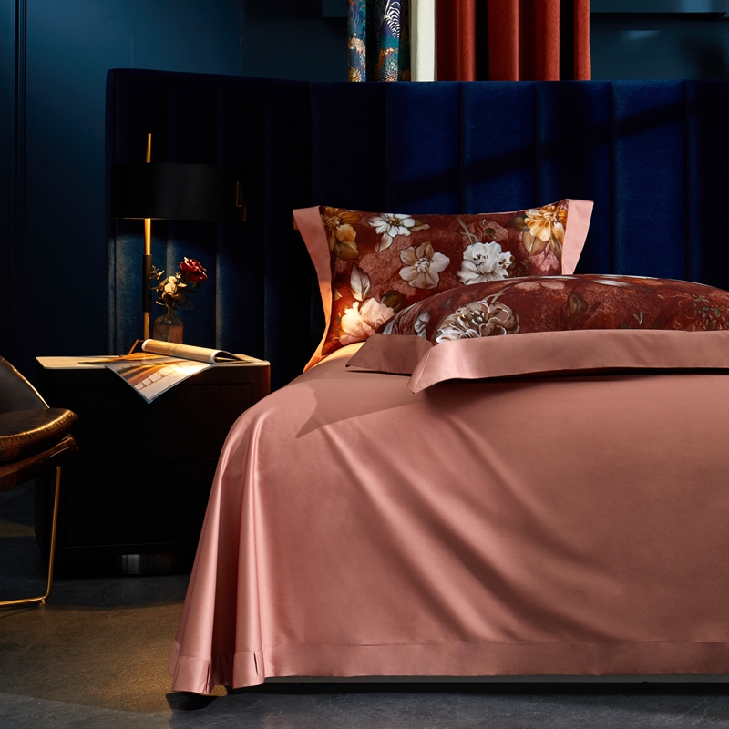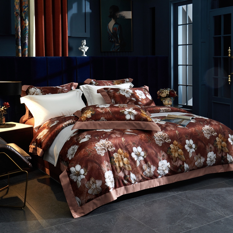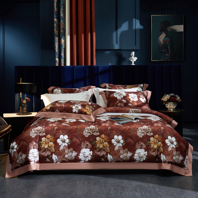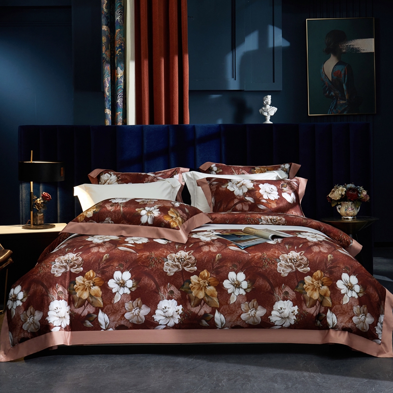 商品名称:缔缦 2023新款100s长绒棉数码印花拼角款四件套系列-伊鲁特花园 伊鲁特花园 胭脂红