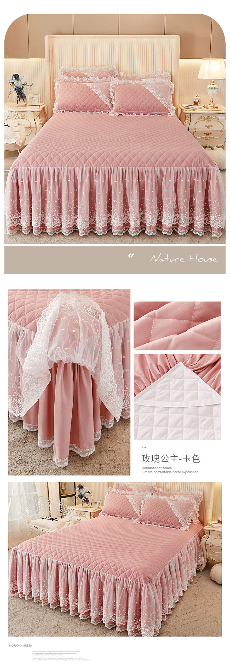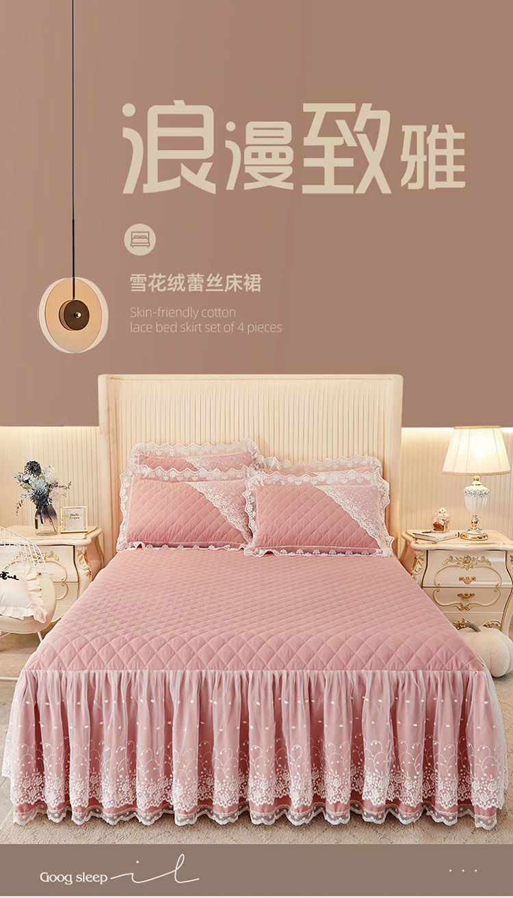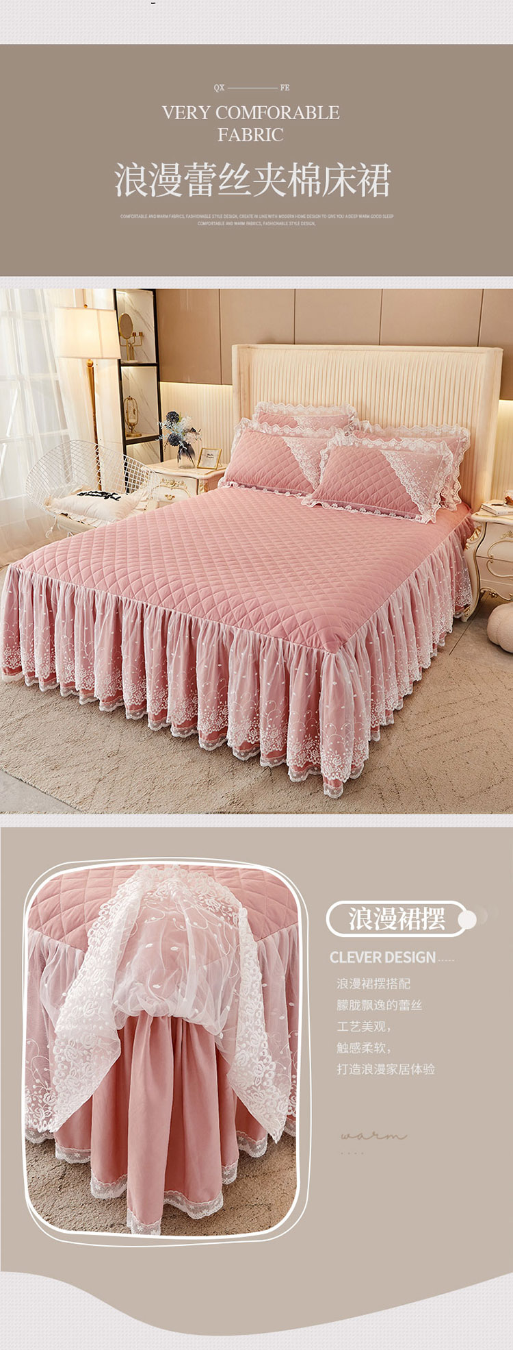 • 91家纺网 家纺一手货源 找家纺 恋尚 2023新款纯色雪花绒夹棉蕾丝床裙三件套(四季款) 玫瑰公主-玉色