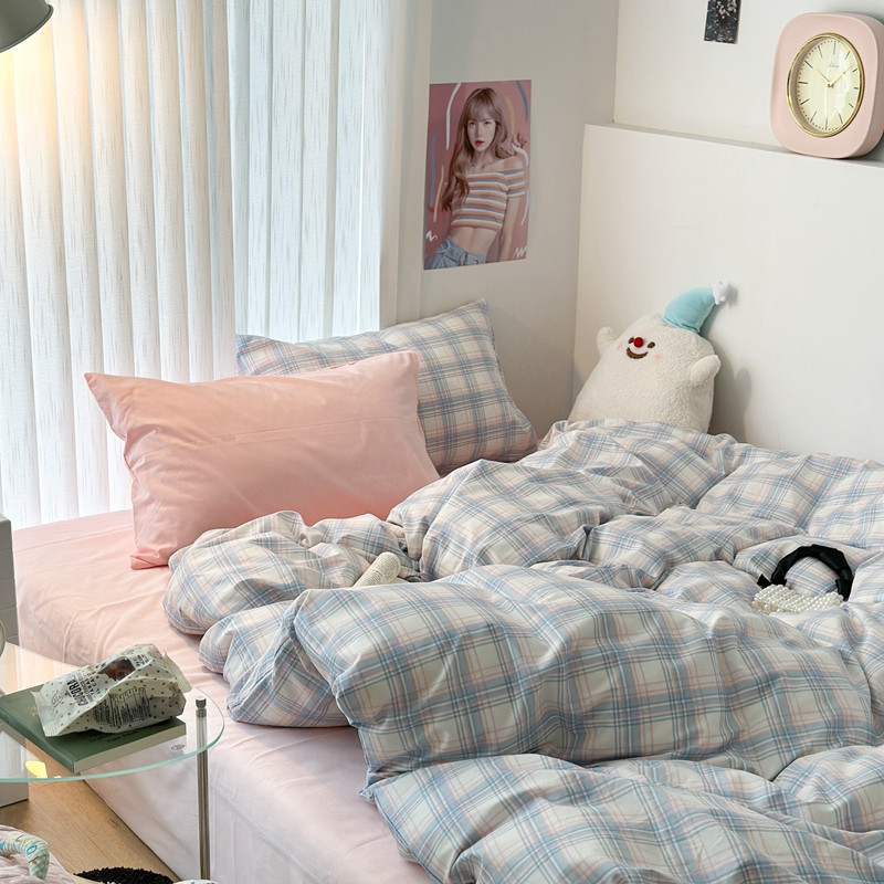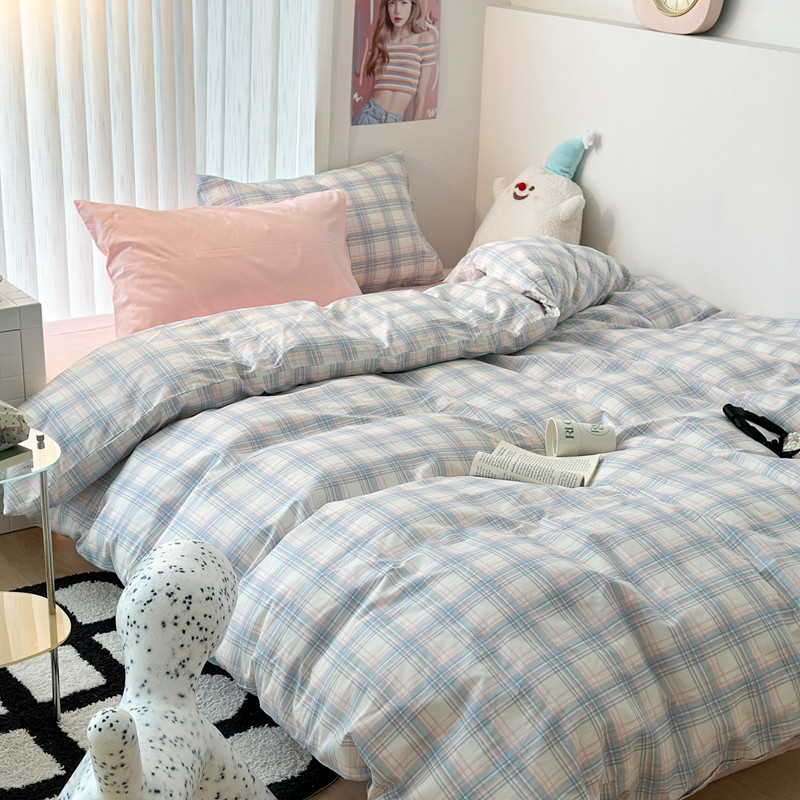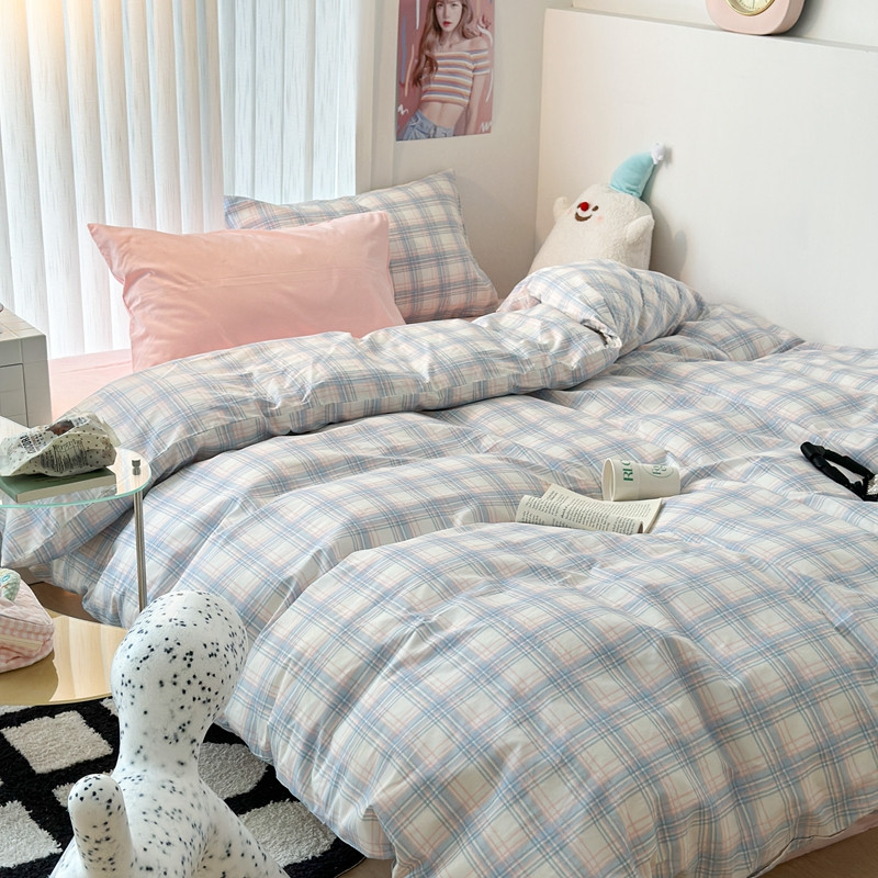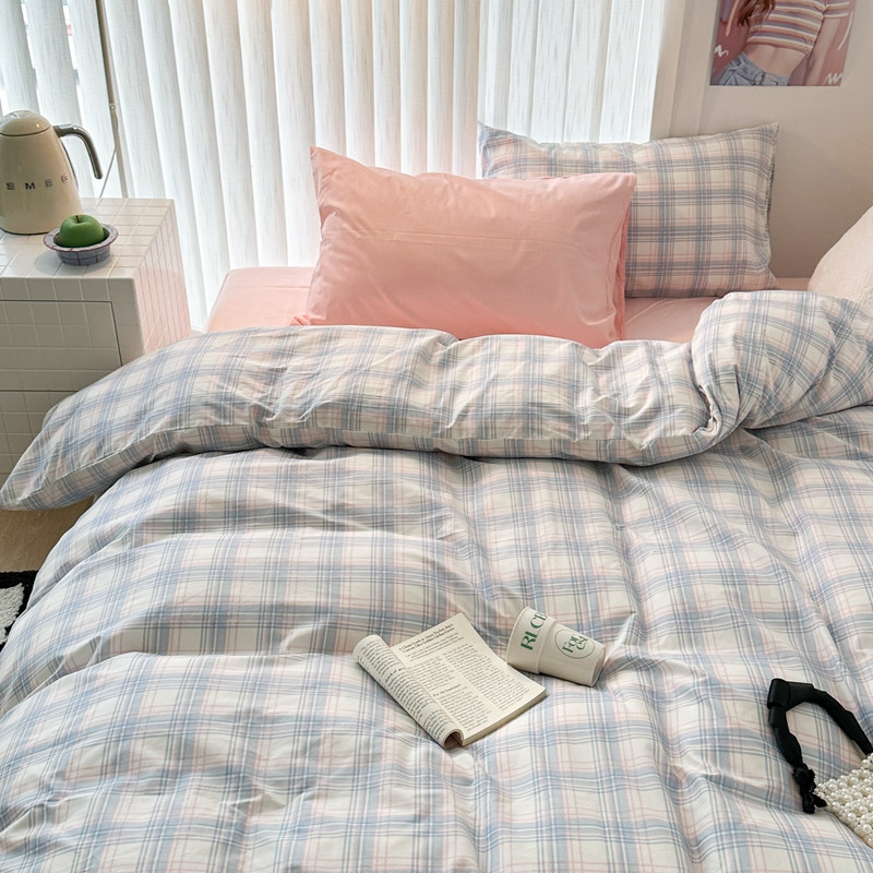 昔可 2023新款全棉ins格子混搭系列四件套 粉蓝格