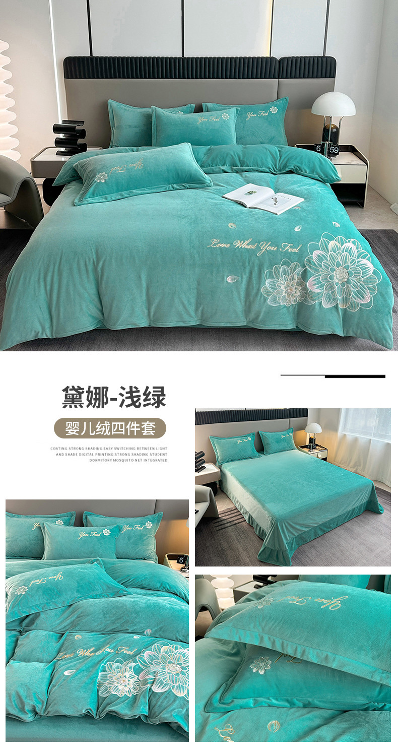 逸林家纺《原希尔顿逸林》 2023新款宝宝绒婴儿绒四件套刺绣花小香风黛娜-浅绿