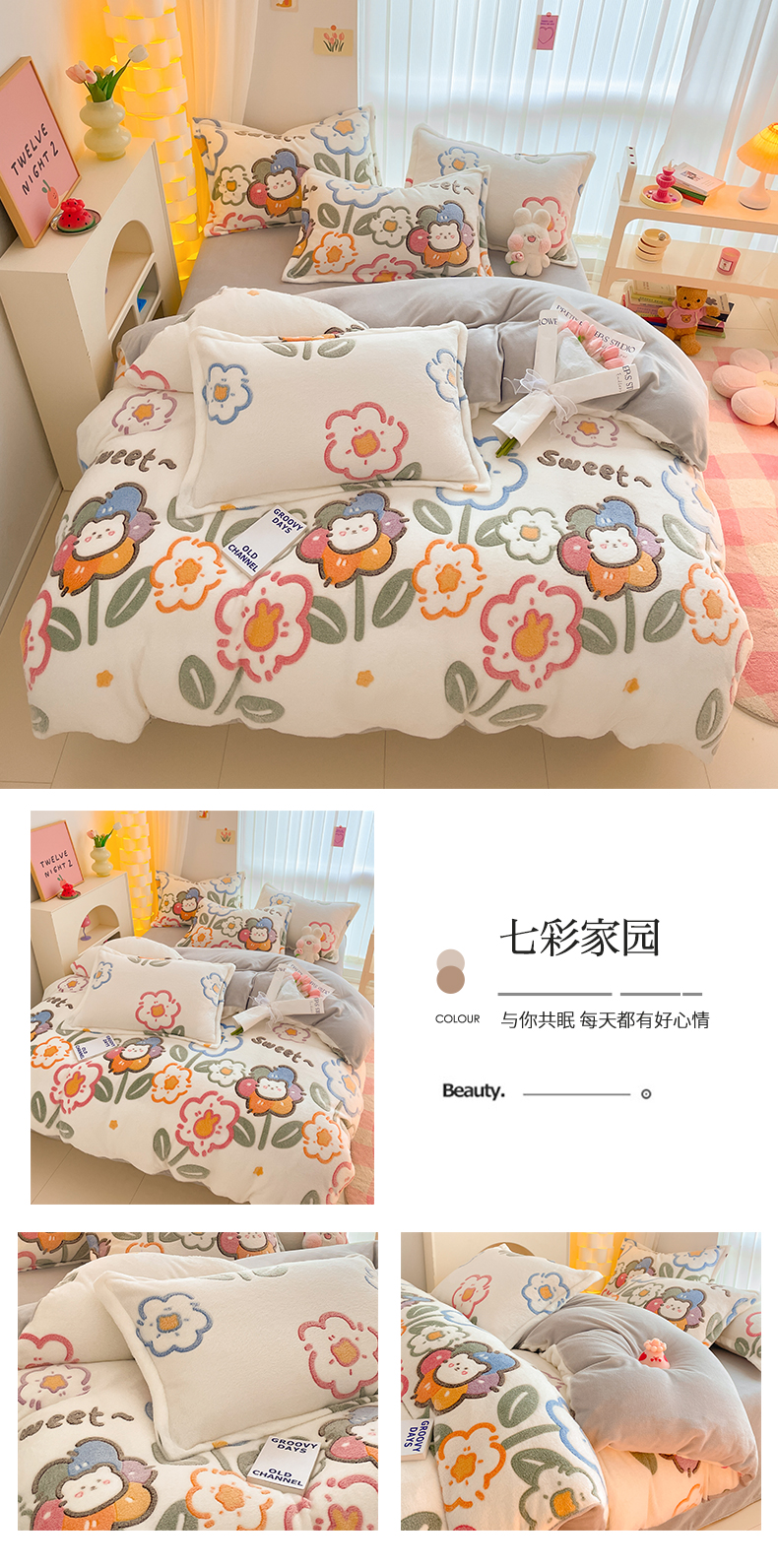 当前位置: 91家纺网 > 商品网购 > 床品套件 > 四件套 > 牛奶绒四件套 > 同田家纺 2024秋冬新品雪花绒牛奶绒印花四件套 七彩家园