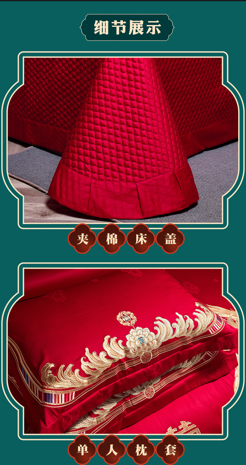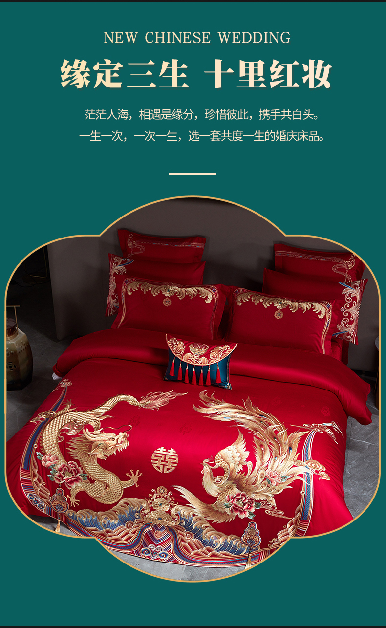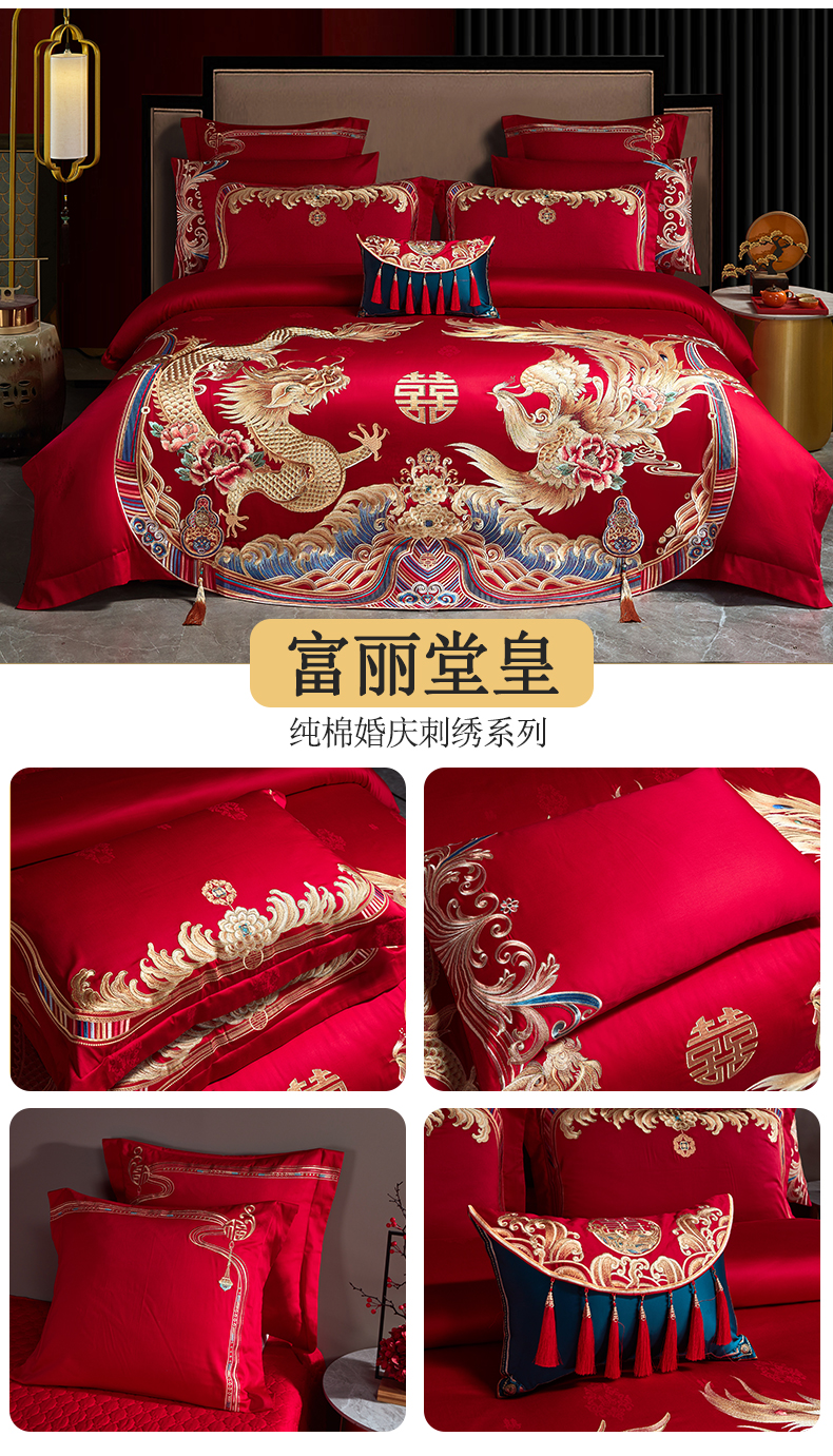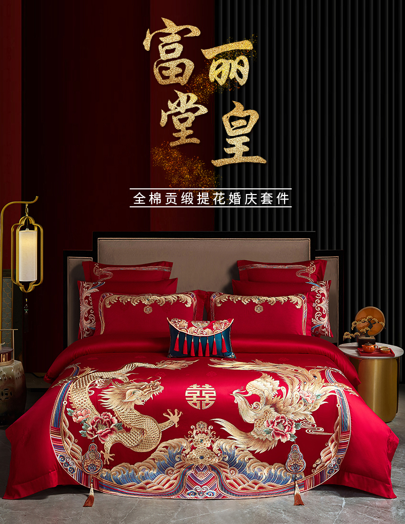 当前位置: 91家纺网 > 商品网购 > 床品套件 > 四件套 > 婚庆四件套 > 宏羽纺 2023新款高支高密全棉贡缎提花婚庆套件 富丽堂皇