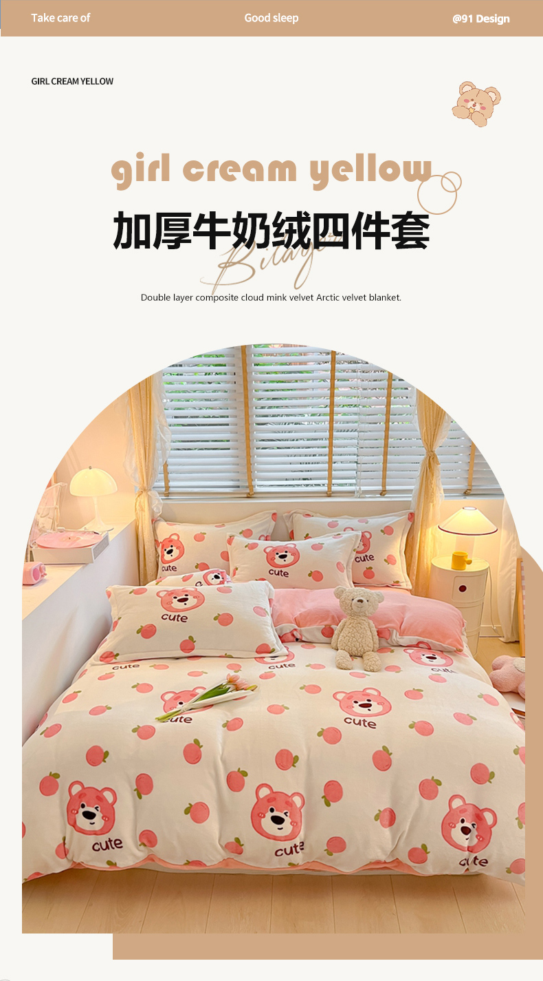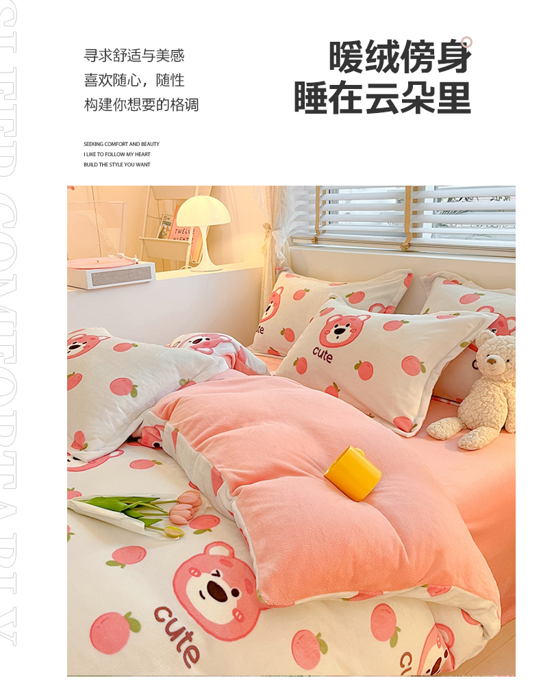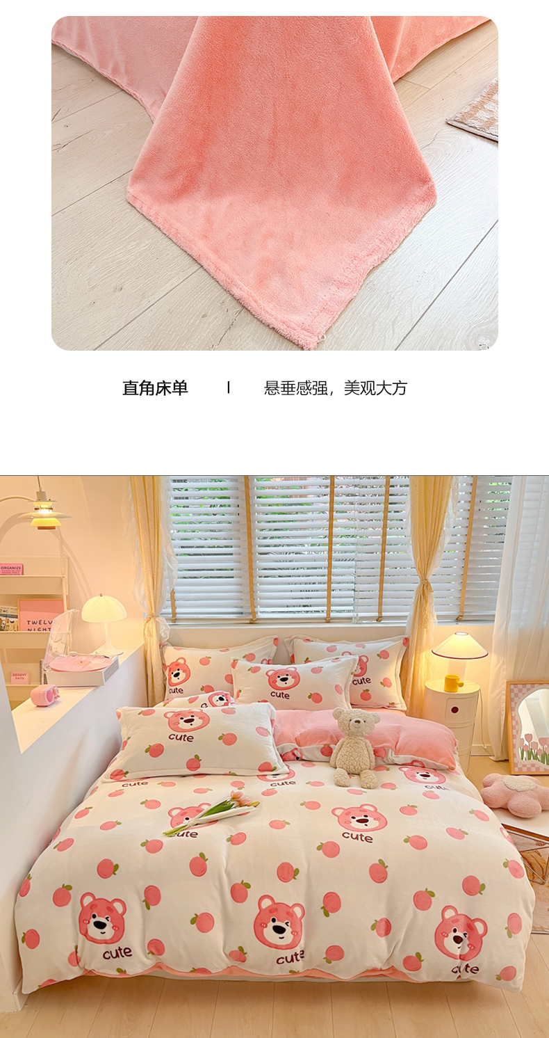 佰亿莱 2025直播新款印花小清新法莱绒牛奶绒四件套 橘子熊