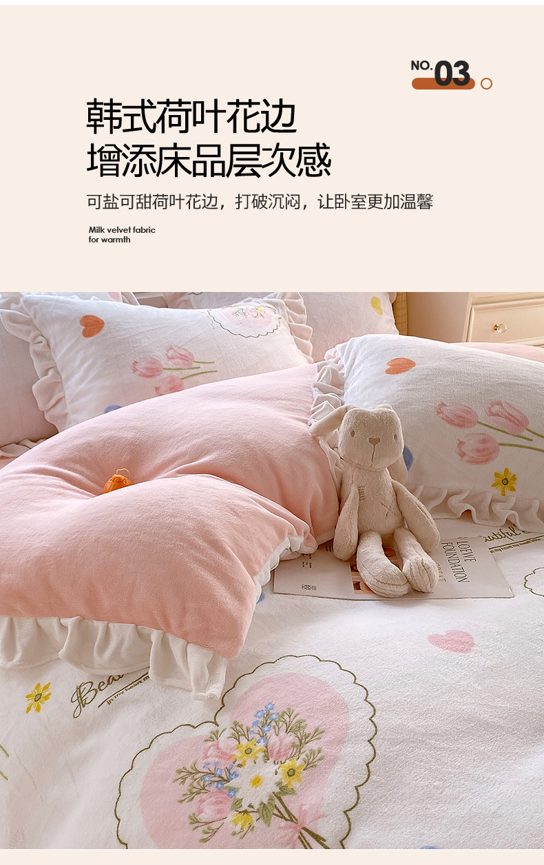 (总)宜家坊 2023新款直播韩版印花花边款牛奶绒四件套,比格熊,草莓兔,春暖花开,告白,加油鸭,流星花园,萌萌熊,牛油果,千鸟格,小女孩,一见倾心,郁金香