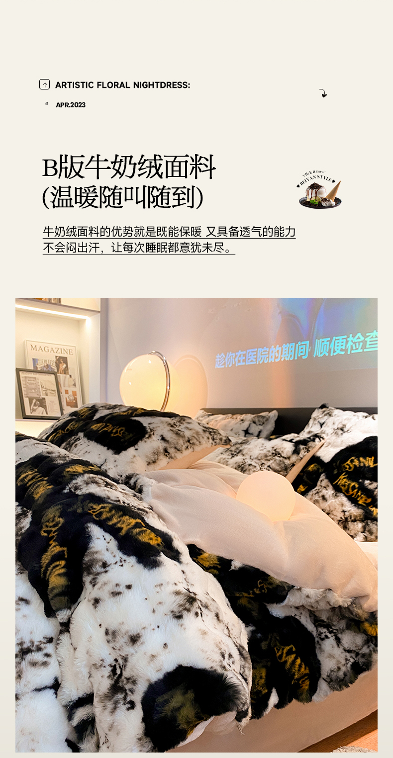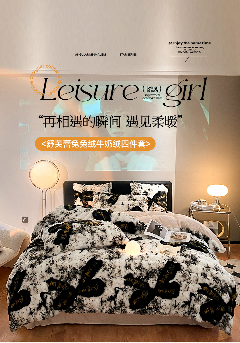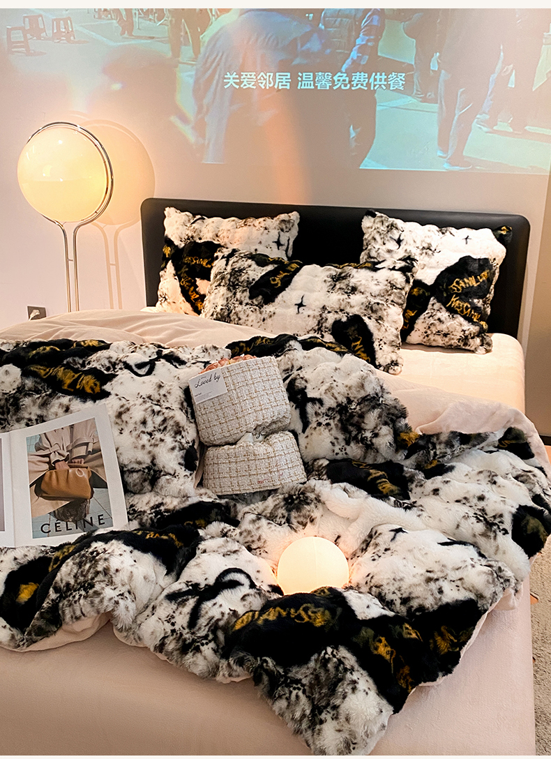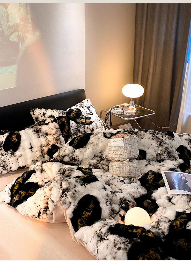 澳梵家居 2023舒芙蕾印花兔兔绒牛奶绒四件套 黑金蝴蝶结