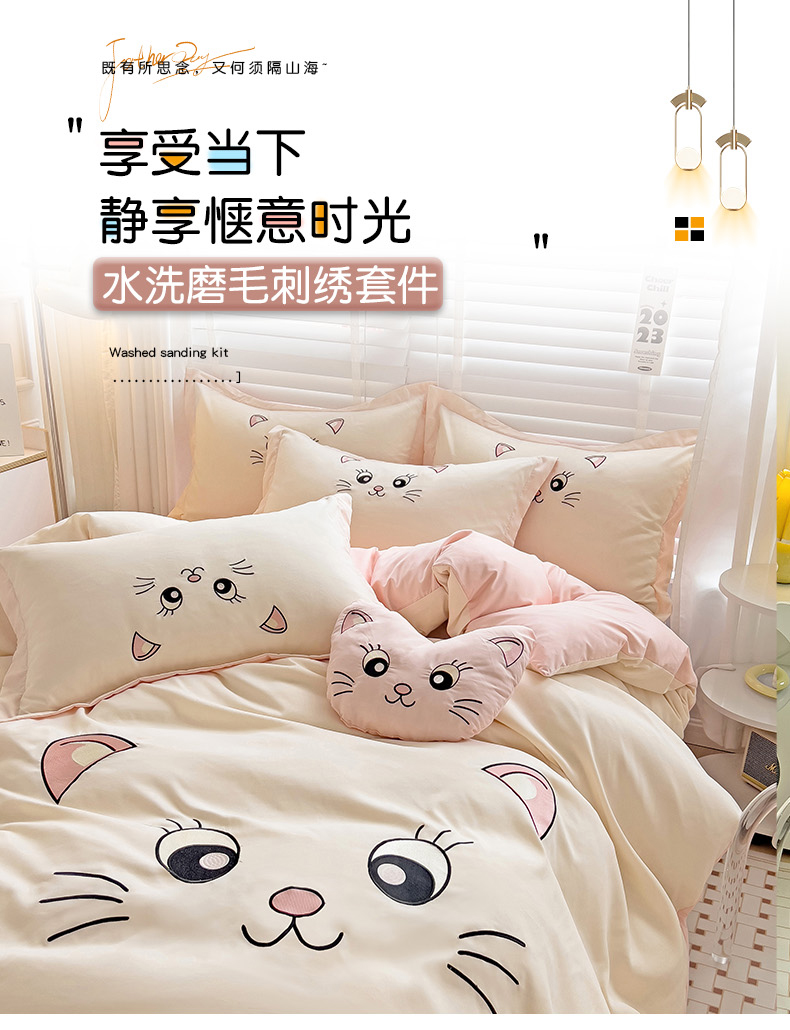 娜娜 2023新款亲肤柔软水洗磨毛毛巾绣四件套-咪咪猫 咪咪猫-奶昔白