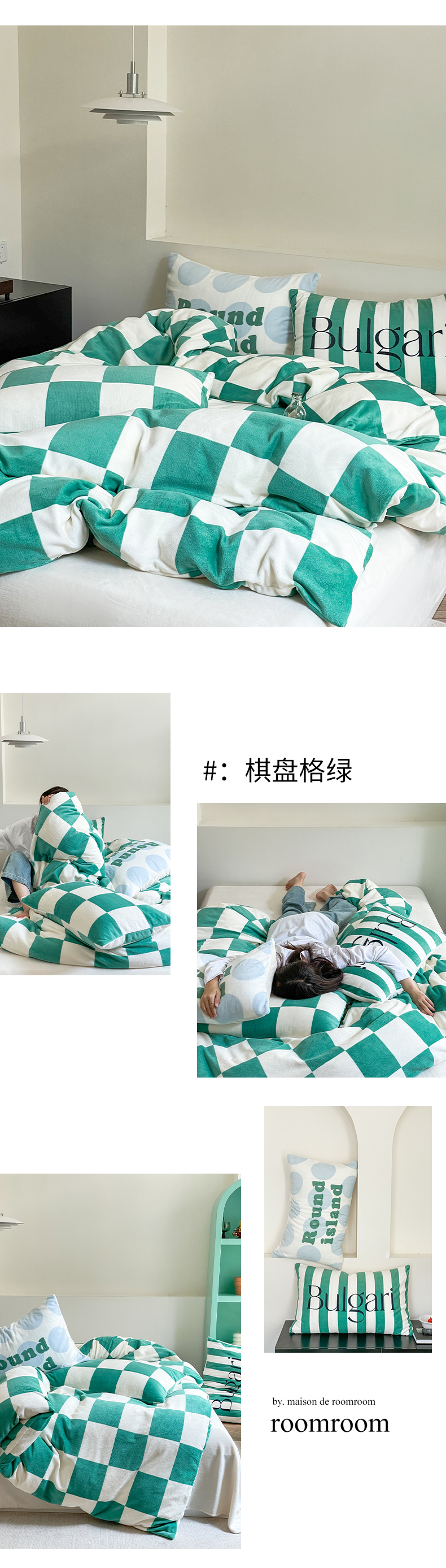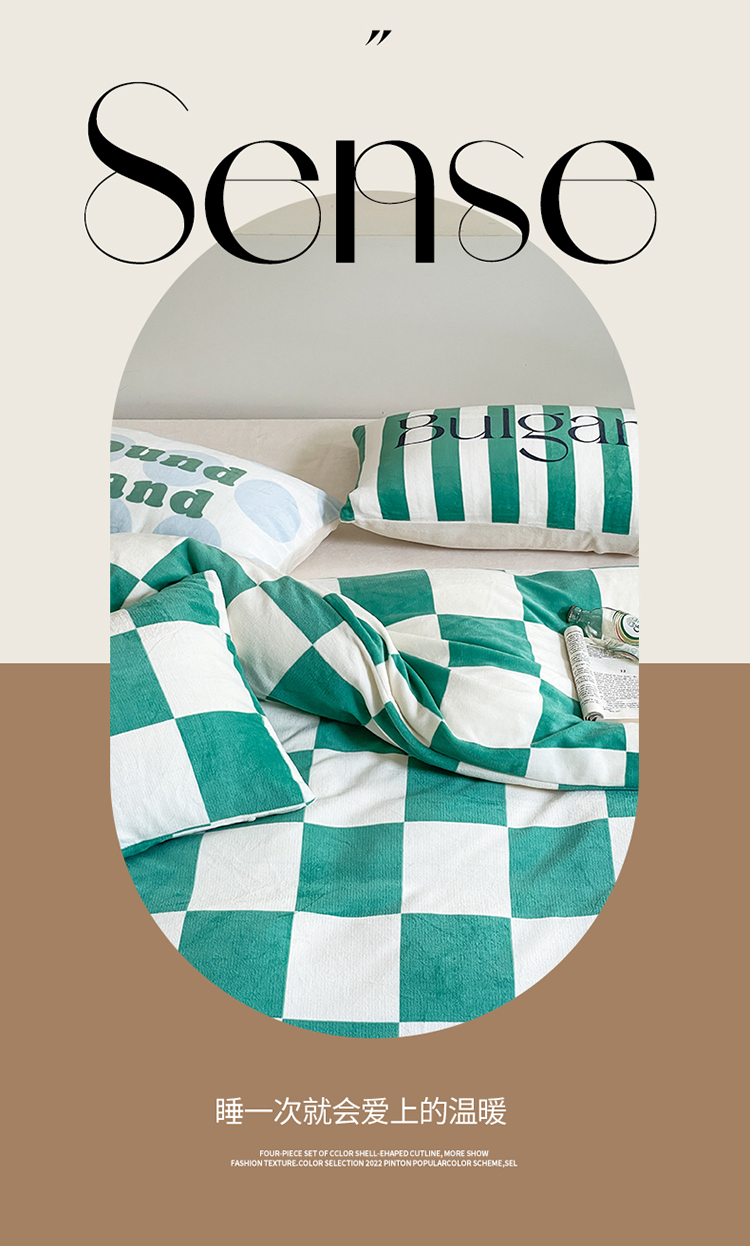 商品名称:圆岛家纺 2023新款原创牛奶绒印花保暖四件套 棋盘格绿