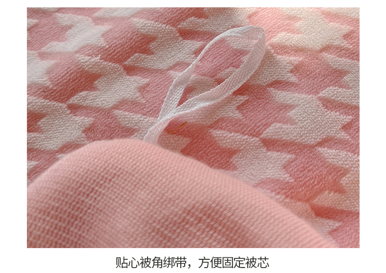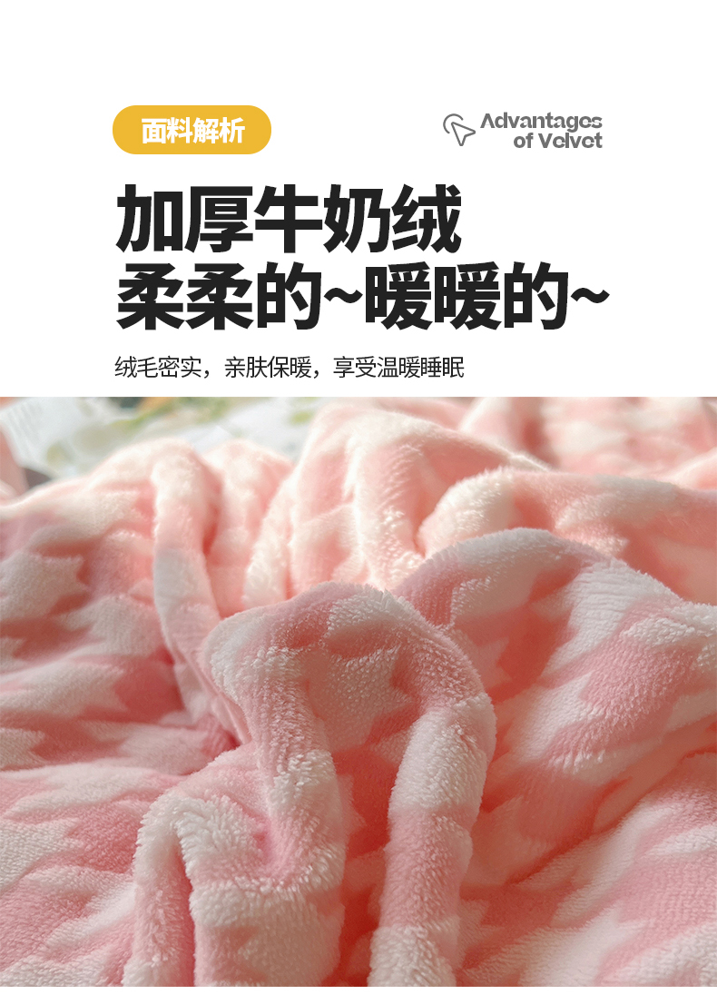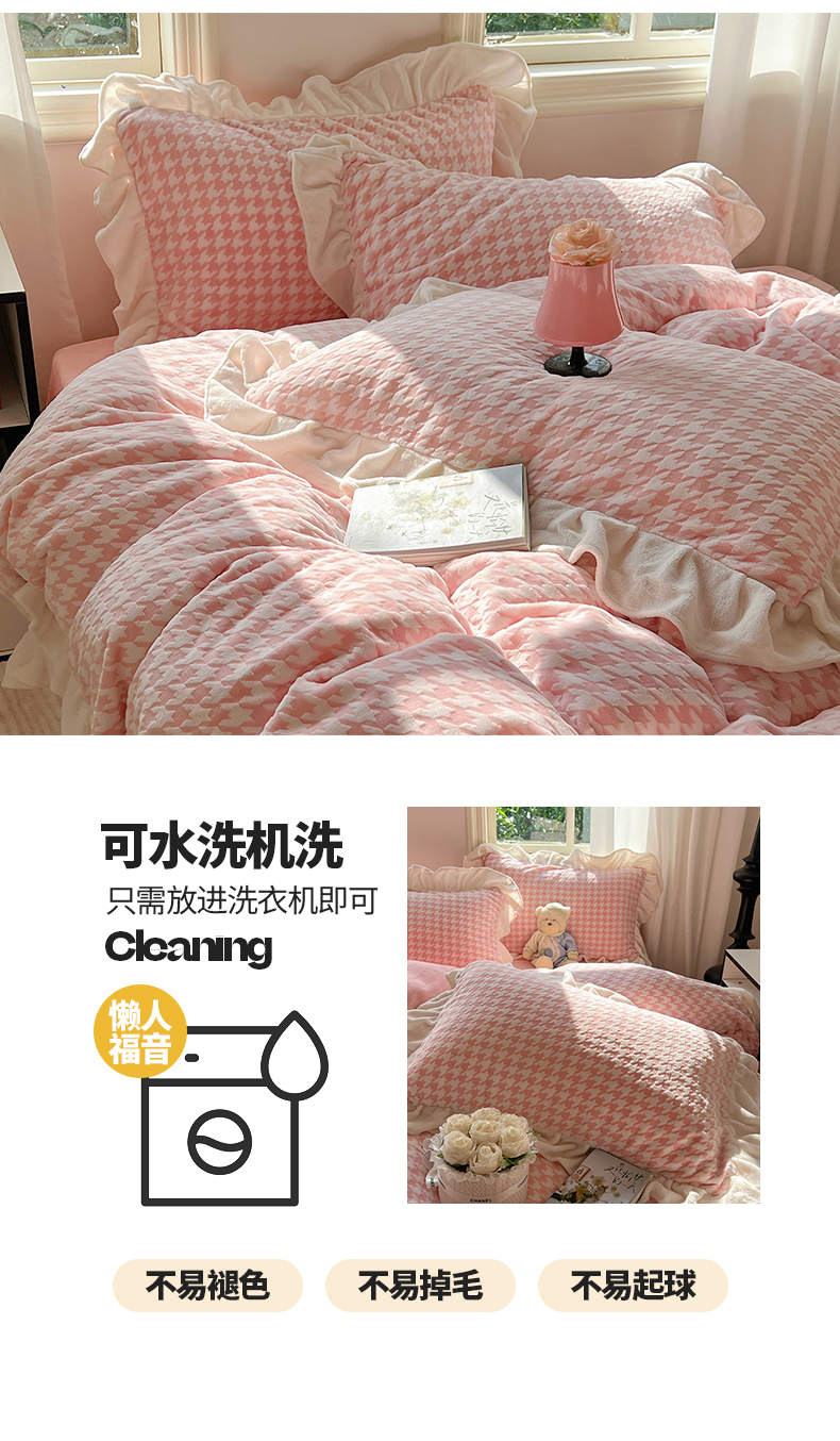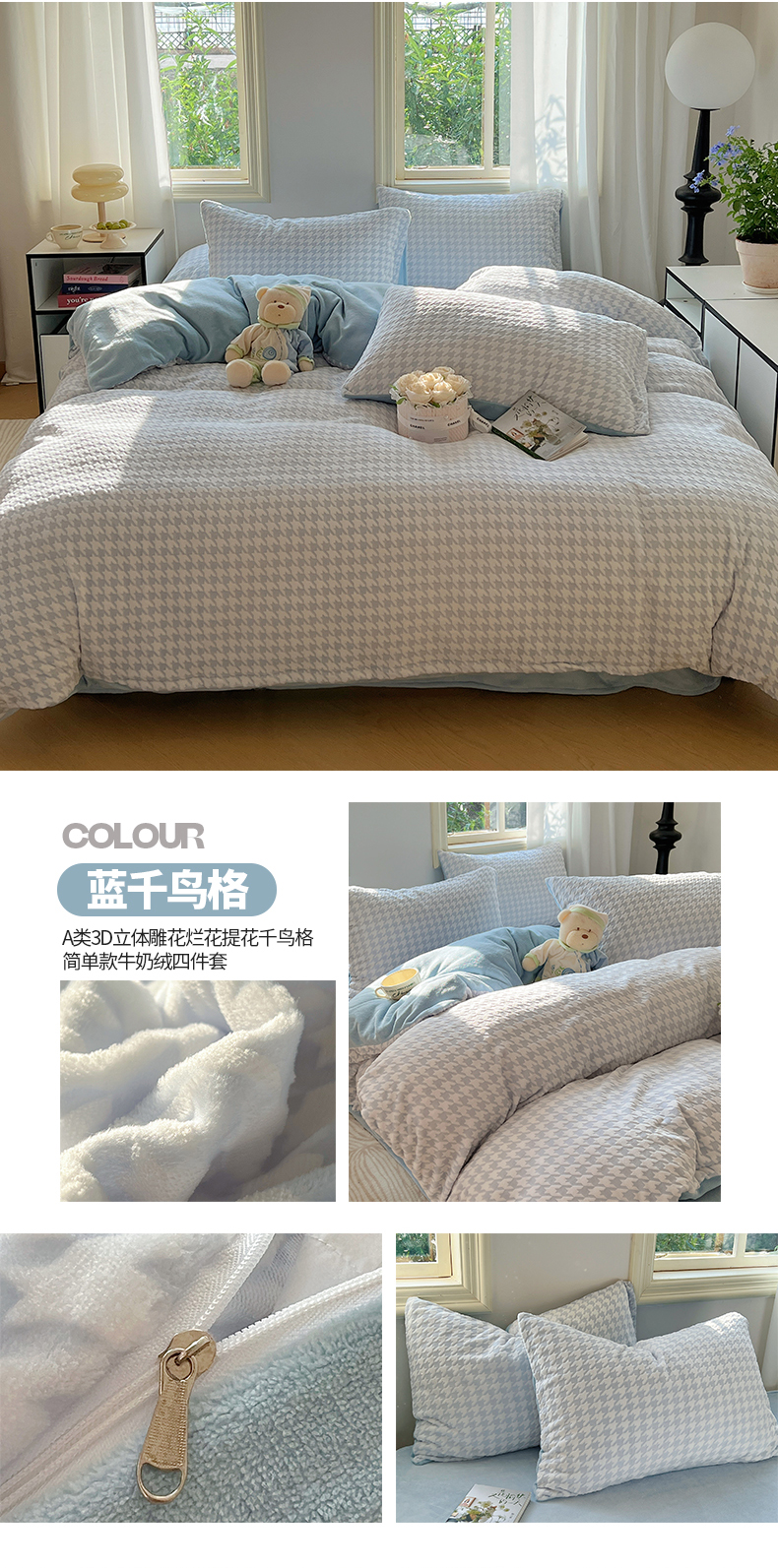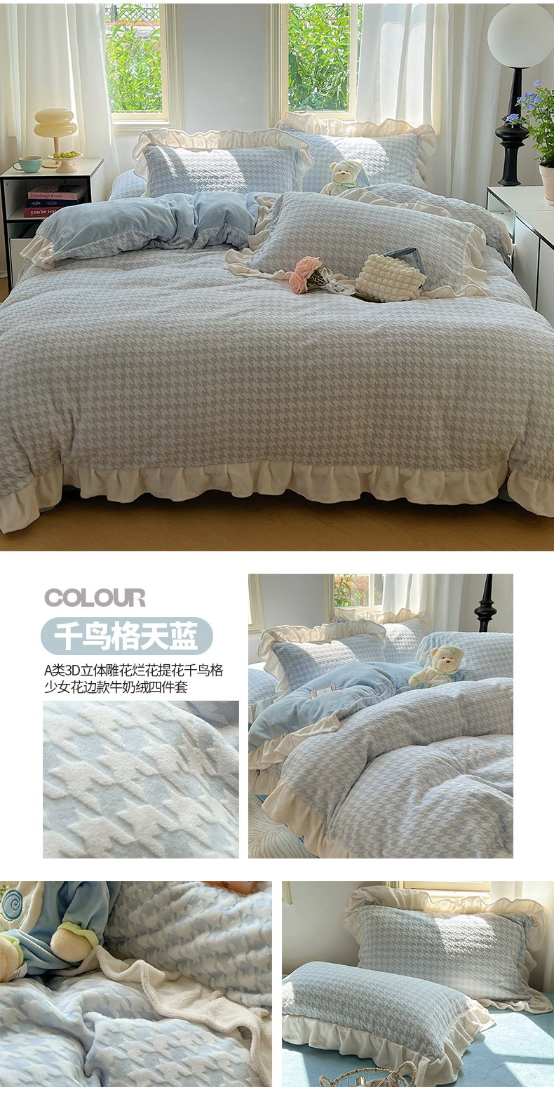 商品名称:(总)桃子家居 2023新款A类高克重230克3D立体雕花烂花提花千鸟格少女花边款简单款牛奶绒四件套