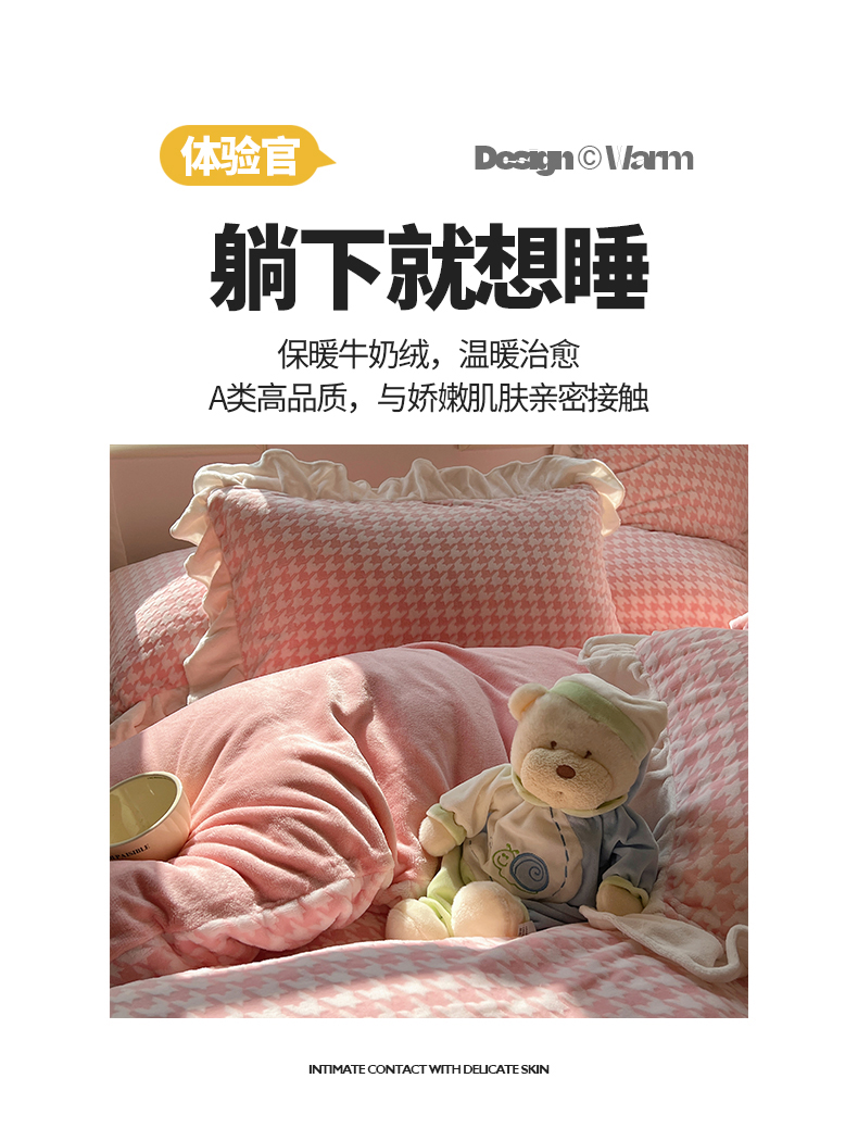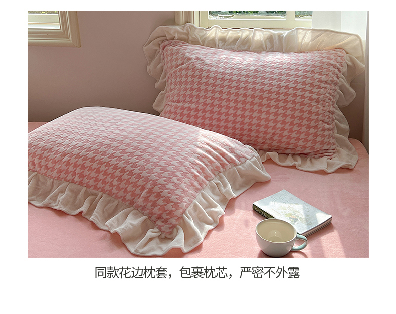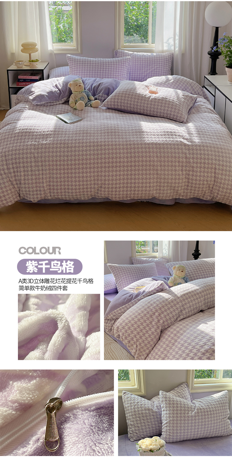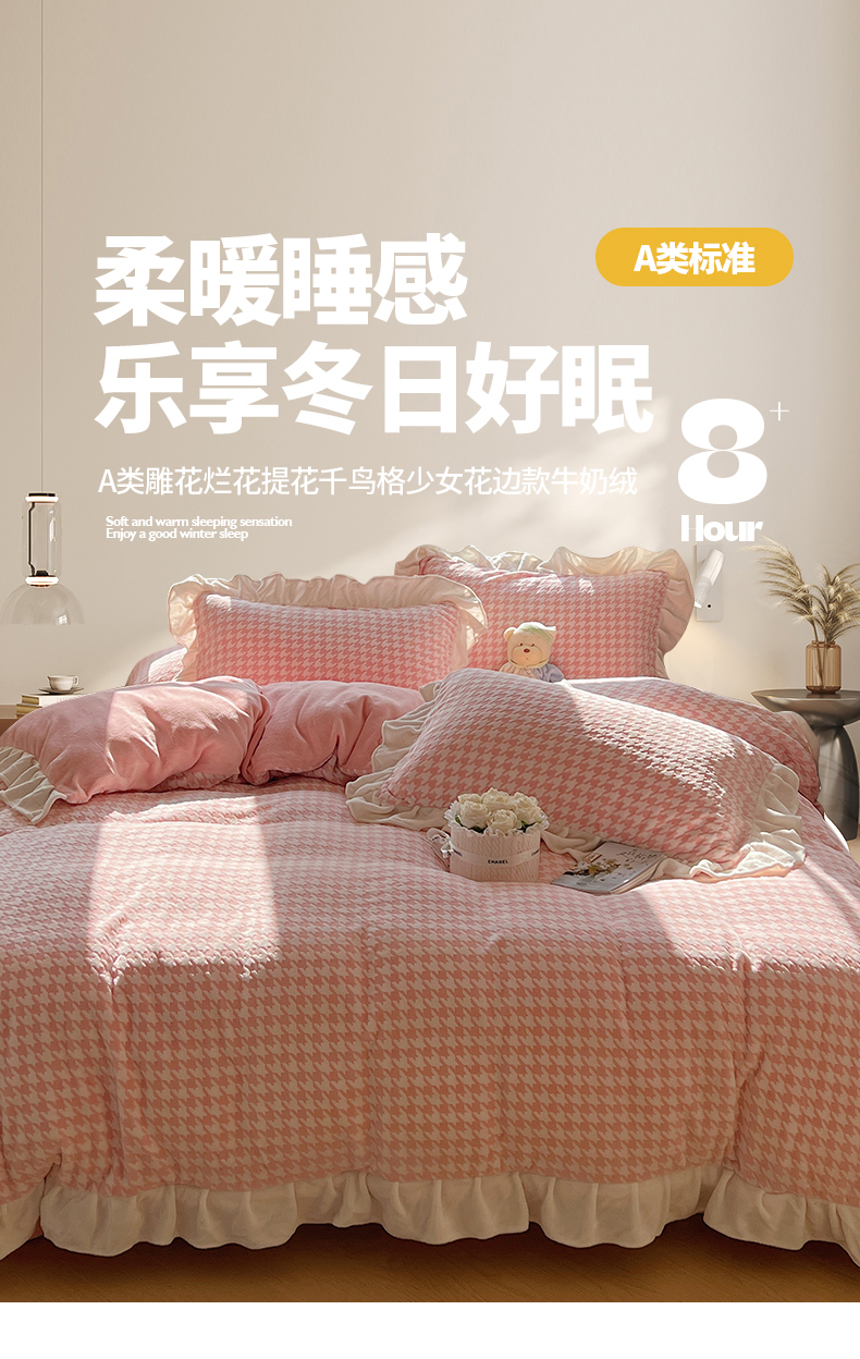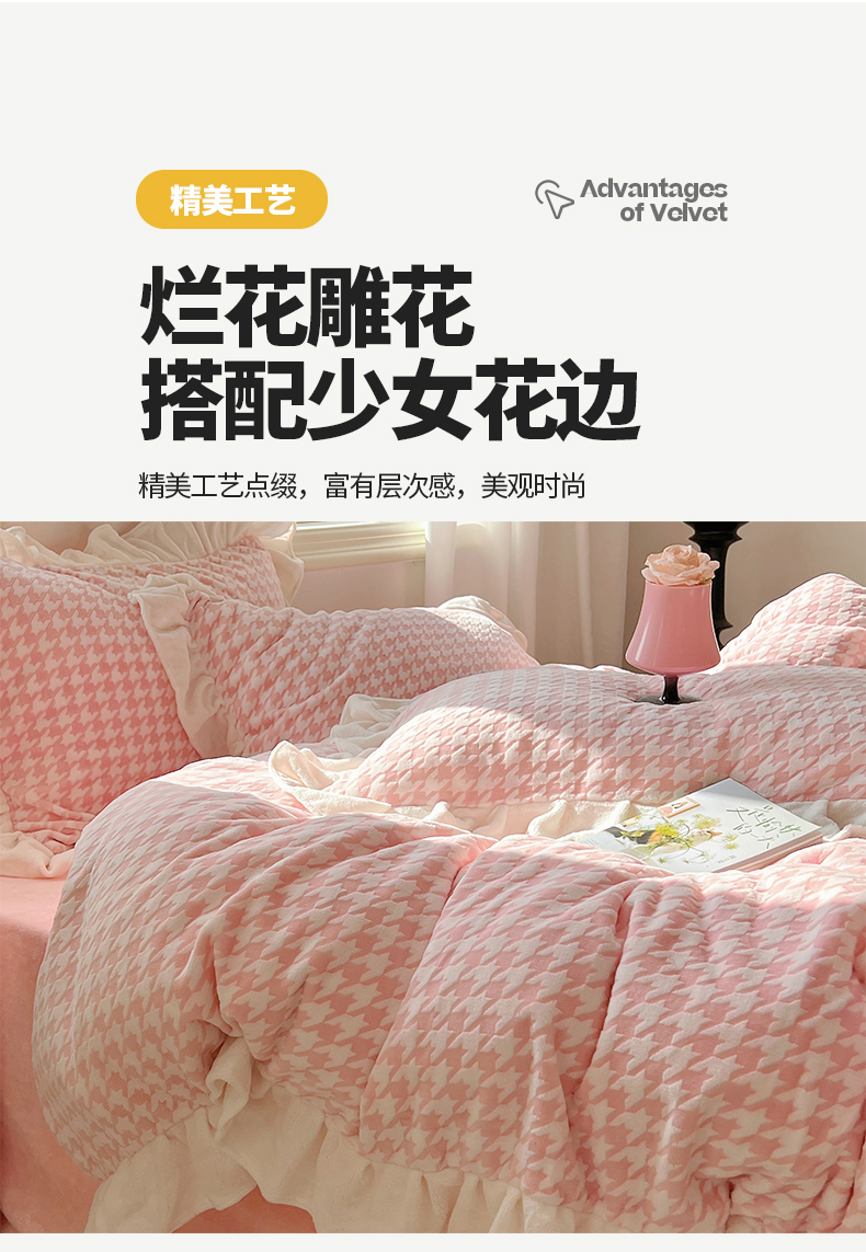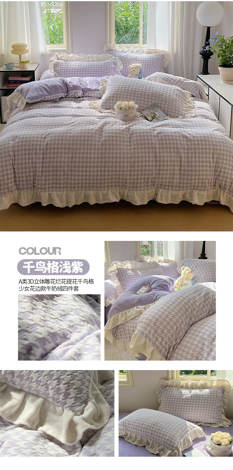 (总)桃子家居 2023新款A类高克重230克3D立体雕花烂花提花千鸟格少女花边款简单款牛奶绒四件套