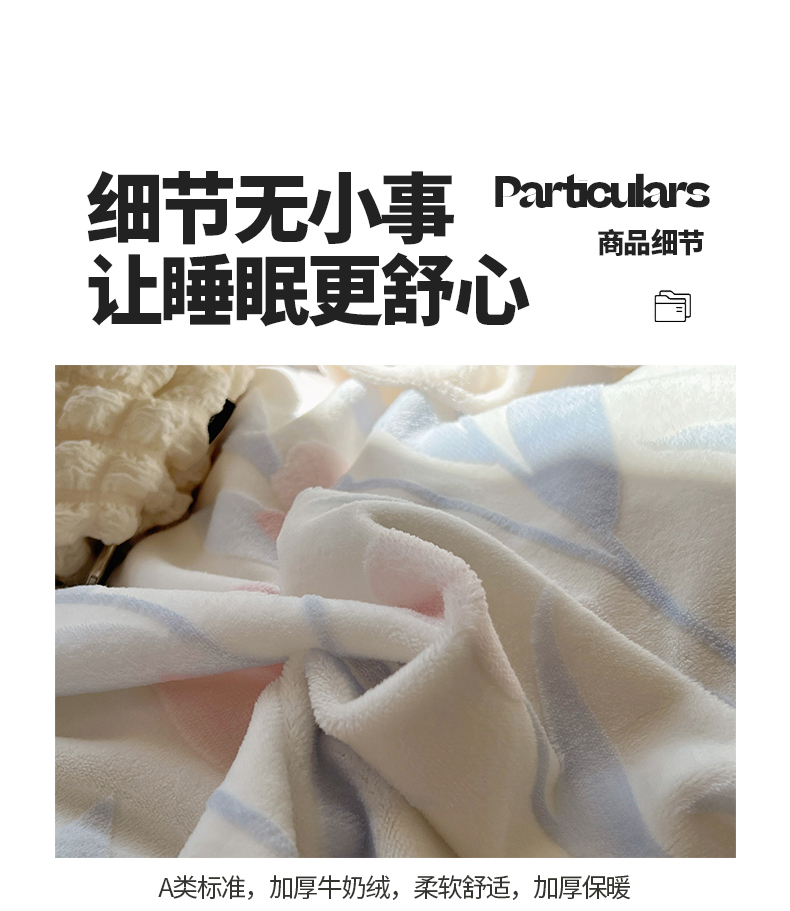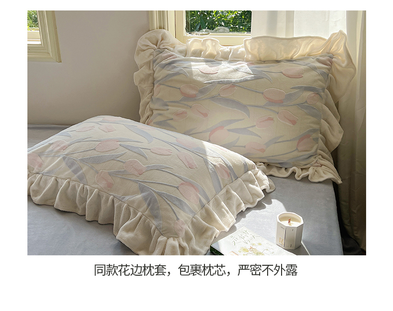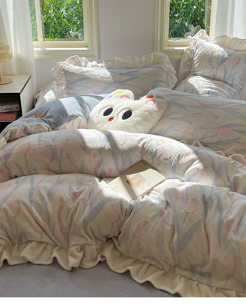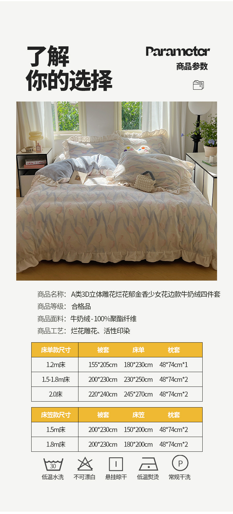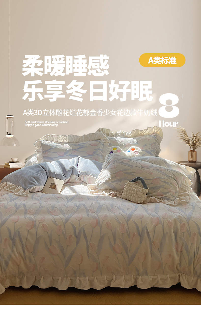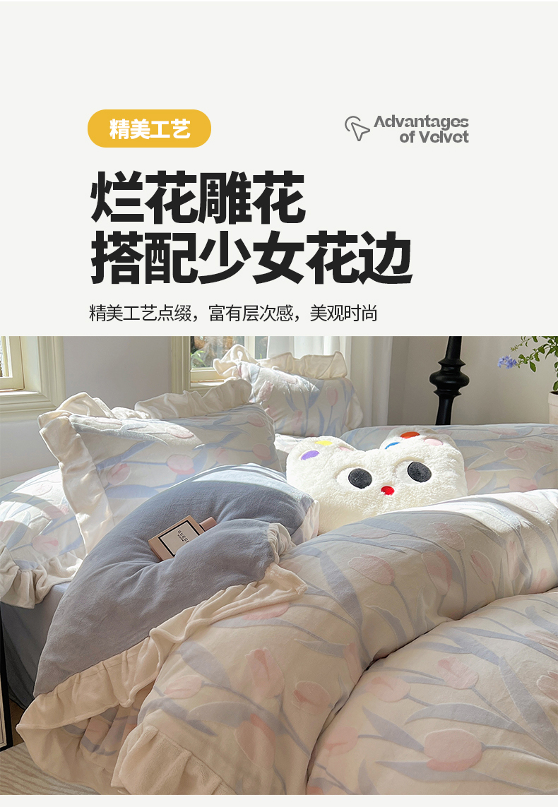 当前位置: 91家纺网 > 商品网购 > 床品套件 > 四件套 > 牛奶绒四件套 > 桃子家居 2023新款A类高克重230克3D立体雕花烂花提花着色郁金香少女花边款简单款牛奶绒四件套 绒花边烂花-郁金香清新蓝