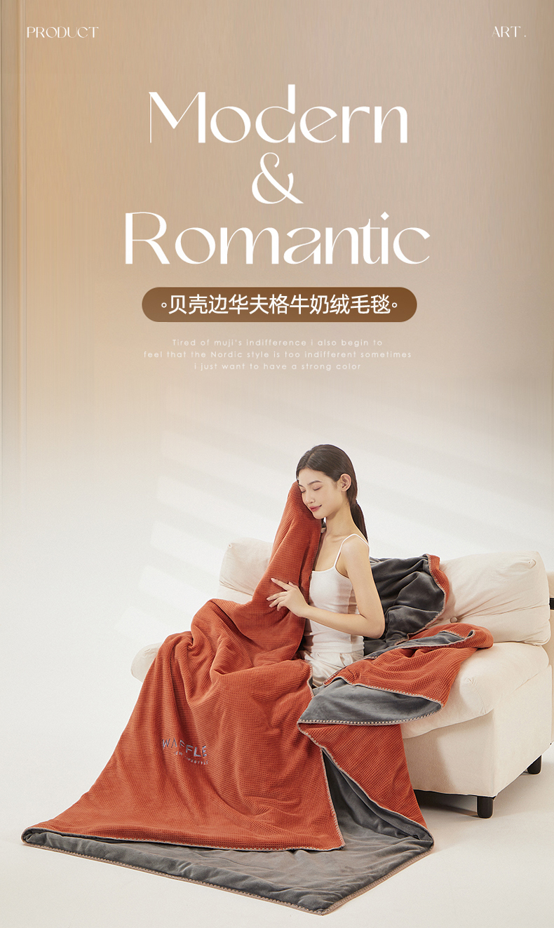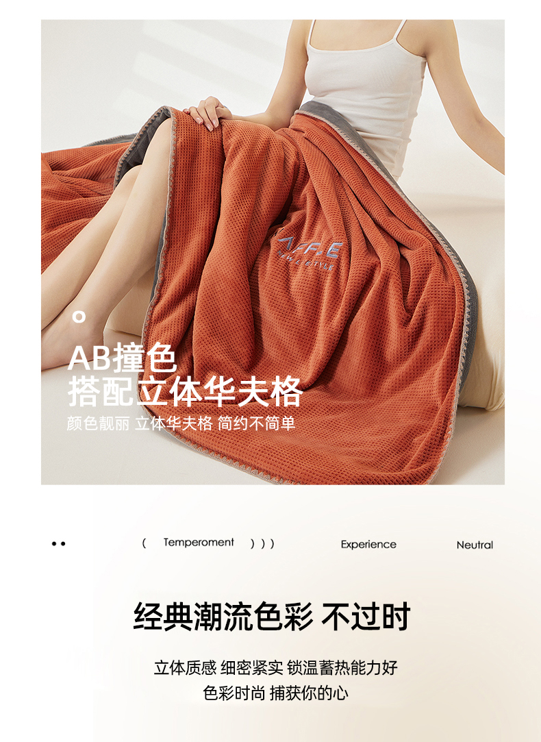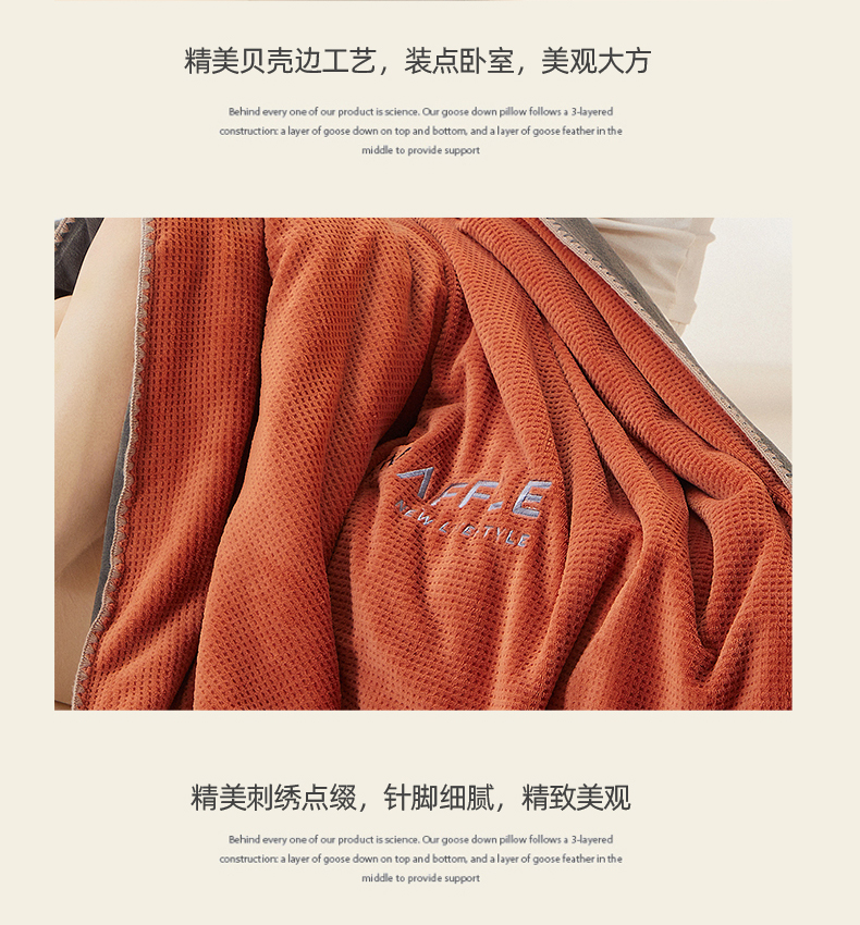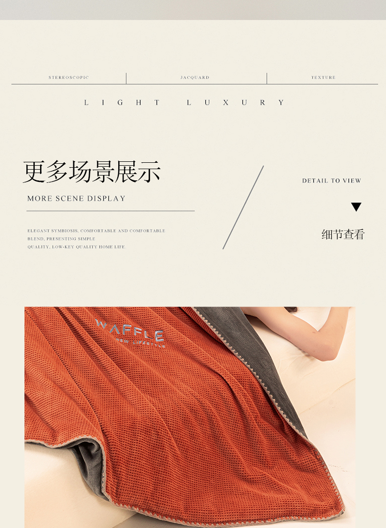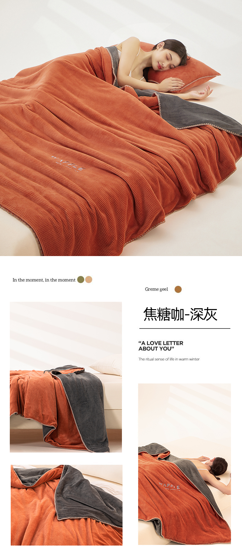 商品名称:吾诺 2023秋冬华夫格牛奶绒毯子 毛毯床单床笠单品系列-多功能绒毯 焦糖咖-深灰