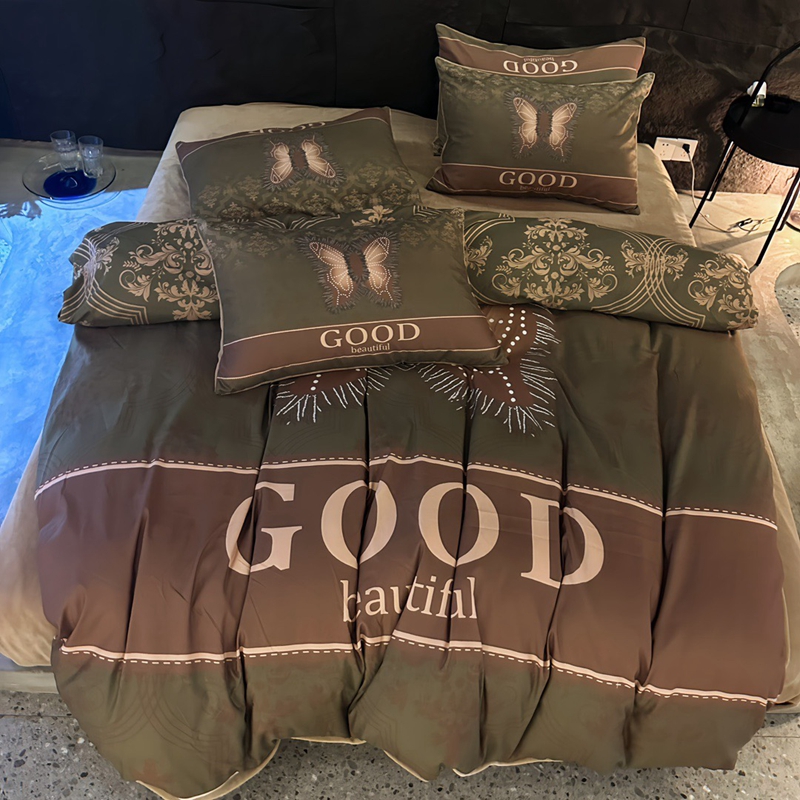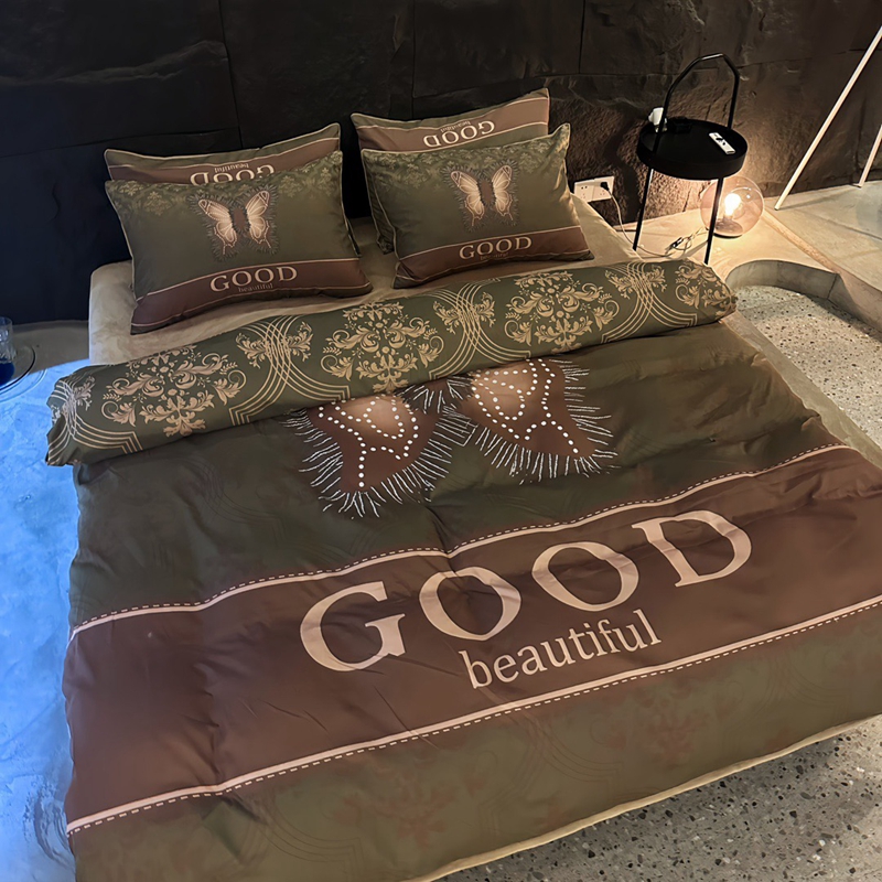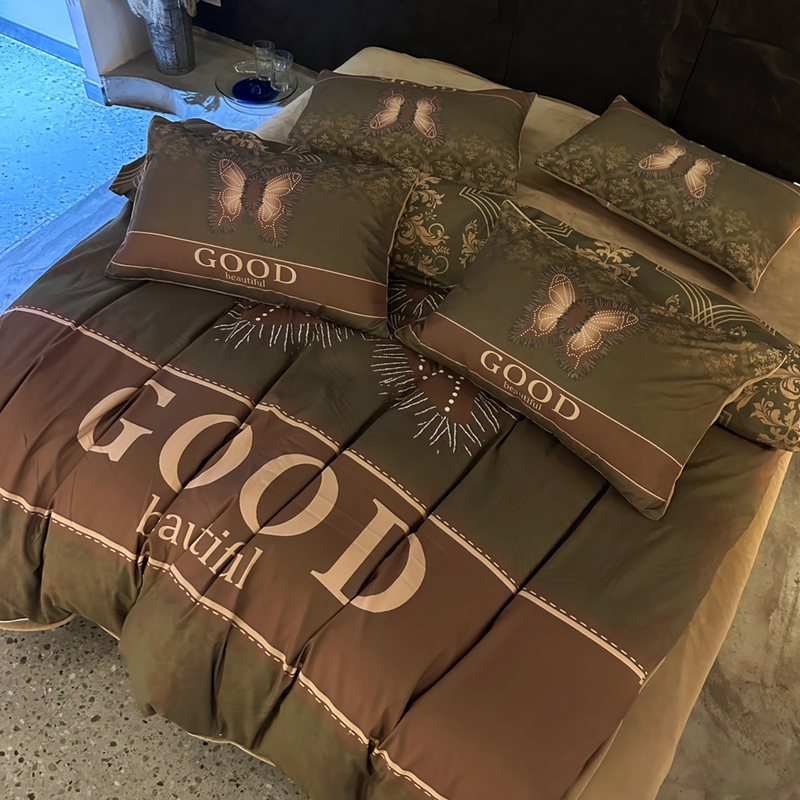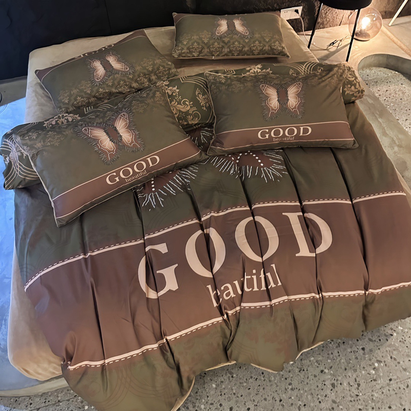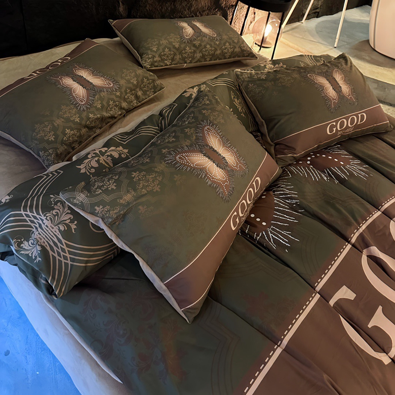 商品名称:色鬼 2023新款轻奢潮牌大牌风棉加绒四件套印花牛奶绒四件套 羽毛绿蝶
