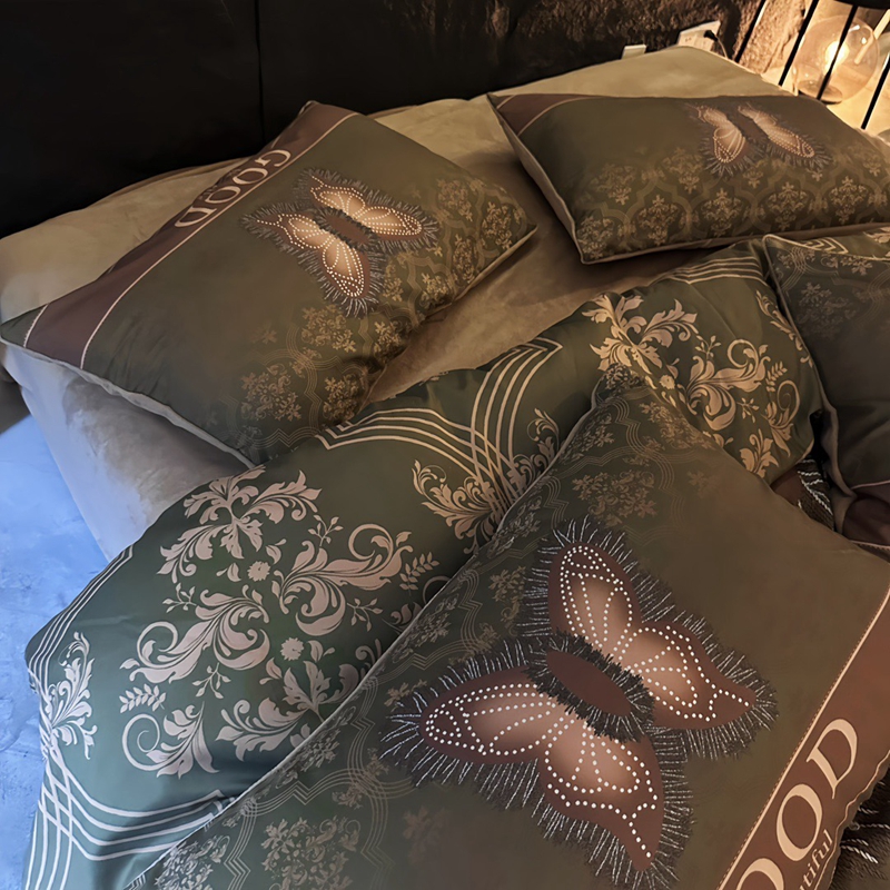 色鬼 2023新款轻奢潮牌大牌风棉加绒四件套印花牛奶绒四件套 羽毛绿蝶