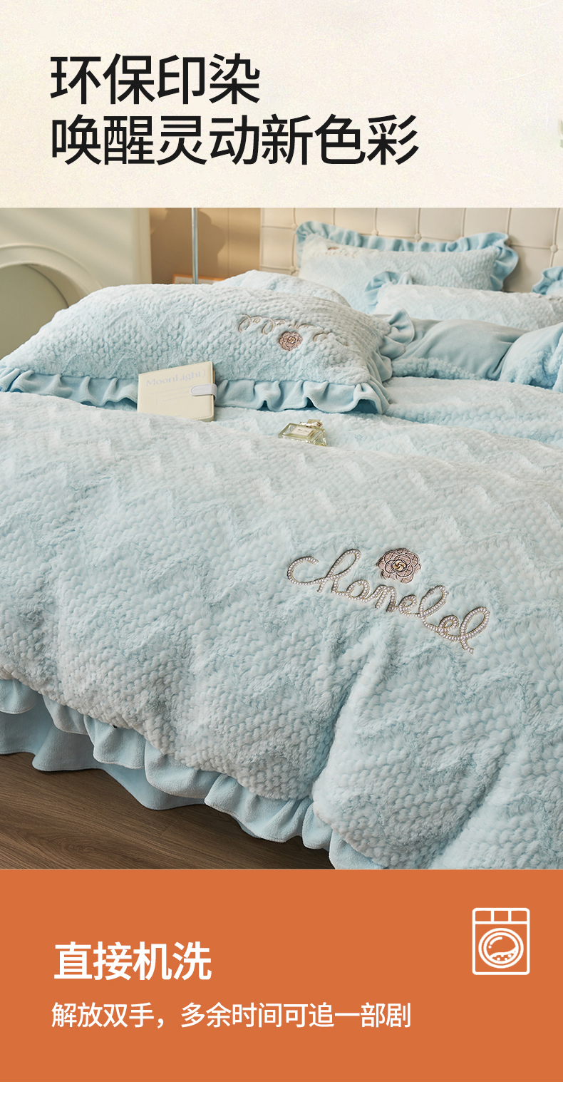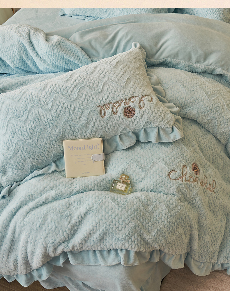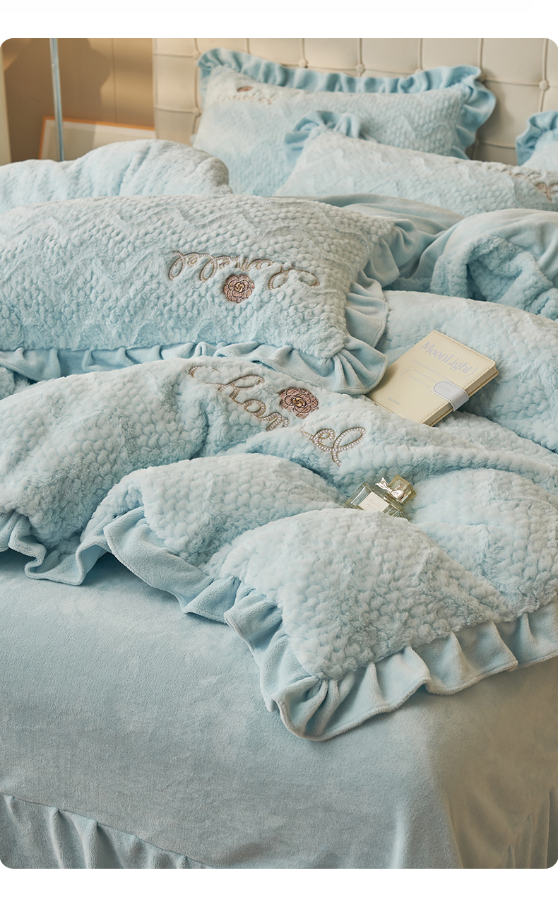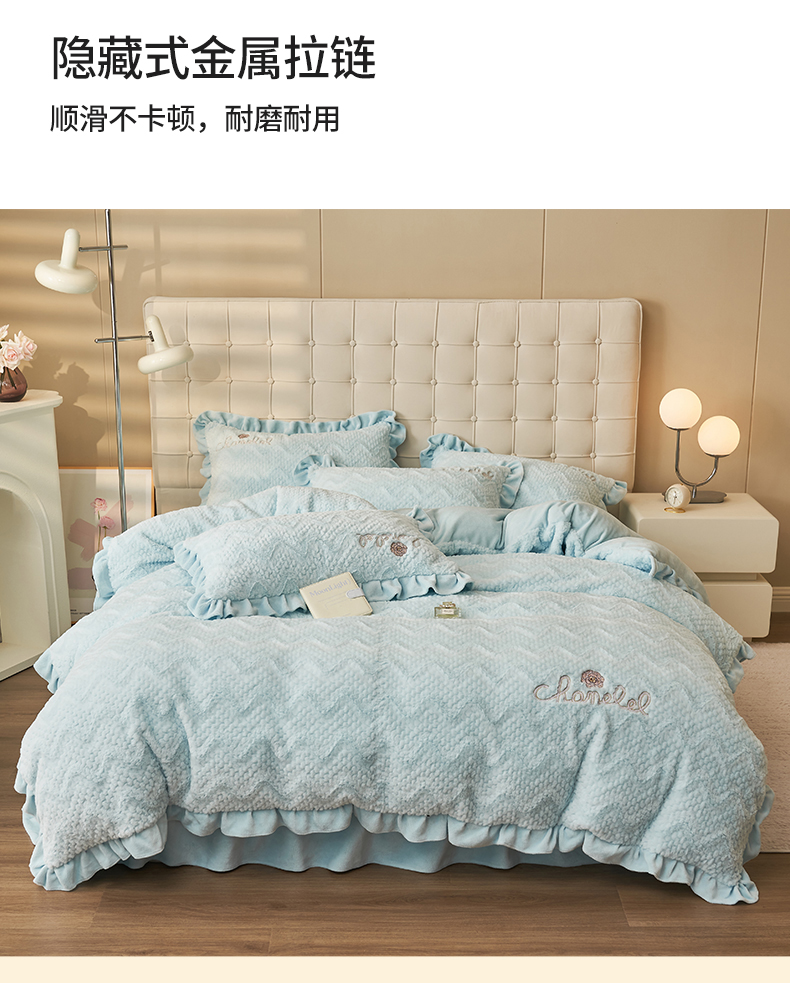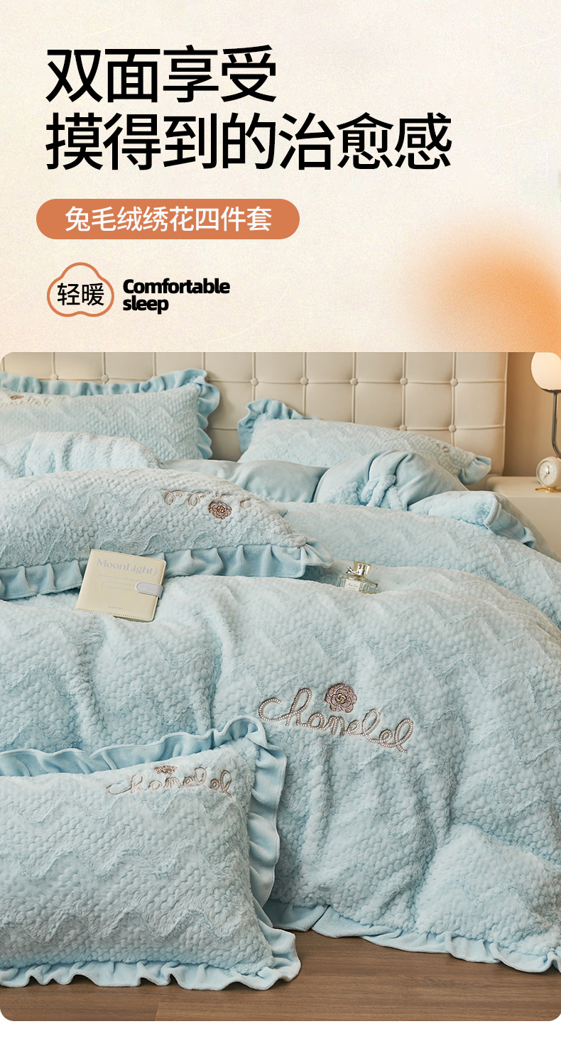 商品名称:恒爱家纺 2023新款兔毛绒绣花四件套 波浪款-浅兰
