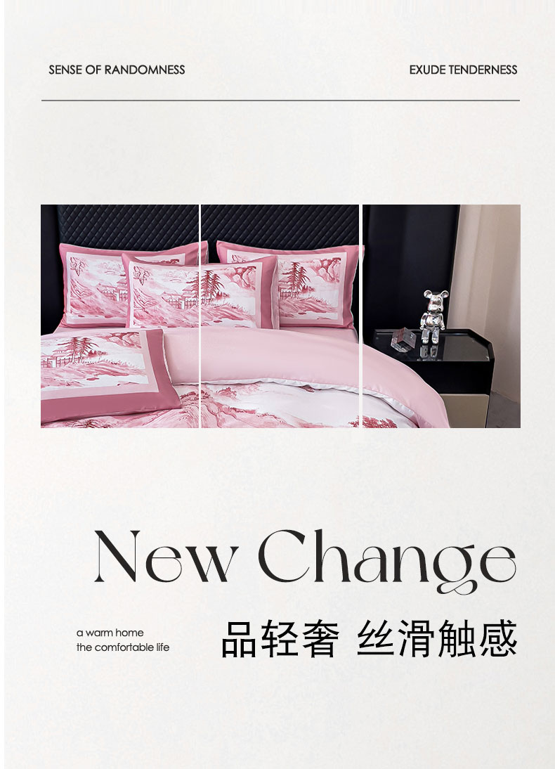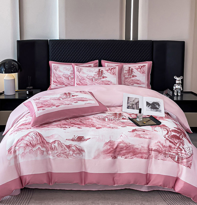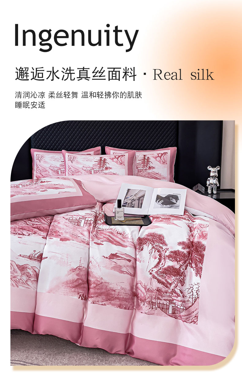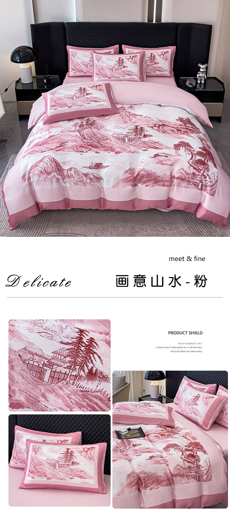 商品名称:2024新款水洗真丝画意山水系列四件套 画意山水-粉