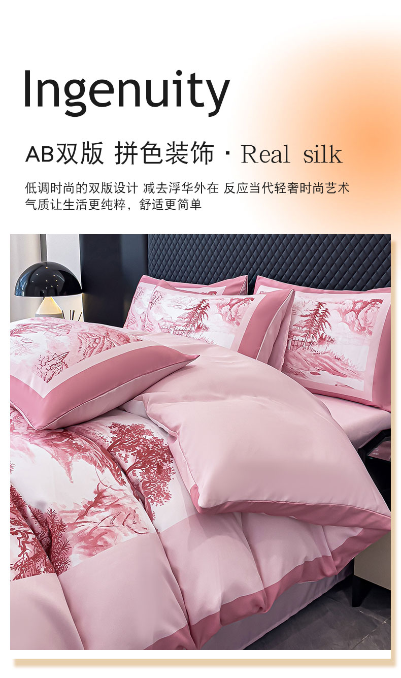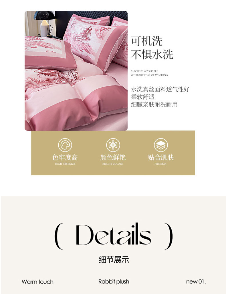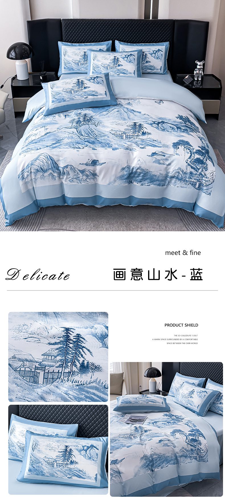 商品名称:2024新款水洗真丝画意山水系列四件套 画意山水-粉