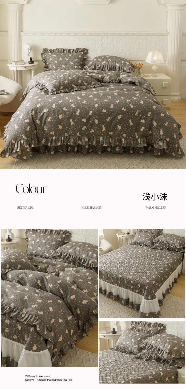 胜权 2024新款高端欧根纱全棉印花夹棉床盖四件套 浅小沫