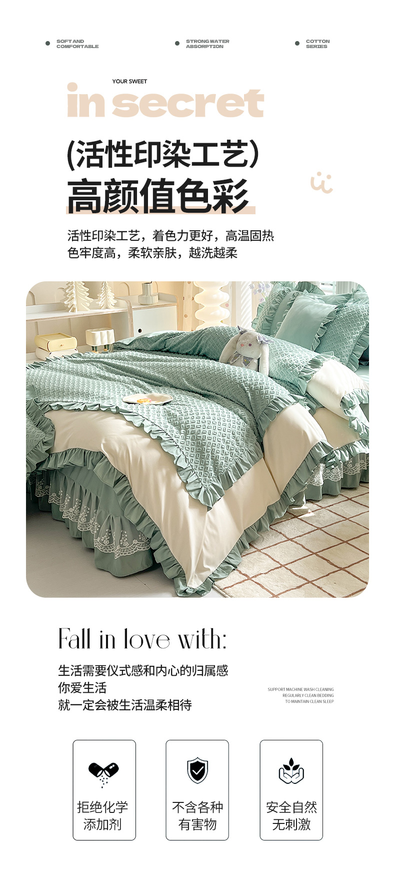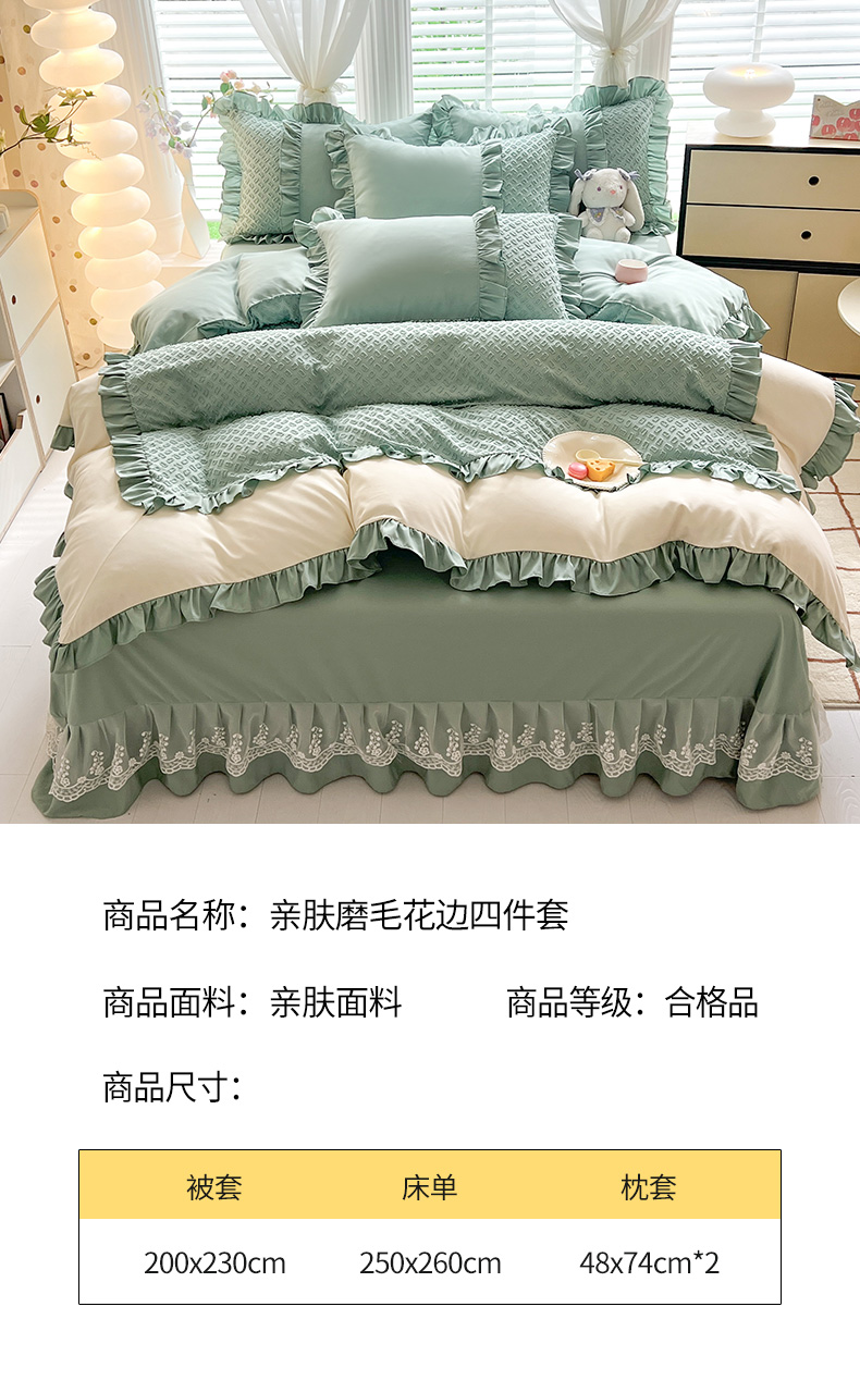 商品名称:芭比蔓家纺 2024新款亲肤磨毛花边四件套---至爱 绿