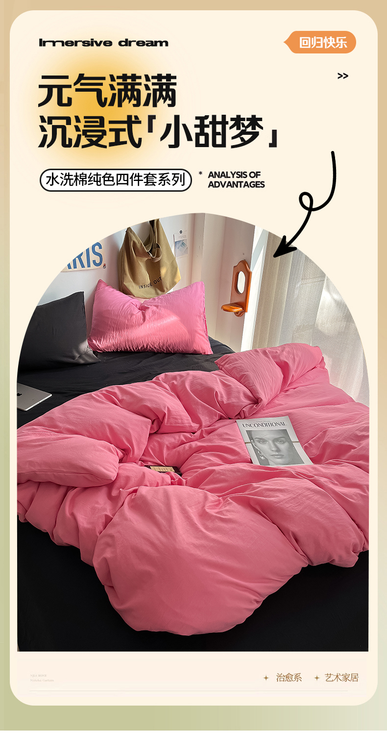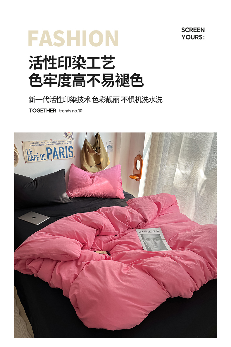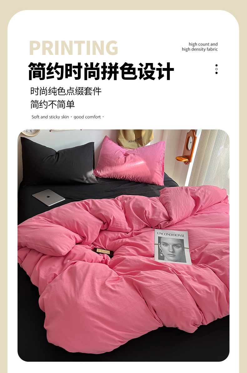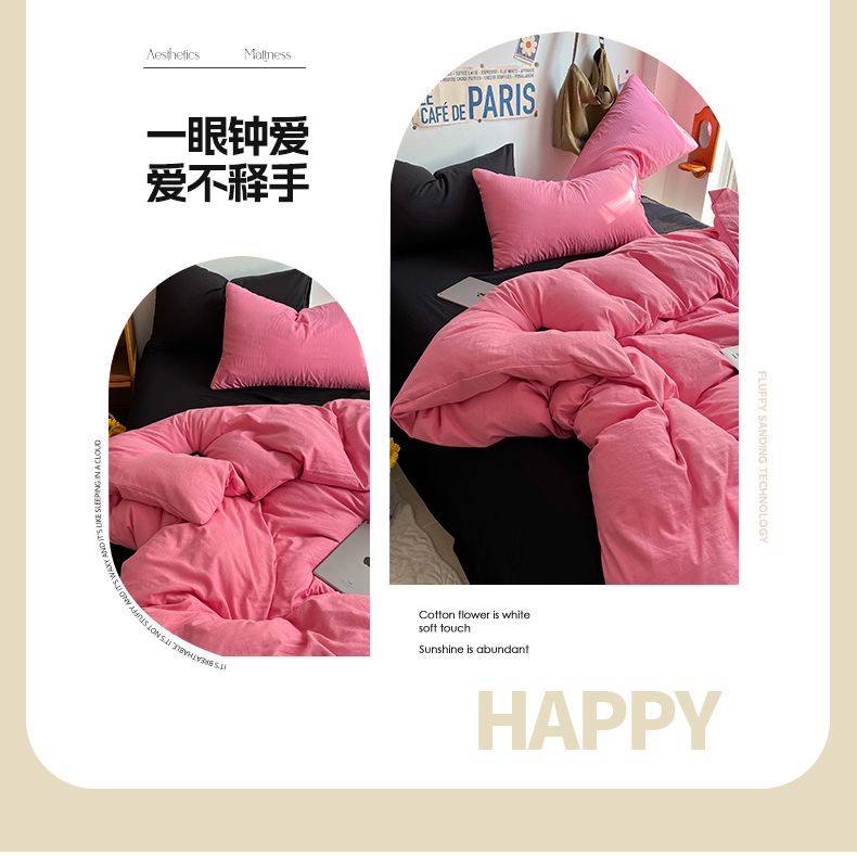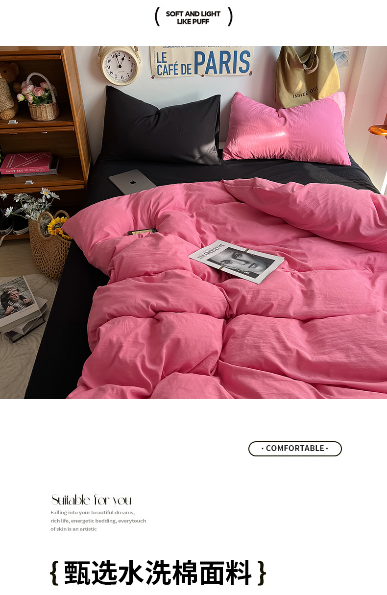当前位置: 91家纺网 > 商品网购 > 床品套件 > 四件套 > 全棉普通四件套 > 易辰美 2024新款混搭超柔水洗棉四件套 玫粉+酷黑