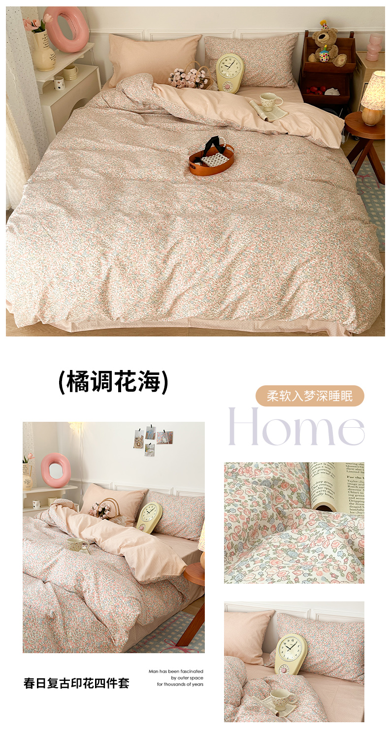 商品名称:昔可家纺 2024新款全棉春日复古印花四件套 橘调花海