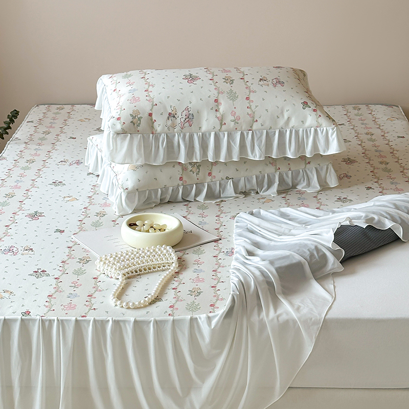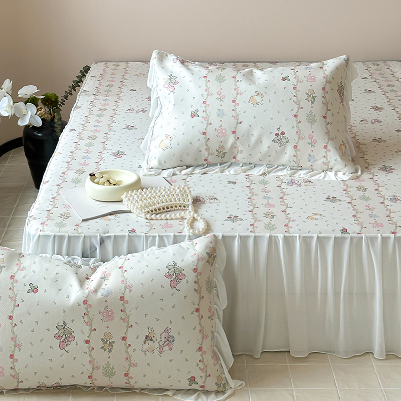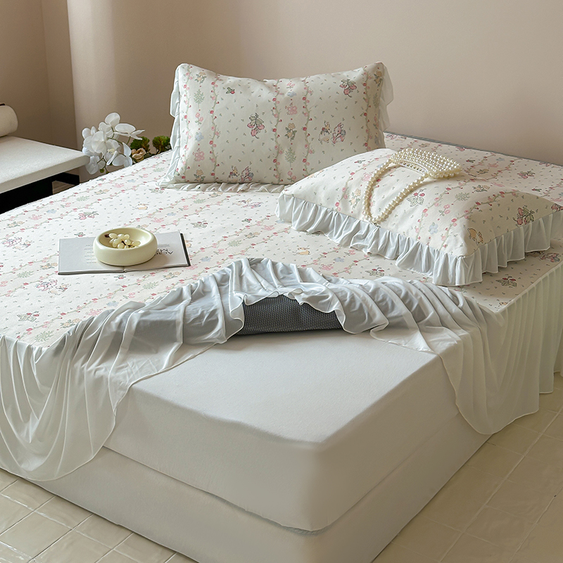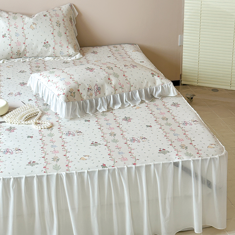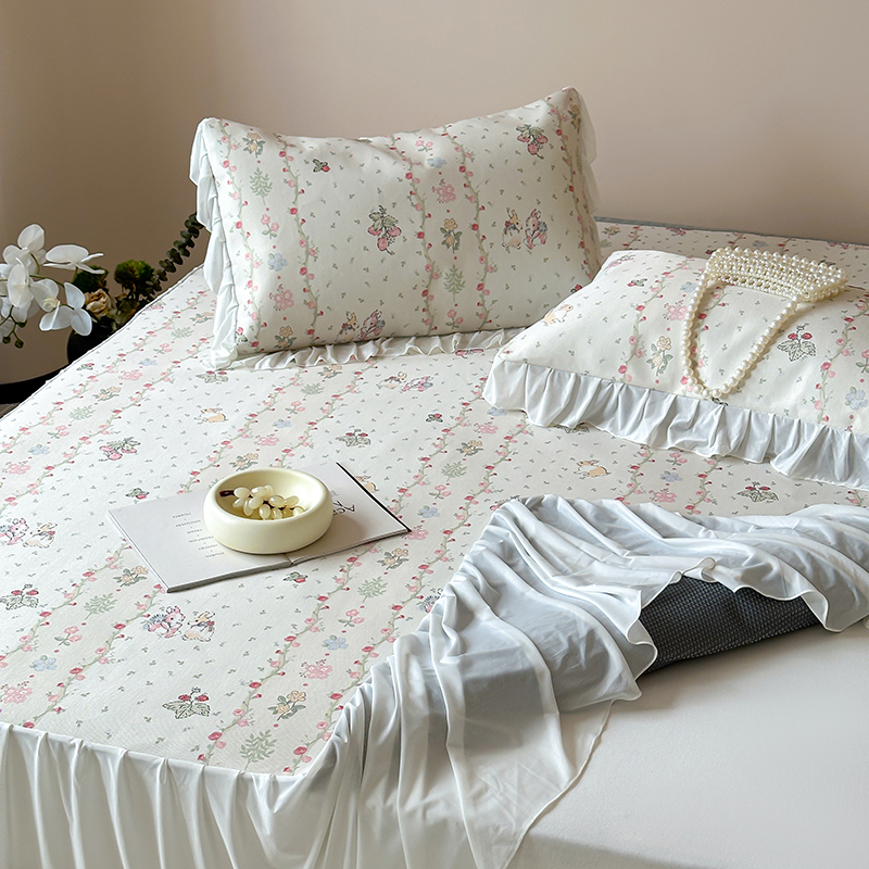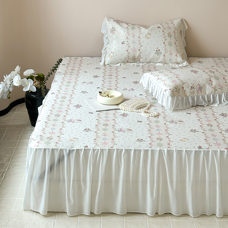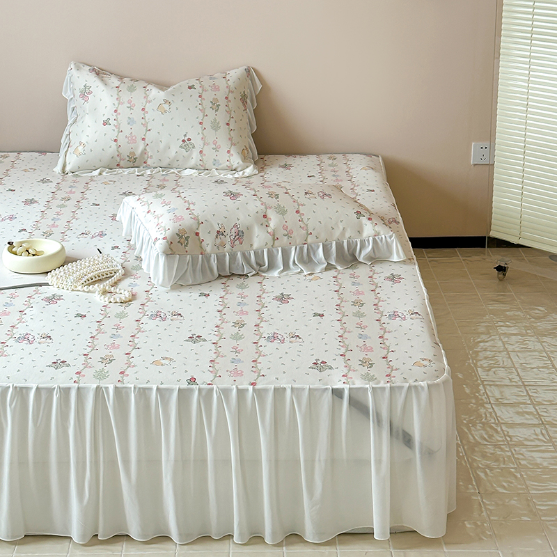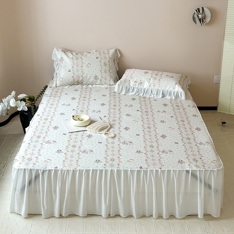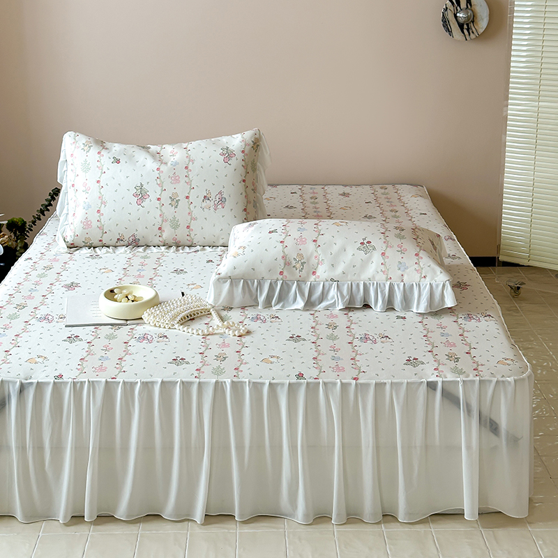 昔可 2024新款A类900D仙仙雪纺纱床裙款冰丝席三件套 花朵小兔