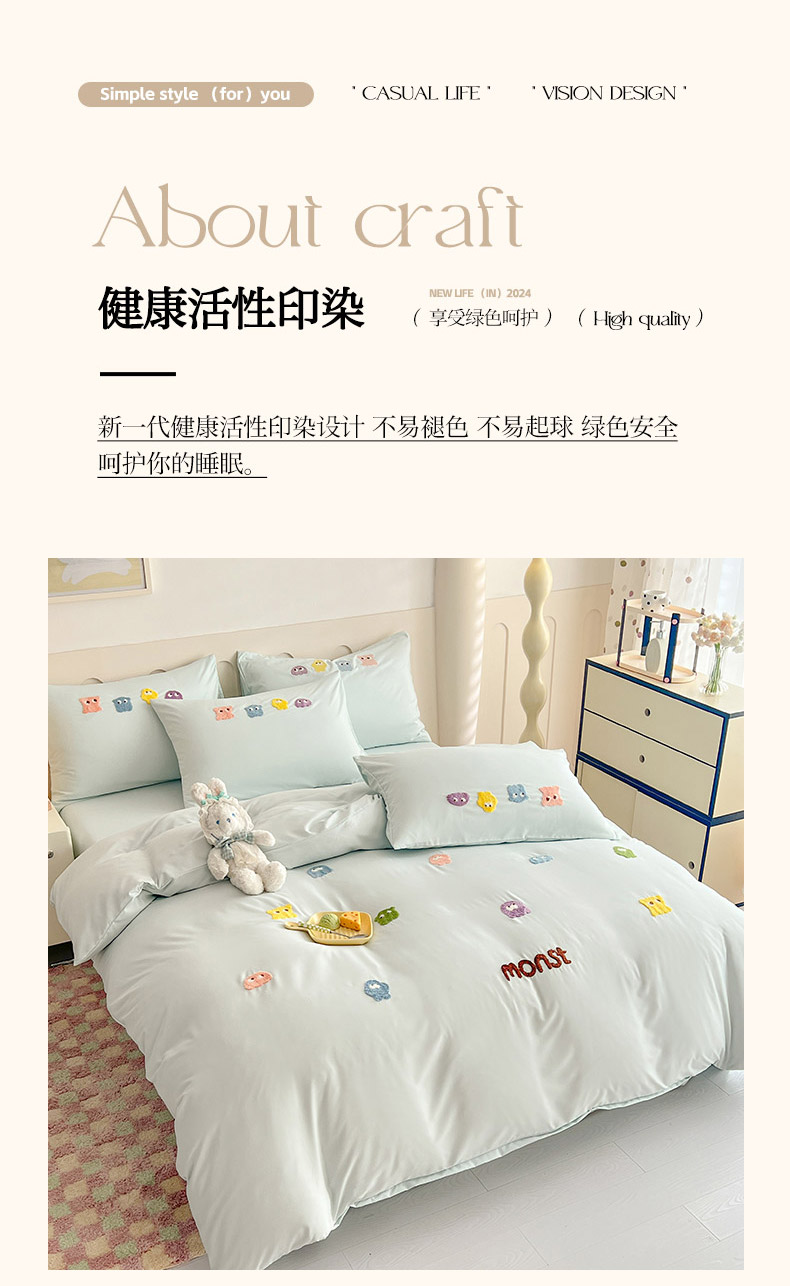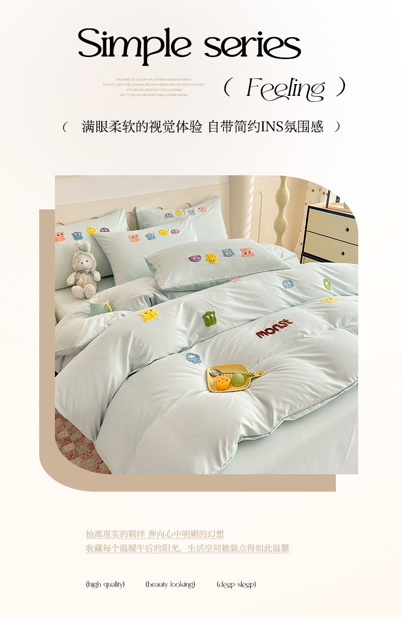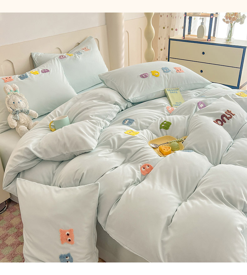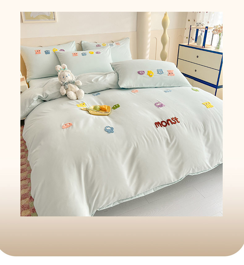 商品名称:妖妖家纺 2024新款超柔云朵棉毛巾绣四件套(小怪兽) 小怪兽-天蓝