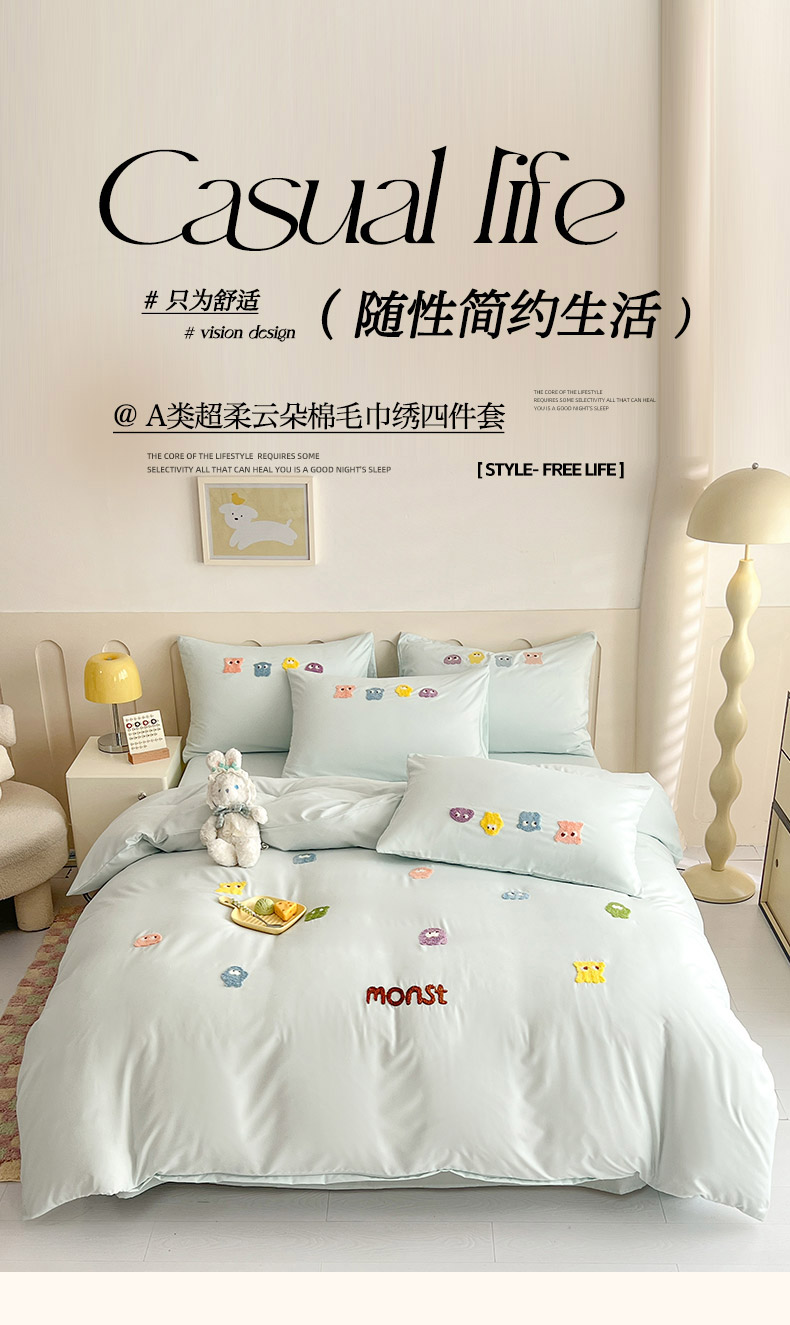 妖妖家纺 2024新款超柔云朵棉毛巾绣四件套(小怪兽) 小怪兽-天蓝