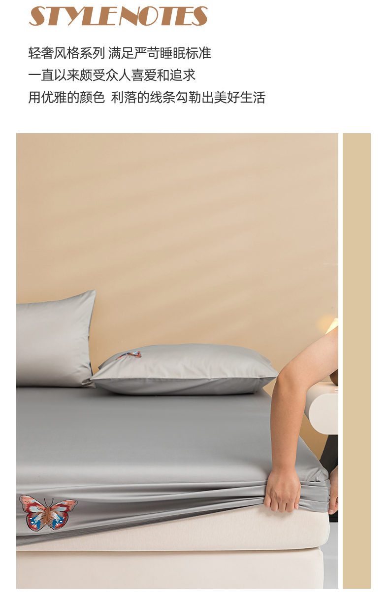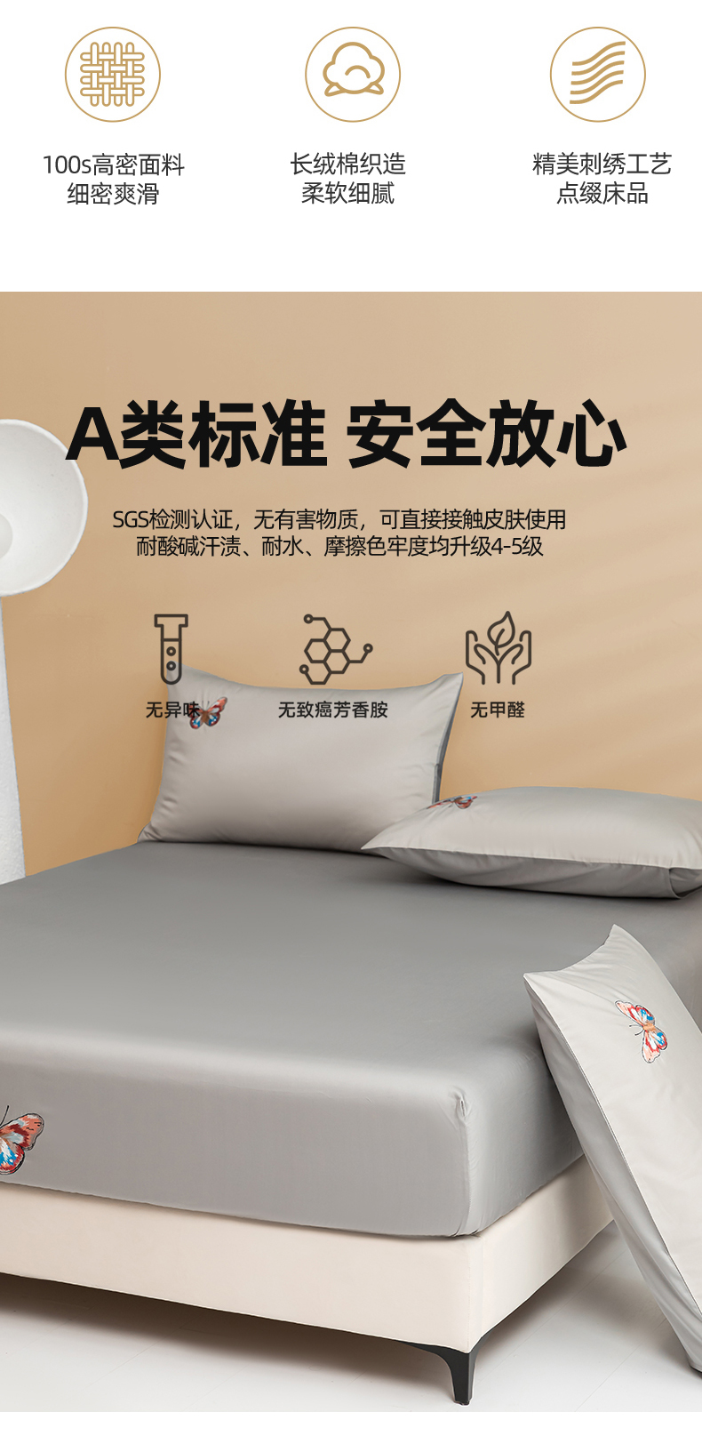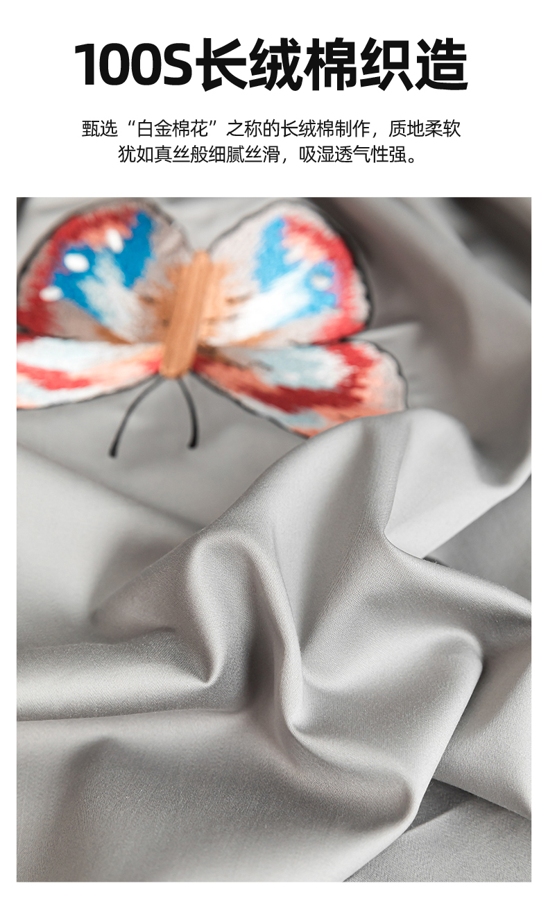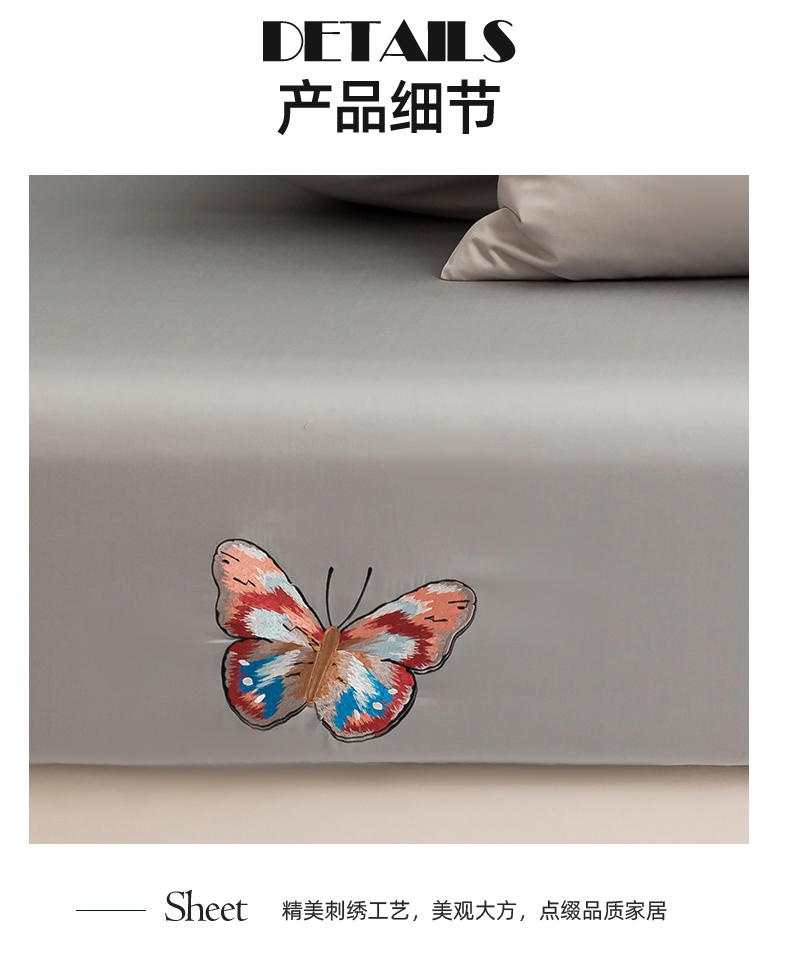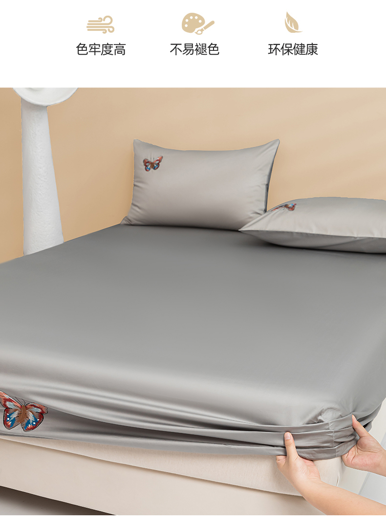 • 91家纺网 家纺一手货源 找家纺 蓝米卡夫 2024新款A类100支全棉刺绣蝶恋系列单床笠三件套 蝶恋100支-月影灰