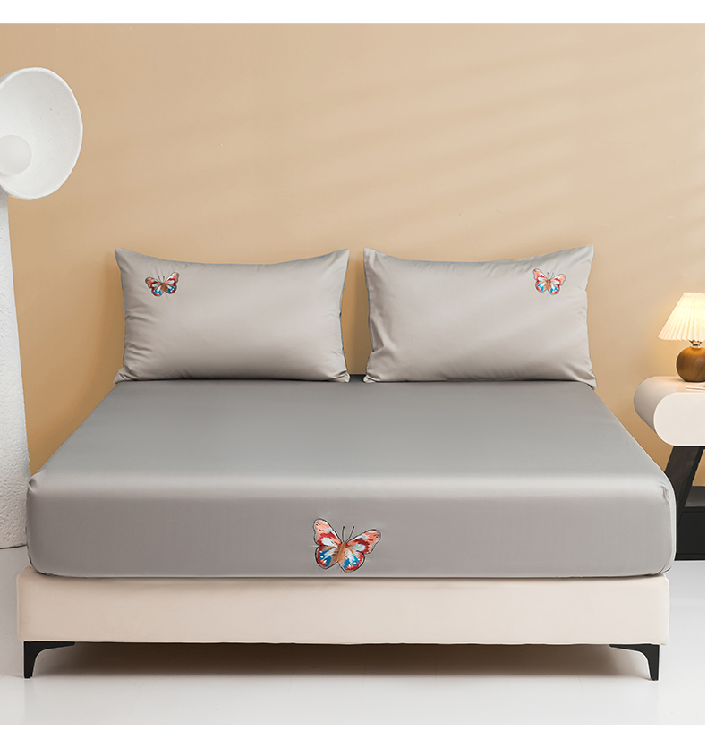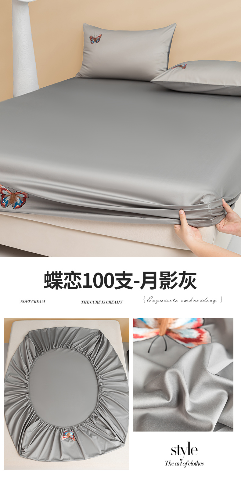 蓝米卡夫 2024新款A类100支全棉刺绣蝶恋系列单床笠三件套 蝶恋100支-月影灰
