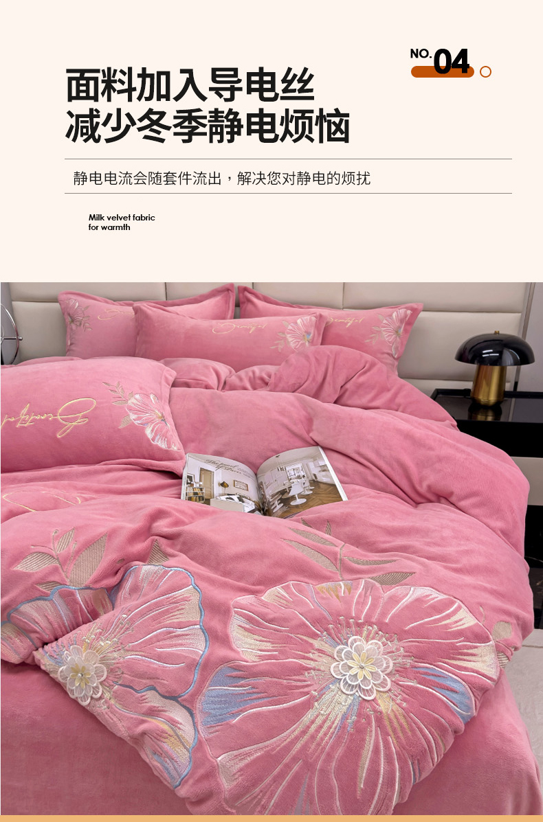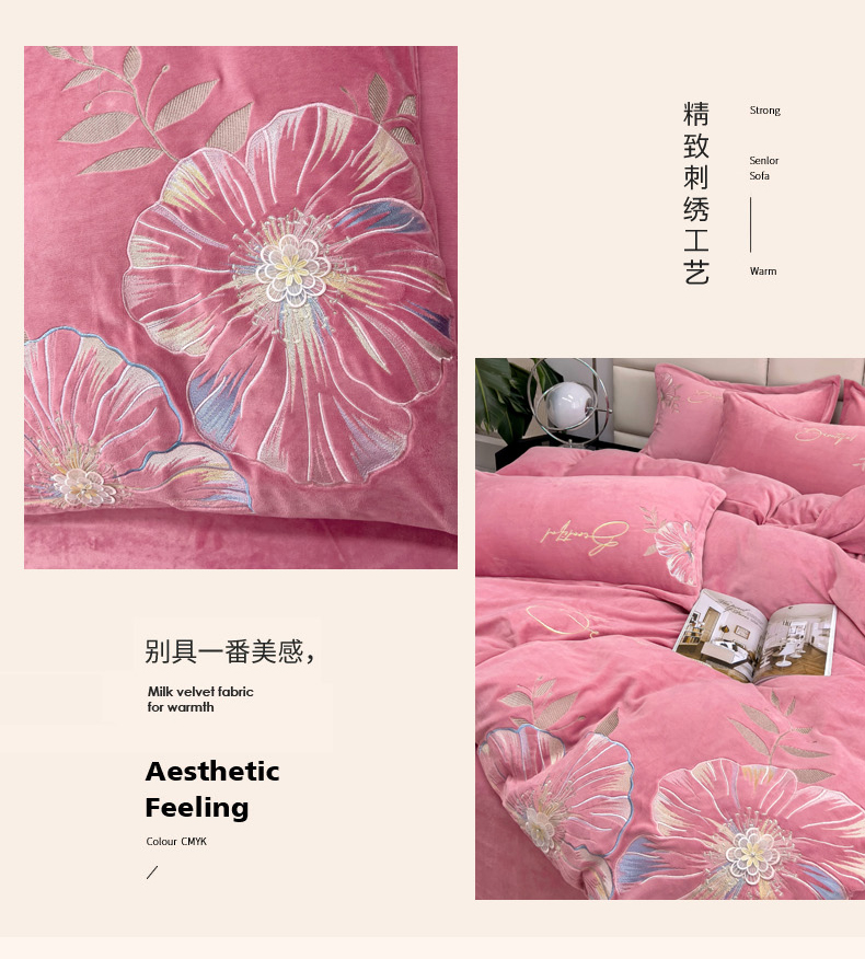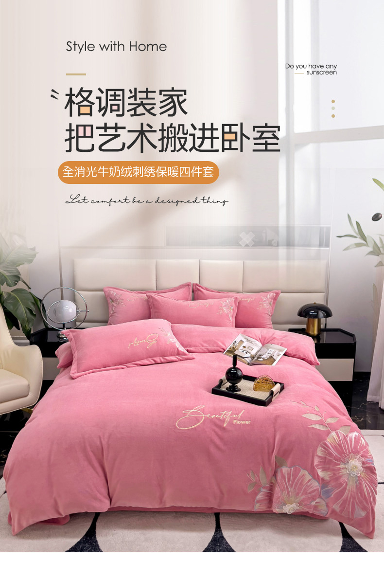 星尚家纺 2024新款全消光230g牛奶绒刺绣保暖四件套-花漾 豆沙粉